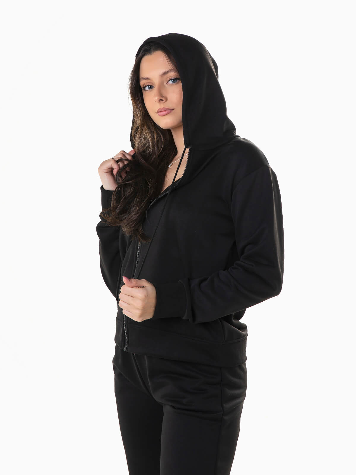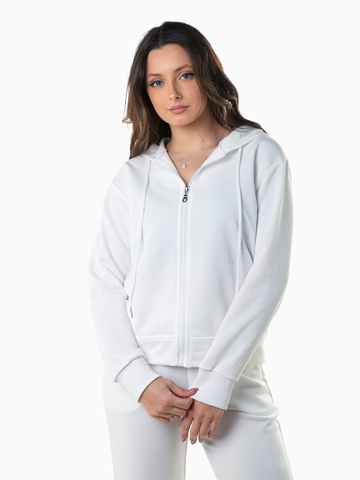 Casaco fato de treino em tecido de poliamida para maior resistência e conforto. Casaco com capuz e cordão para ajustar. 2 bolsos. Aperto fecho zíper.