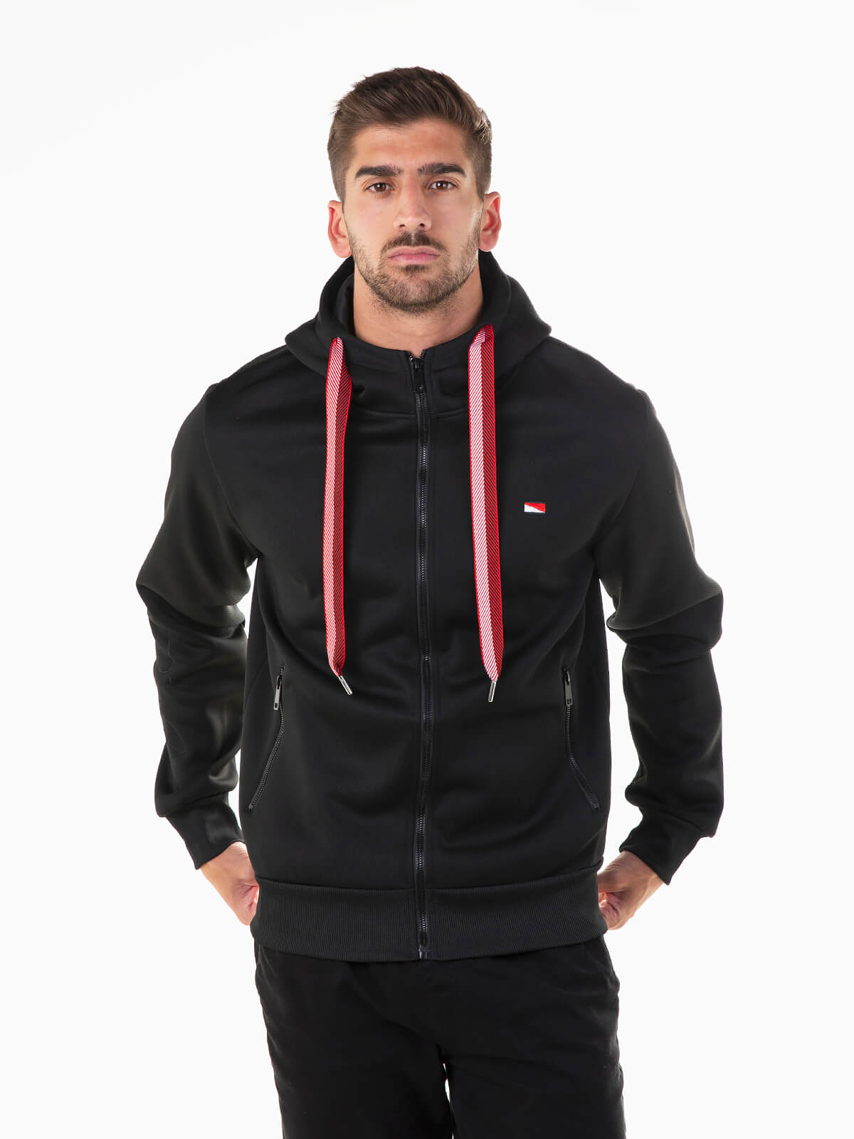 Casaco fato treino com pormenores bordados. Casaco hoodie de manga comprida com cordão bicolor para ajustar. 2 bolsos. Interior cardado. Aperto fecho zíper.