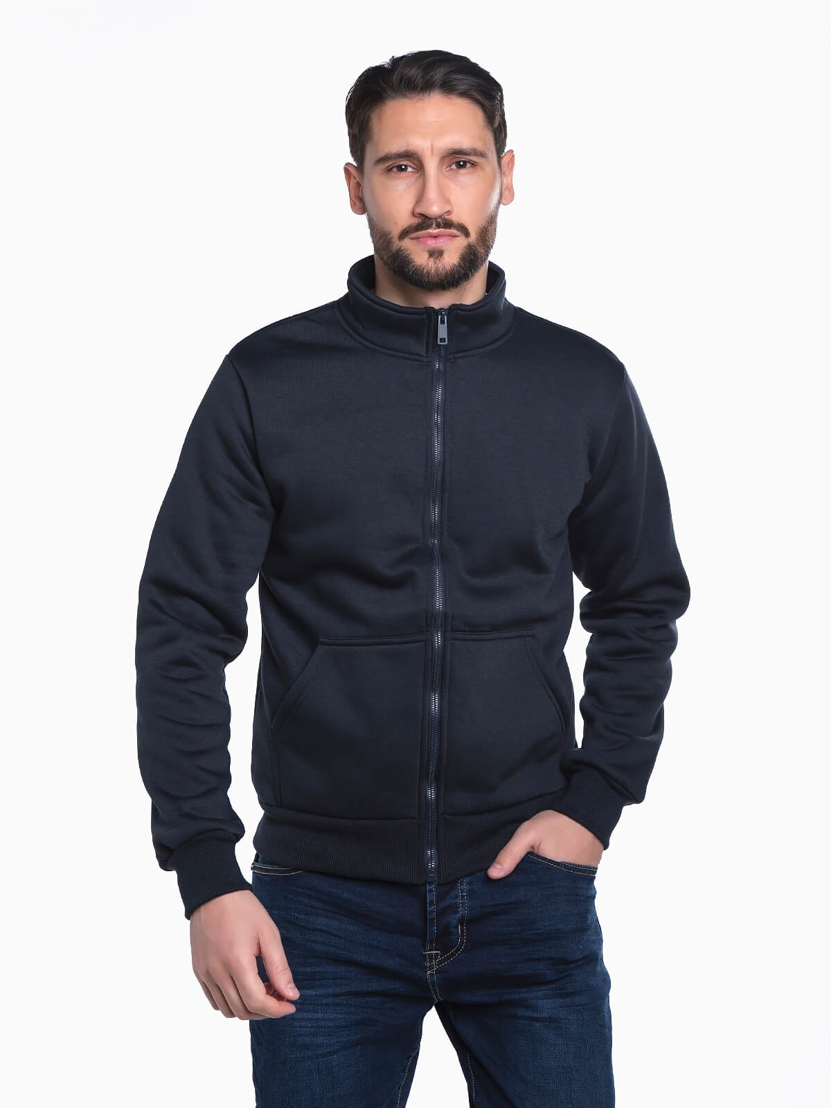 Casaco em felpa com gola subida para homem. Casaco desportivo manga comprida com interior polar. Bolso canguru e acabamentos elásticos. Aperto de fecho zíper.