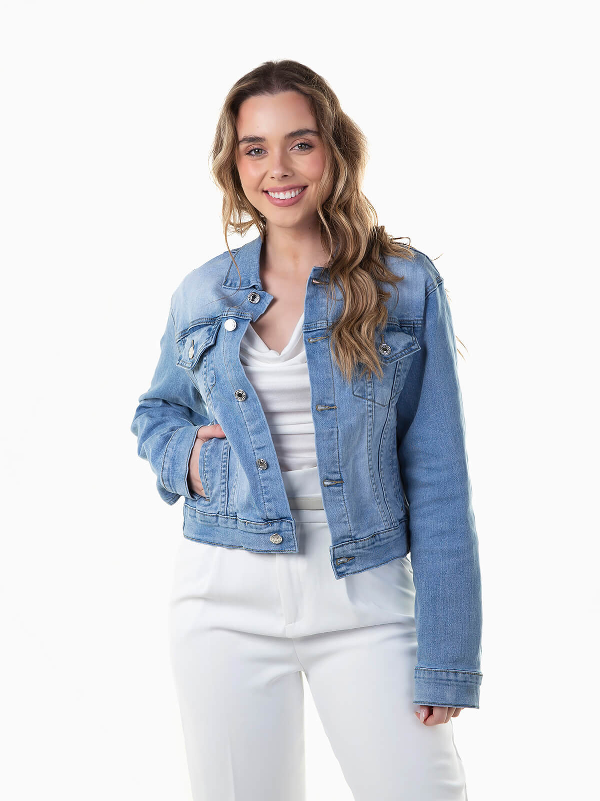 Casaco de ganga com lavagem azul claro para senhora. Casaco manga comprida com punhos abotoados. Gola abas. 4 bolsos. Aperto de botões.