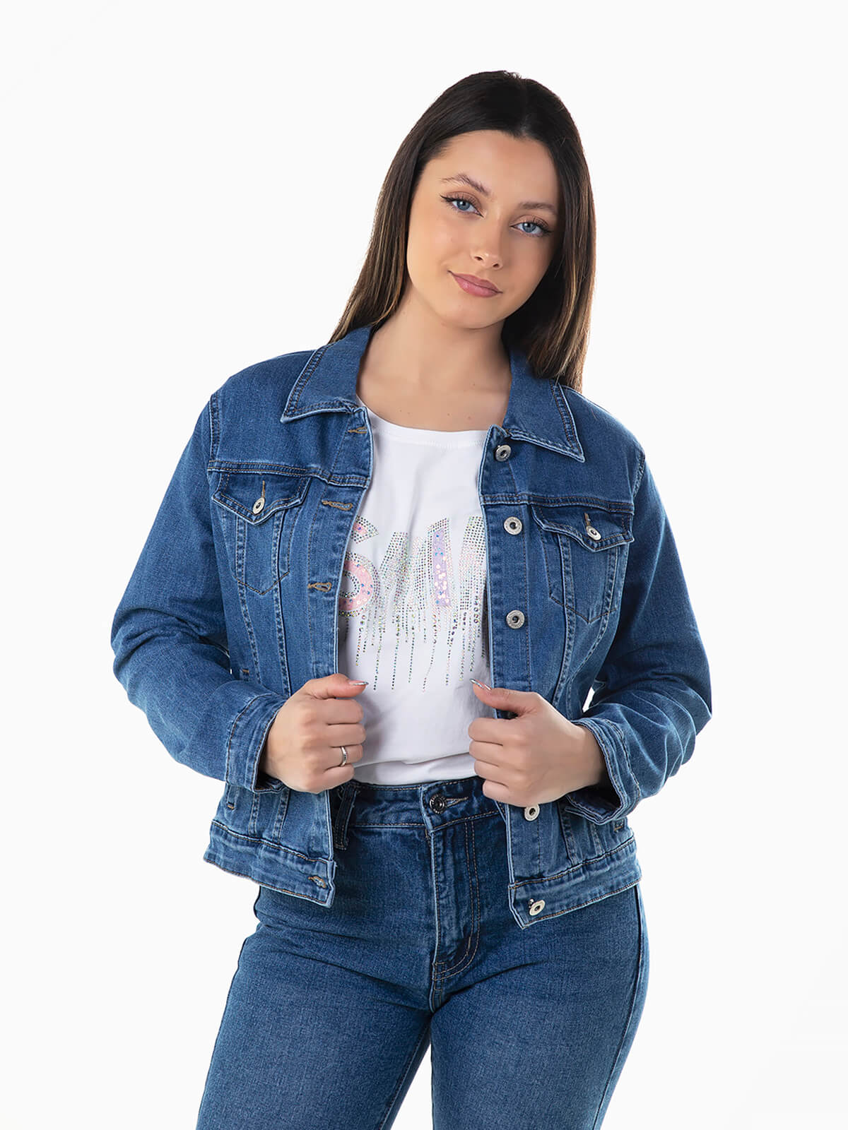 Casaco de ganga com lavagem azul escuro para senhora. Blusão manga comprida com punhos abotoados. Gola abas. 2 bolsos no peito. Aperto de botões.