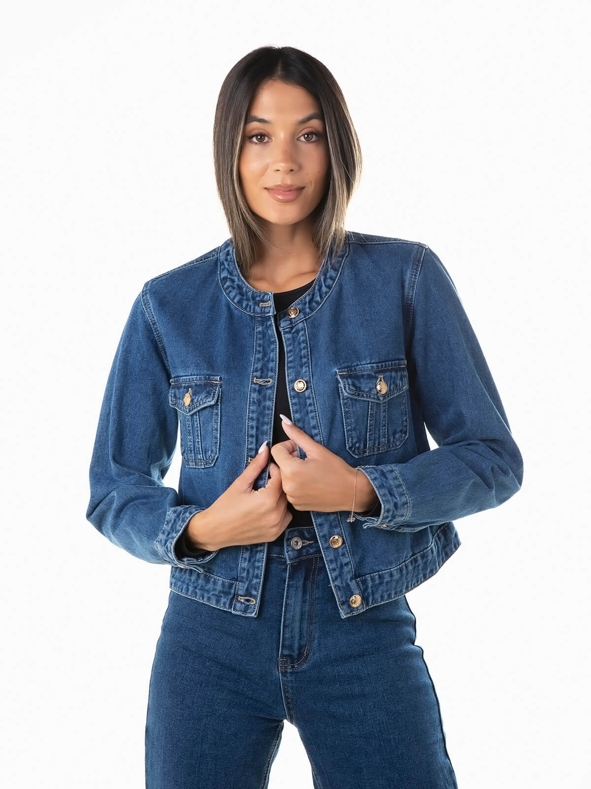 Casaco de ganga com lavagem azul escuro e decote redondo. Casaco manga comprida com punhos abotoados. 2 bolsos no peito. Aperto de botões dourados.