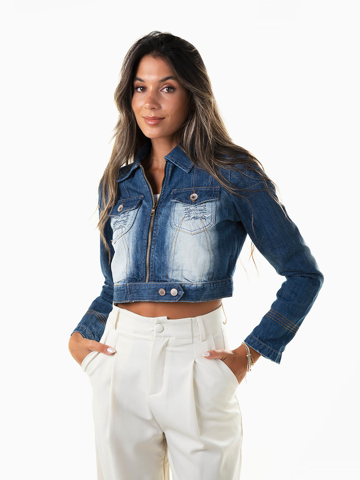 Casaco de ganga curto com efeito lavado e leves rasgos para senhora. Blusão denim manga comprida com punhos abotoados. Gola abas. Costuras reforçadas nos ombros. 2 bolsos. Aperto de fecho zíper e fivela.