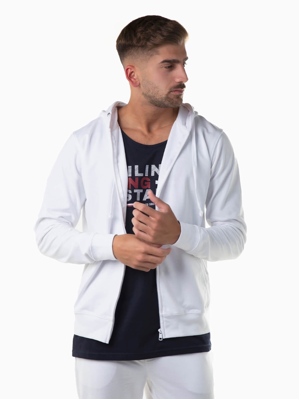Casaco hoodie com aperto de fecho zíper. Casaco fato de treino para homem com manga comprida e extremidades elásticas. Cordão no capuz para ajustar. Bolso canguru.