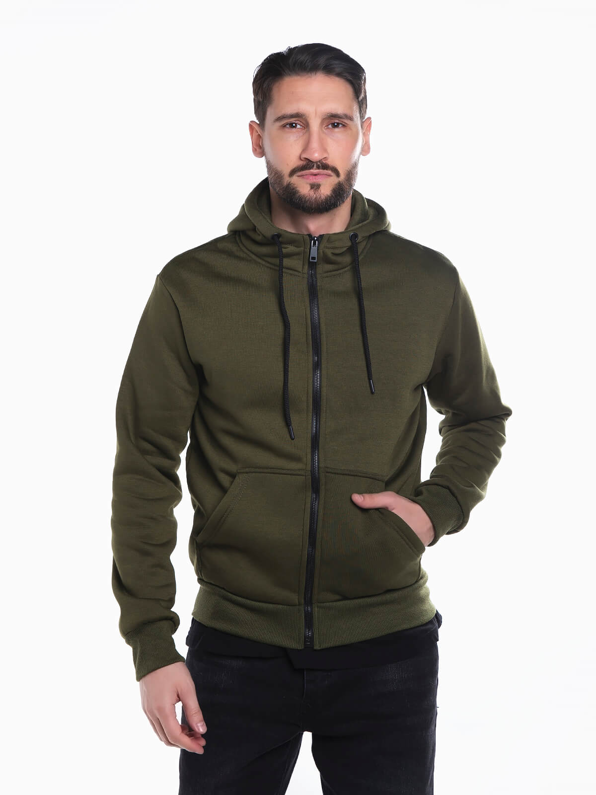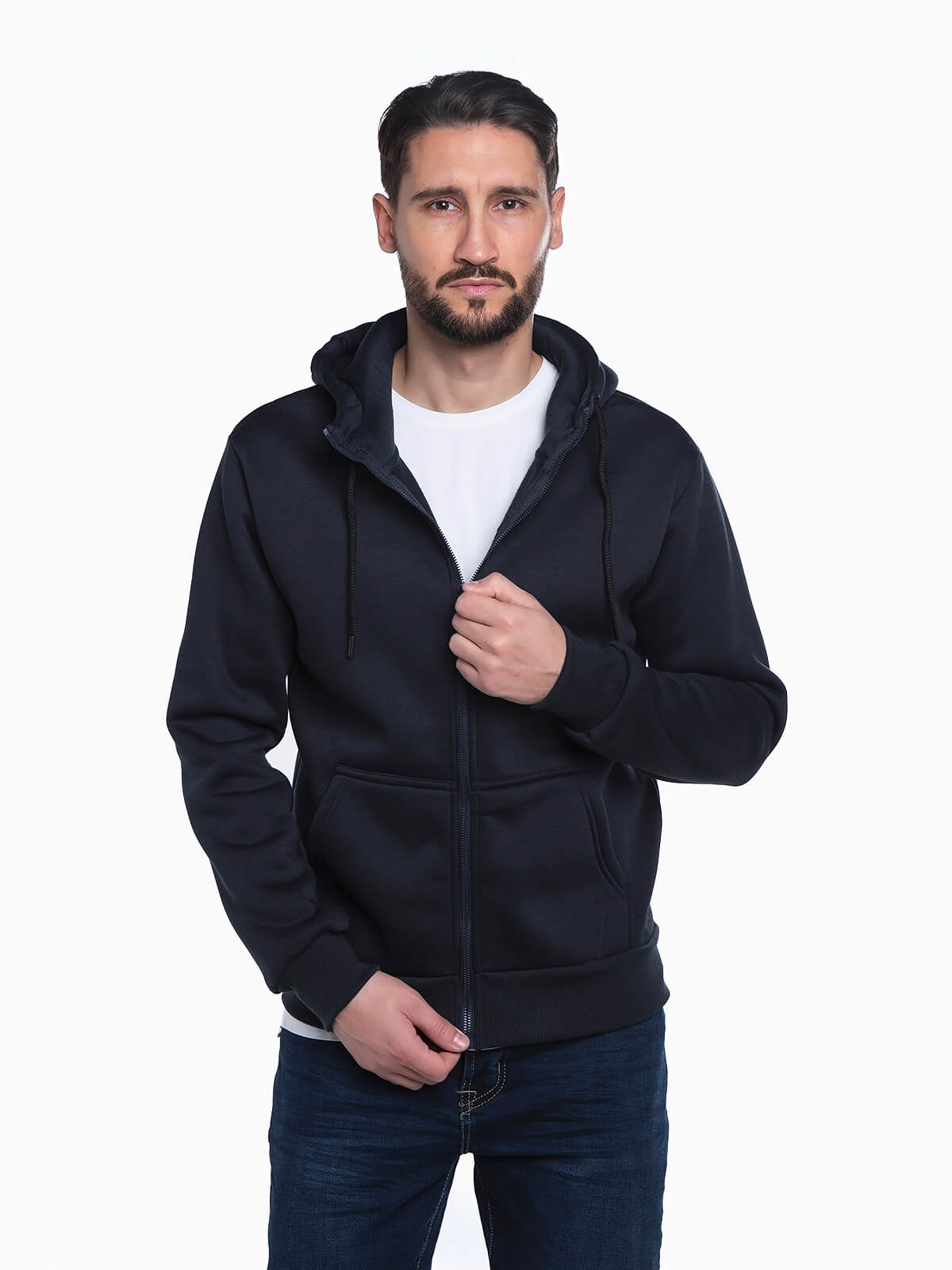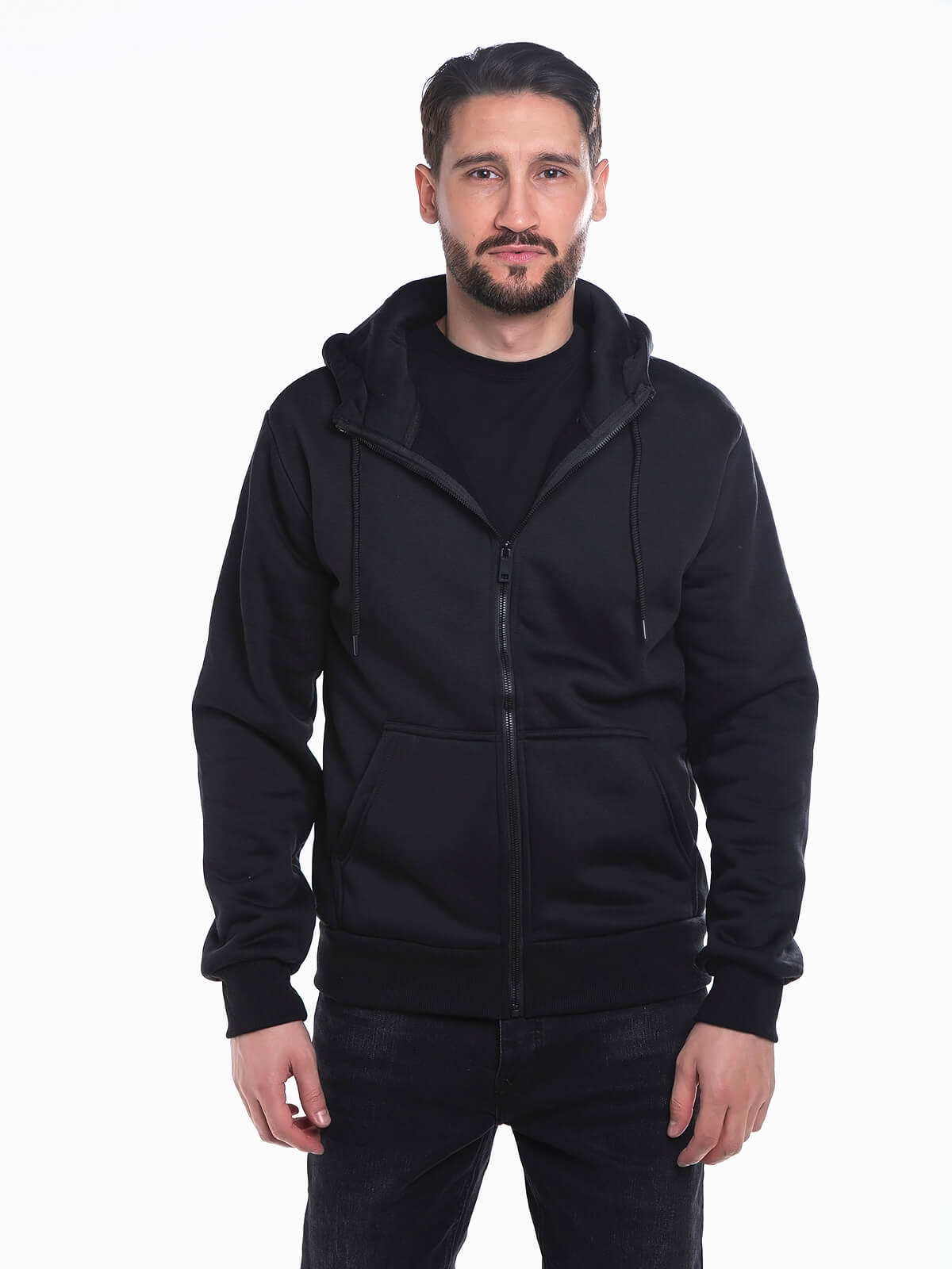 Casaco hoodie em felpa para homem. Casaco desportivo com cordão para ajustar. Manga comprida e interior polar. Bolso canguru. Aperto de fecho zíper.