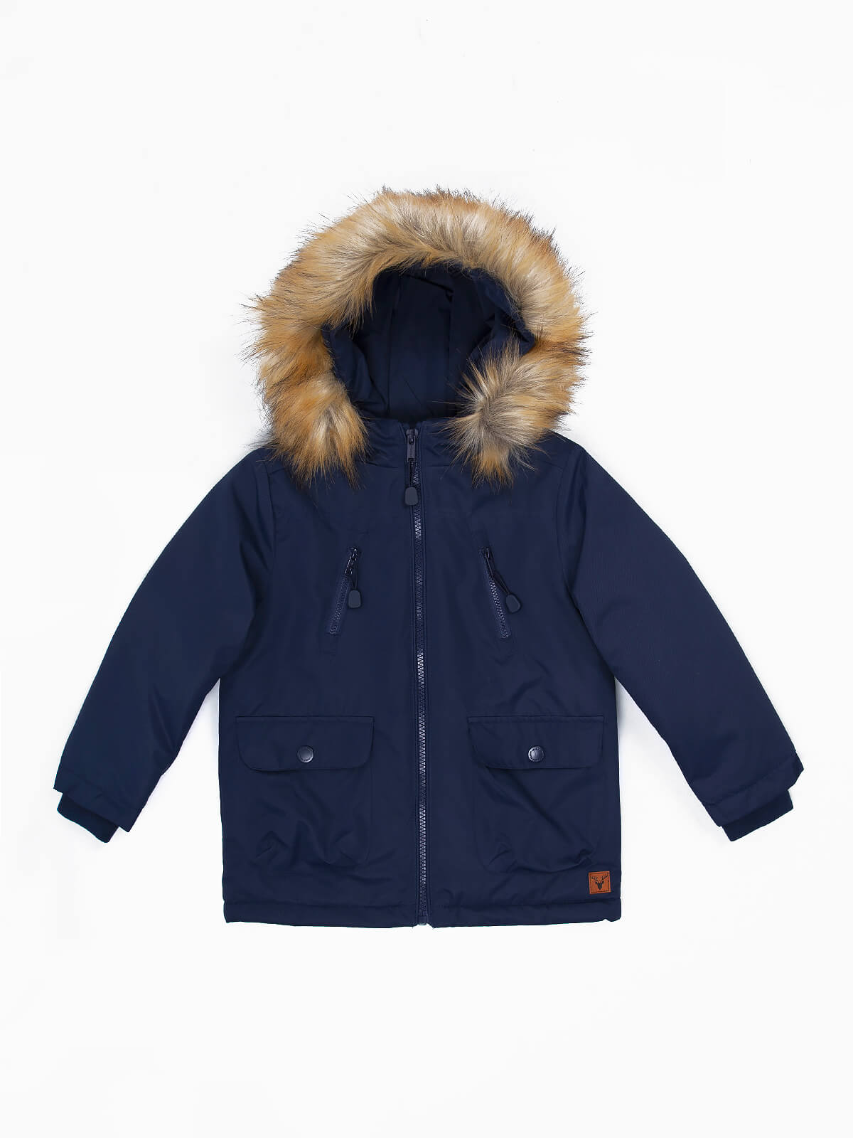 Casaco impermeável azul marinho com capuz para menino. Casaco com forro e manga comprida. Punhos elásticos. 2 bolsos. Capuz com pelo removível. Aperto de fecho zíper.