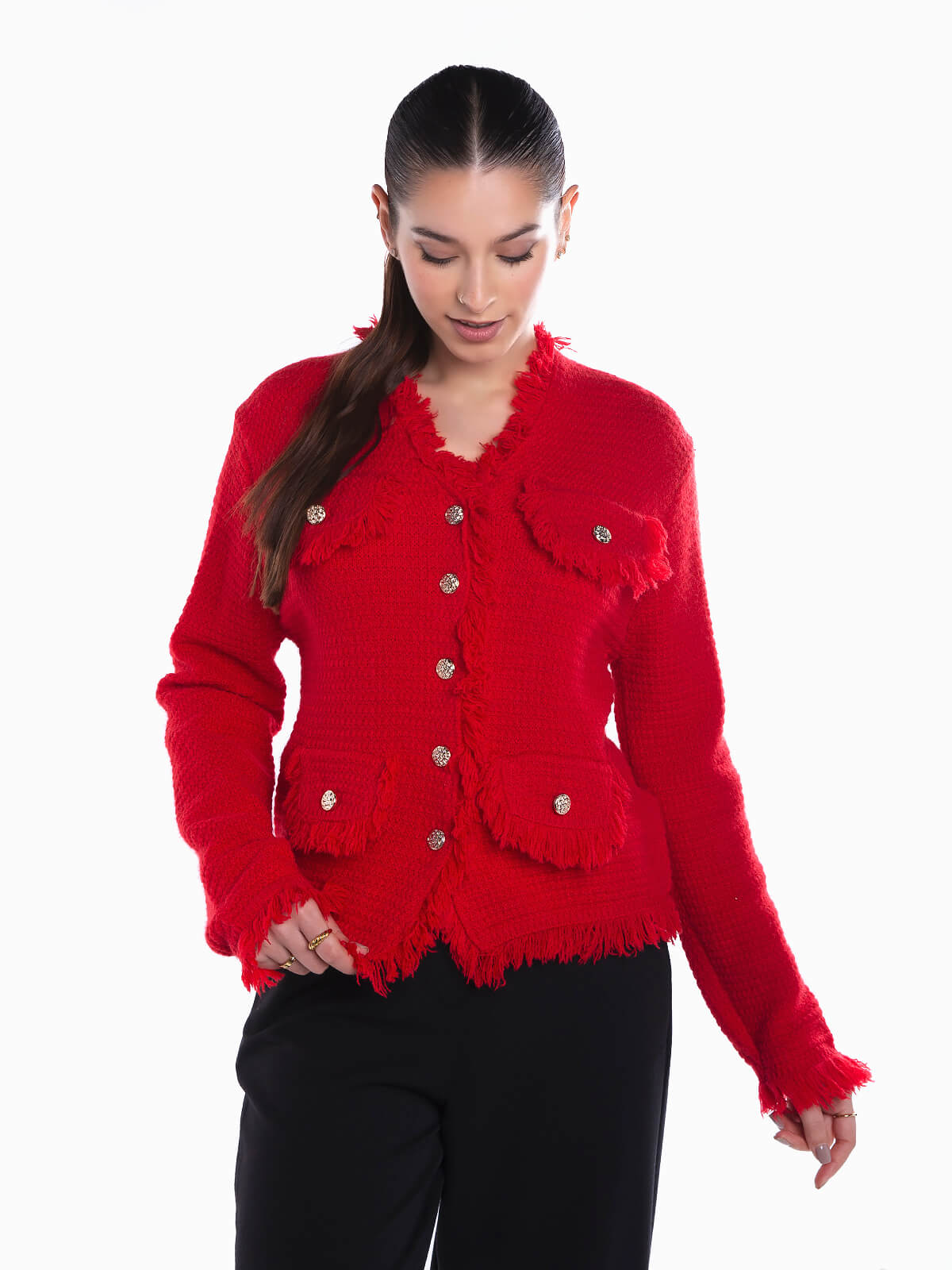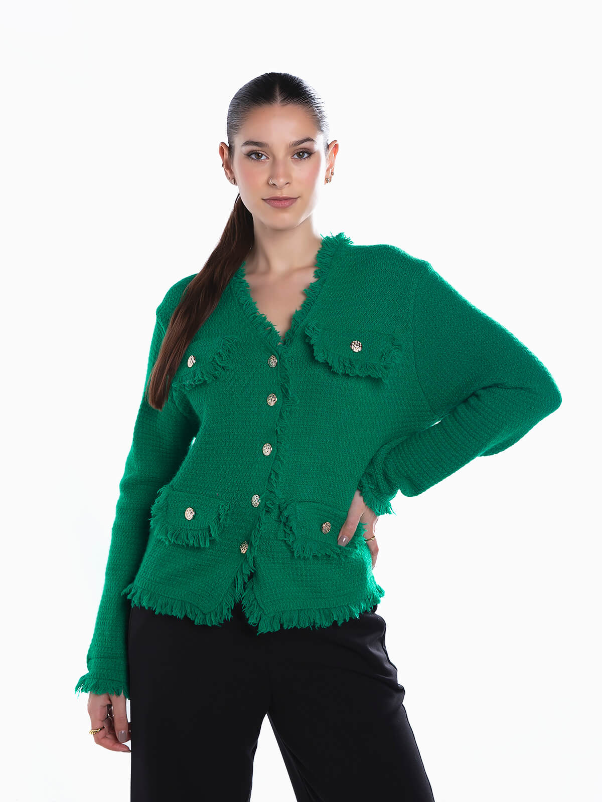 Casaco de malha com acabamentos desfiados. Cardigan em malha com textura. Palas decorativas. Decote em V. Aperto frontal de botões.