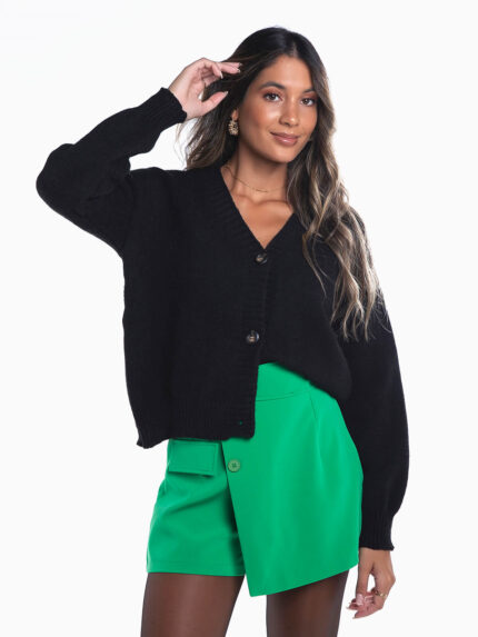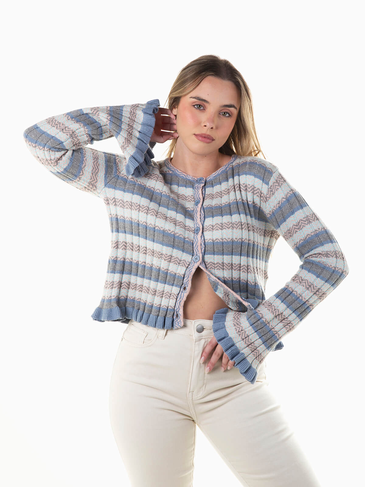 Casaco malha jacquard azul com mistura de lã para maior conforto térmico. Cardigan canelado com manga comprida boca de sino e decote redondo. Aperto frontal de botões.