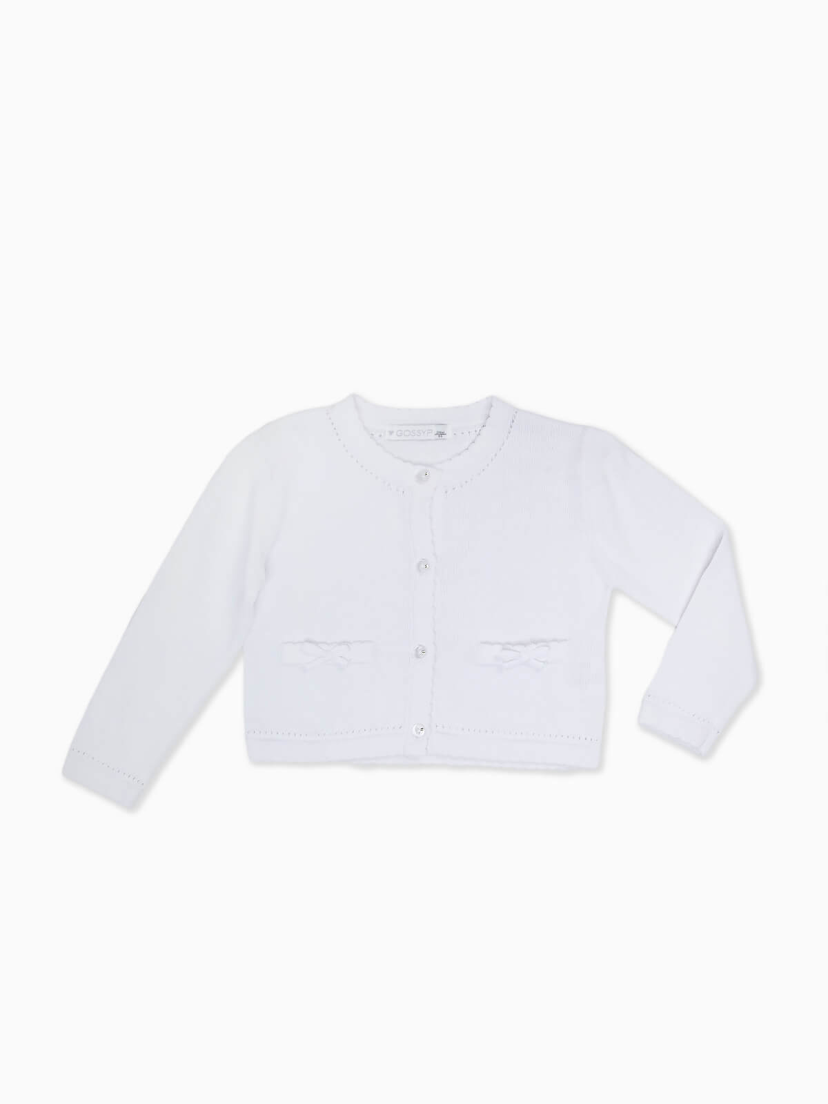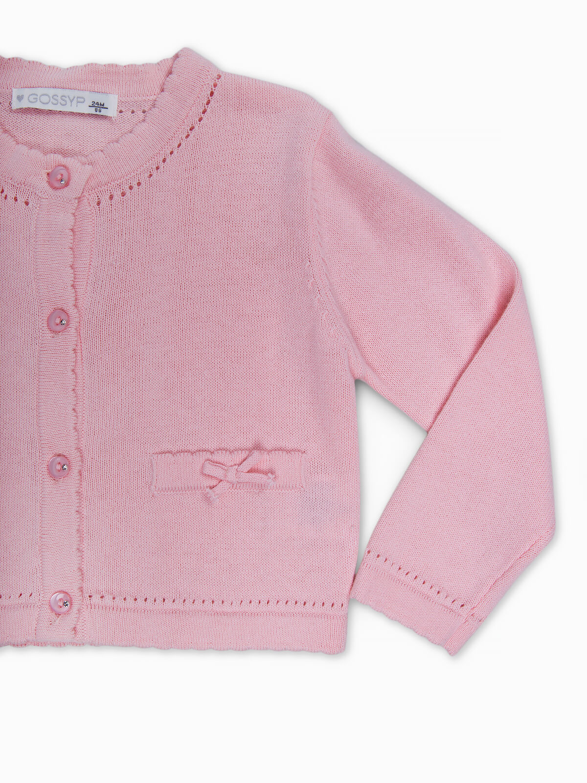 Casaco de malha para bebé menina. Casaco de gola redonda com efeito de 2 bolsos na frente. Laços aplicados. Manga comprida. Aperto de botões.
