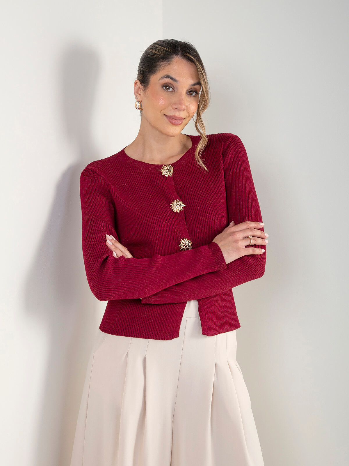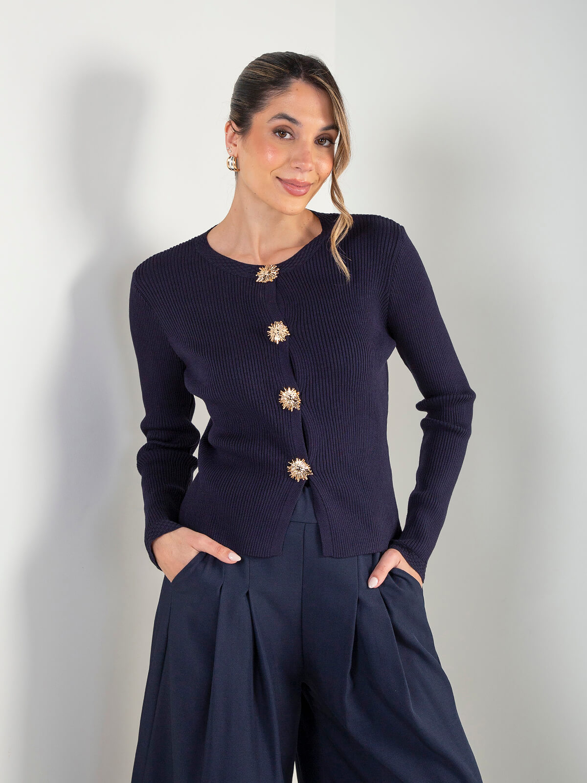 Casaco de malha canelada para senhora, com botões decorativos estilo jóia e corte clássico. Um modelo elegante e versátil, ideal para looks mais cuidados, do trabalho ao dia a dia.