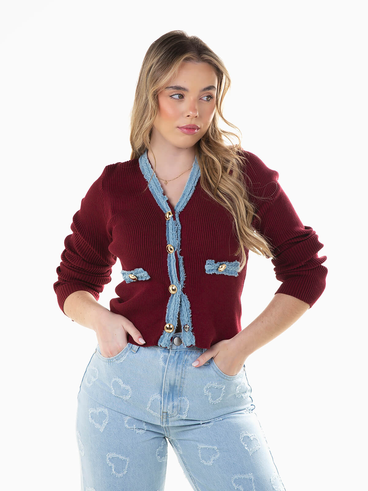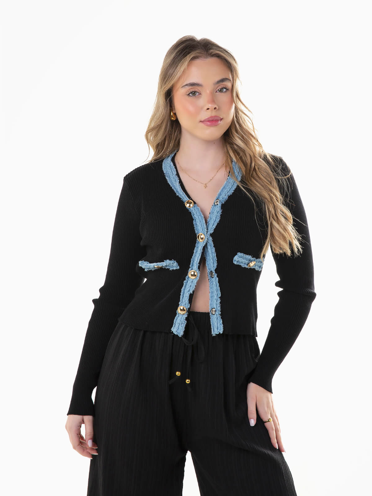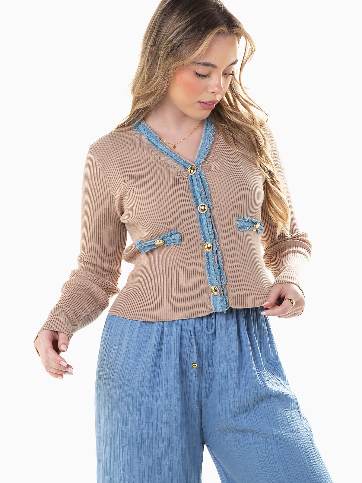 Casaco de malha canelada combinado com ganga nas extremidades. Casaco justo de manga comprida com decote em V e aperto de botões de pressão.