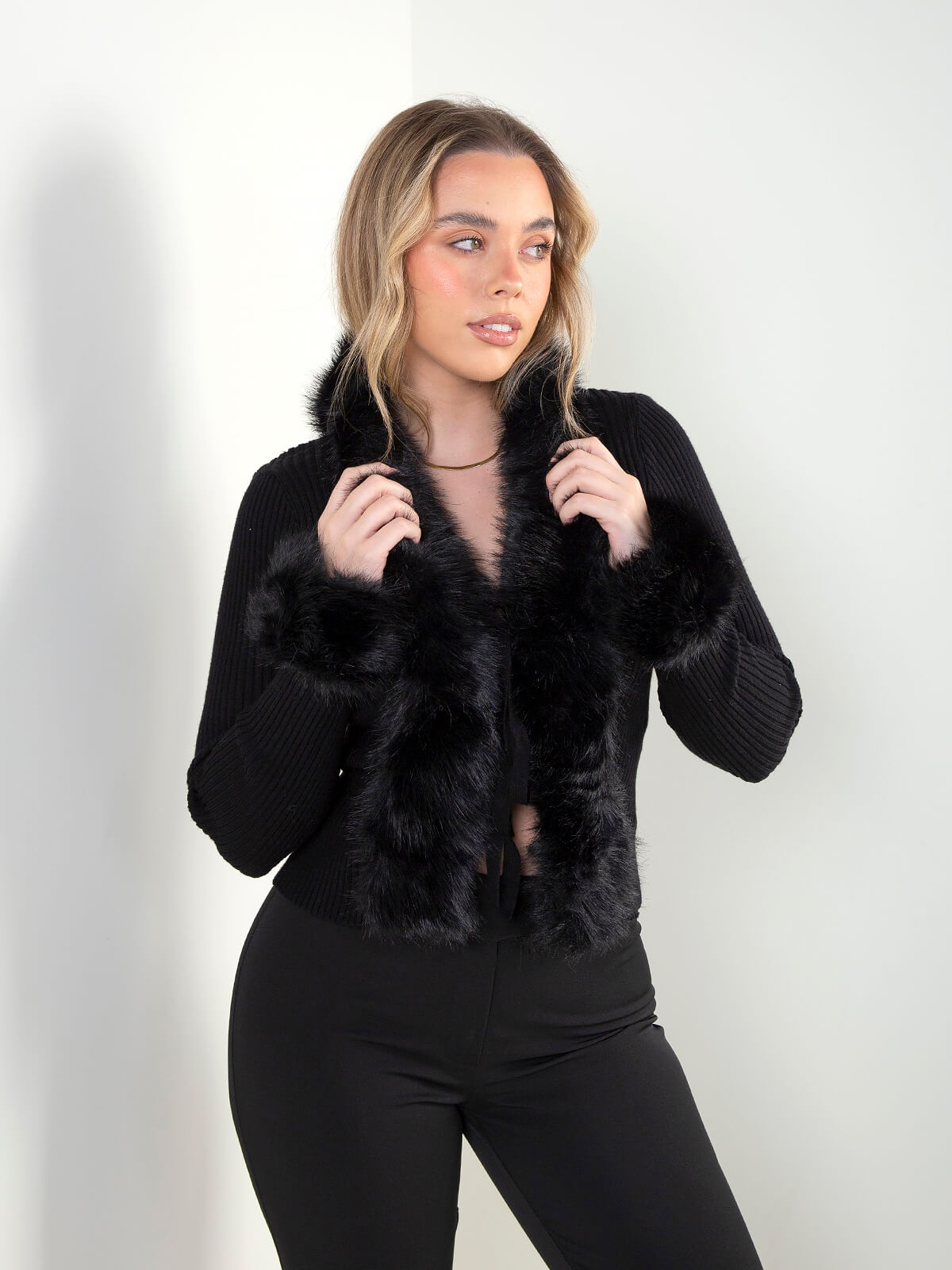 Casaco malha canelada com pelo nas extremidades. Cardigan justo de manga comprida com cordão para ajustar.