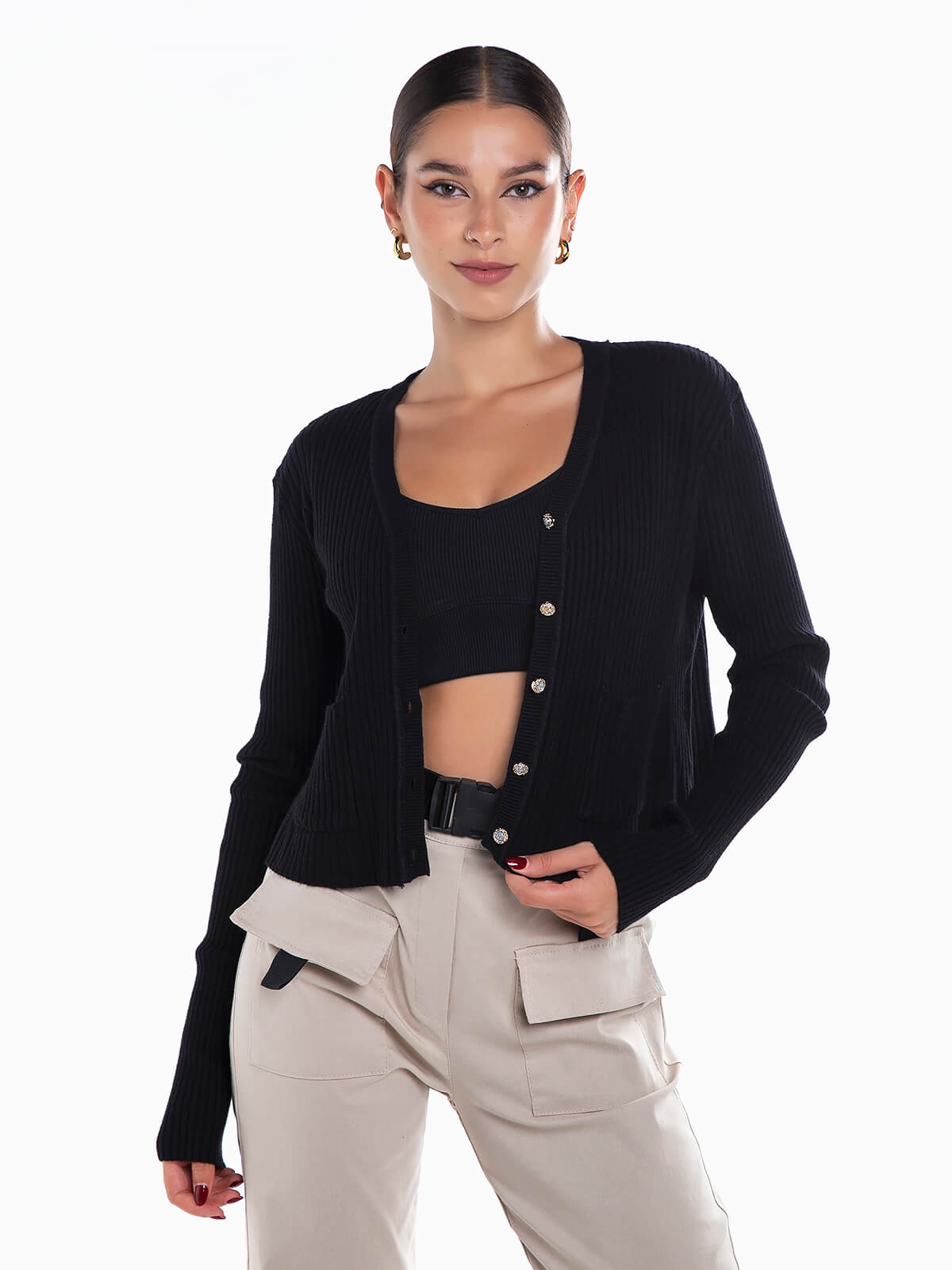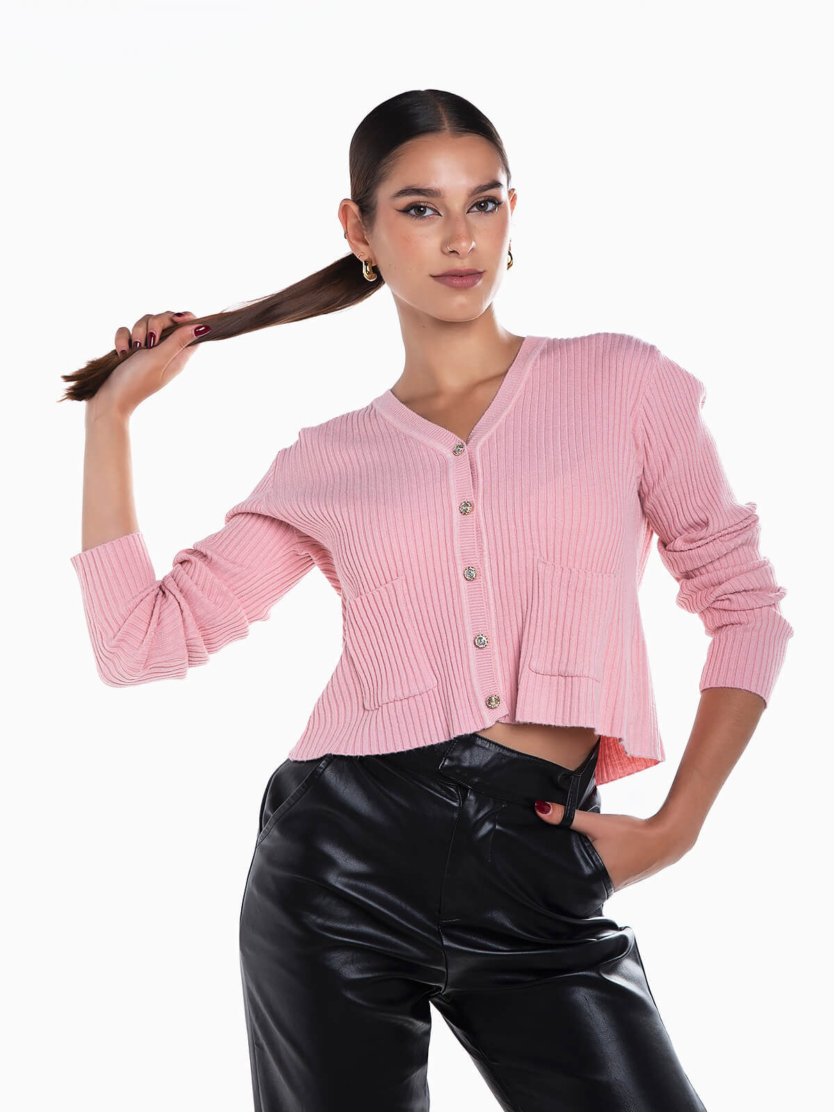 Casaco malha canelada com decote em V. Cardigan manga comprida com 2 bolsos quadrados. Aperto frontal de botões jóia.