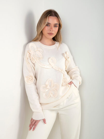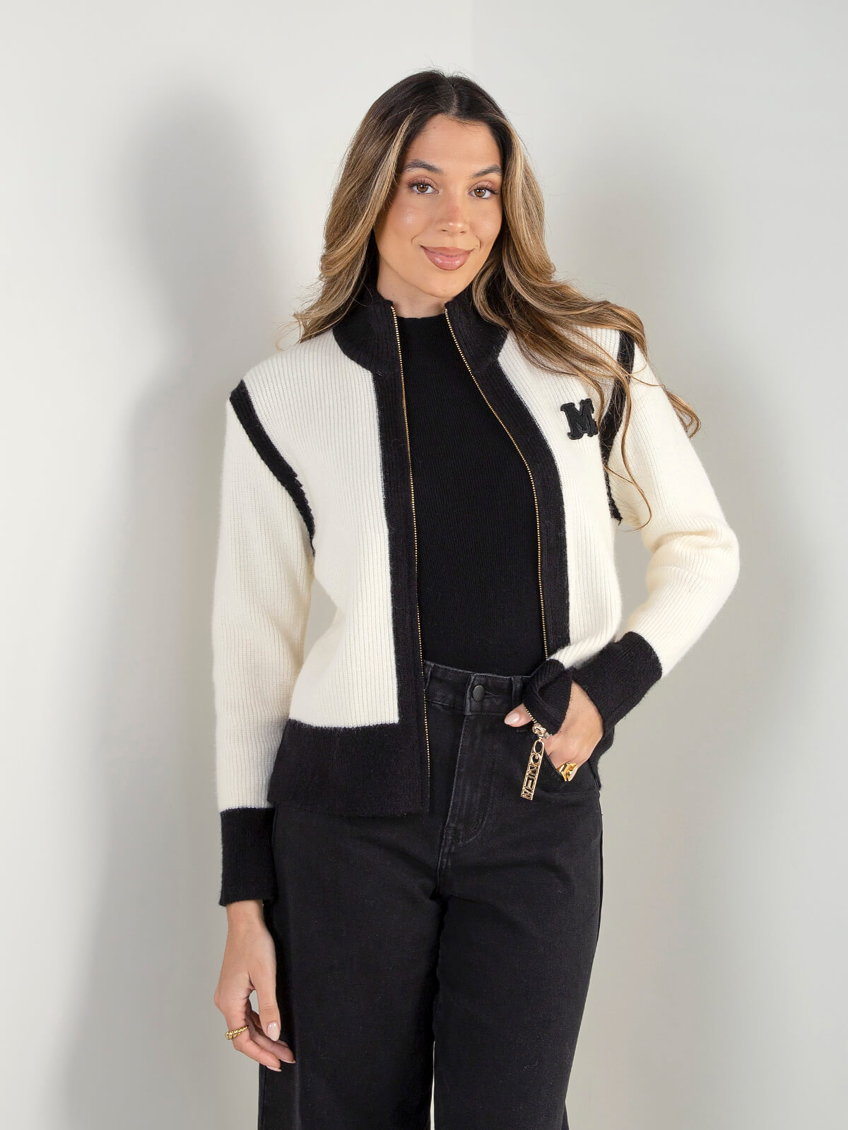 Casaco de malha pérola com gola subida, fecho de correr frontal e detalhe em contraste. Modelo de manga comprida, em malha estruturada, ideal para looks confortáveis e atuais.