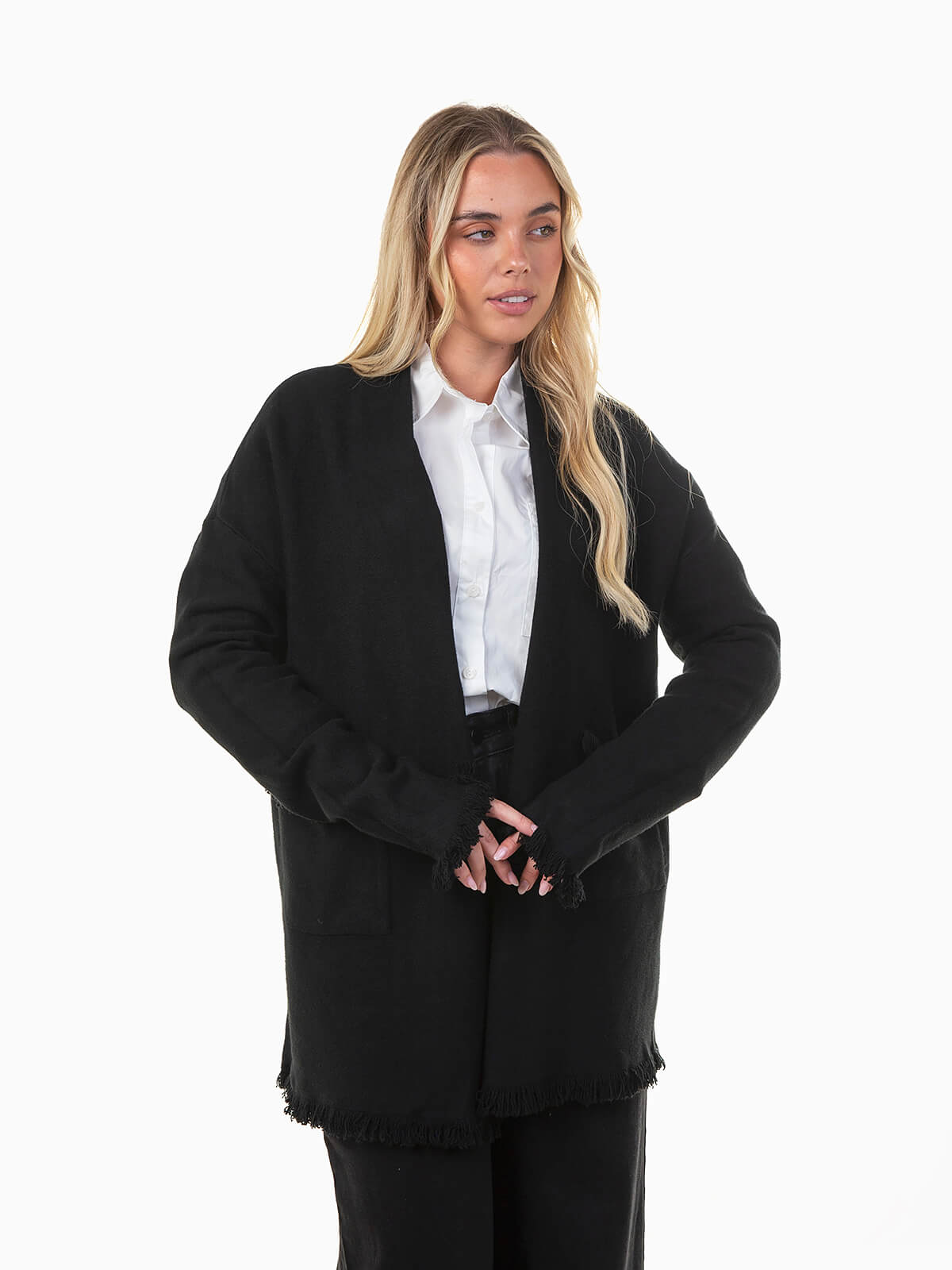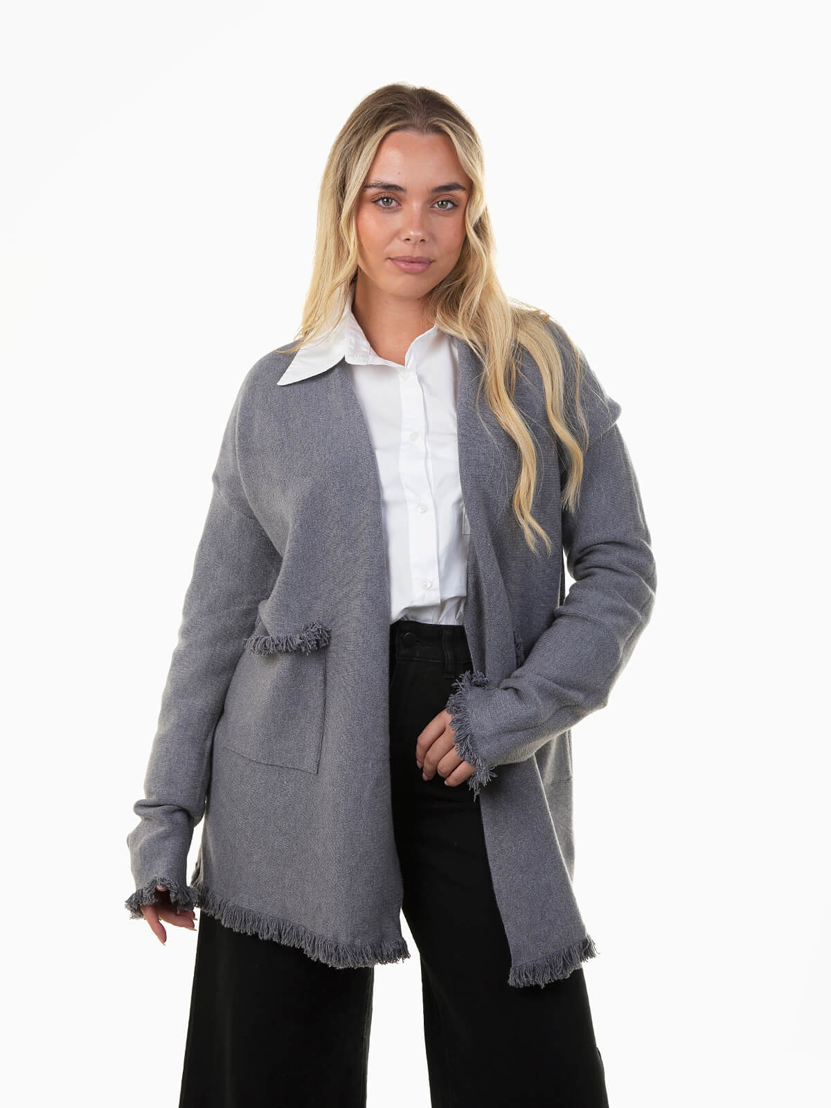 Casaco comprido em malha, aberto à frente, com um toque descontraído graças aos acabamentos desfiados. Com mangas compridas e dois bolsos quadrados, é a peça perfeita para sobreposições confortáveis e cheias de estilo. Ideal para looks casuais ou para dar um upgrade a conjuntos simples.