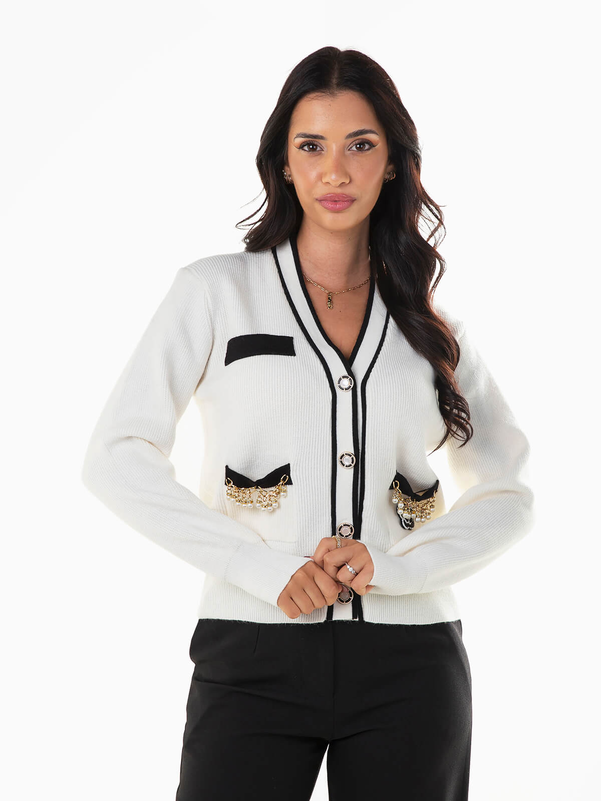 Casaco de malha com aplicações de pérolas, correntes e missangas em forma de flor. Casaco de manga comprida para mulher com decote em V e dois bolsos à frente. Aperto frontal de botões.