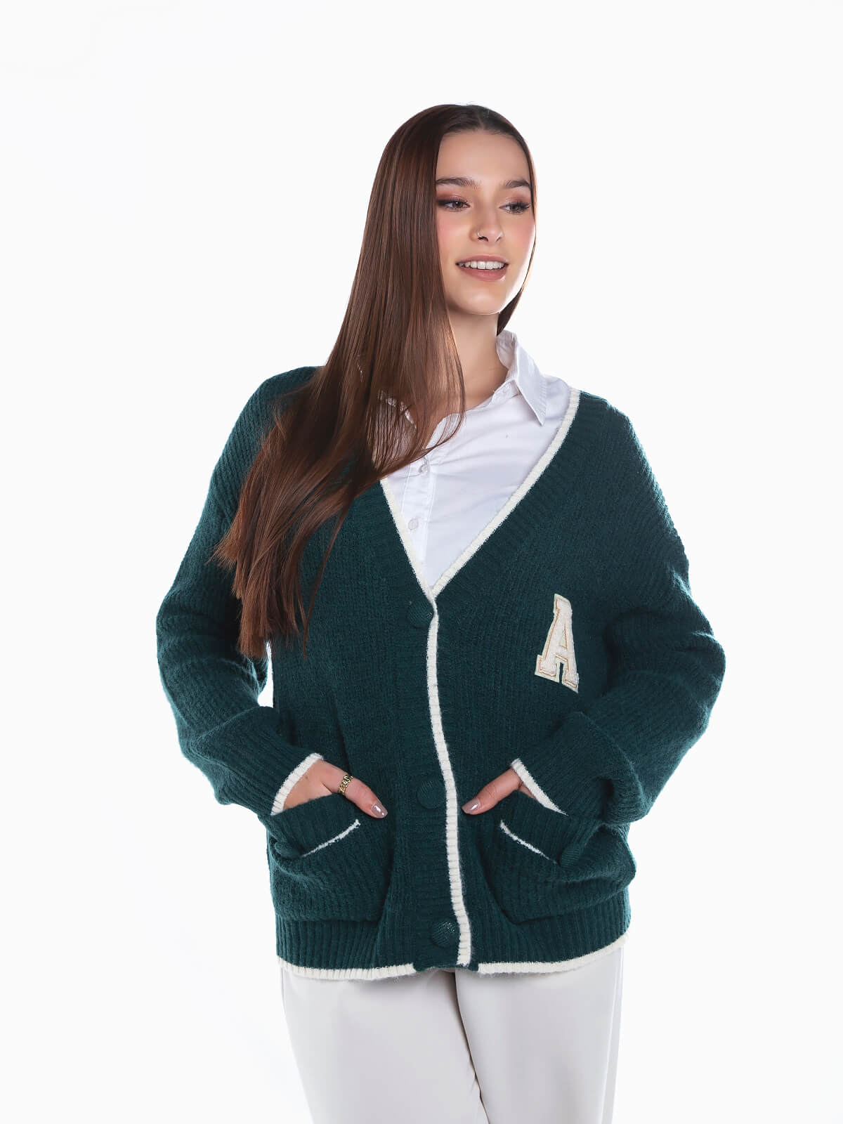 Casaco de malha com símbolo bordado no peito. Cardigan oversize de manga comprida com 2 bolsos quadrados. Decote em bico. Aperto frontal de botões forrados à cor.