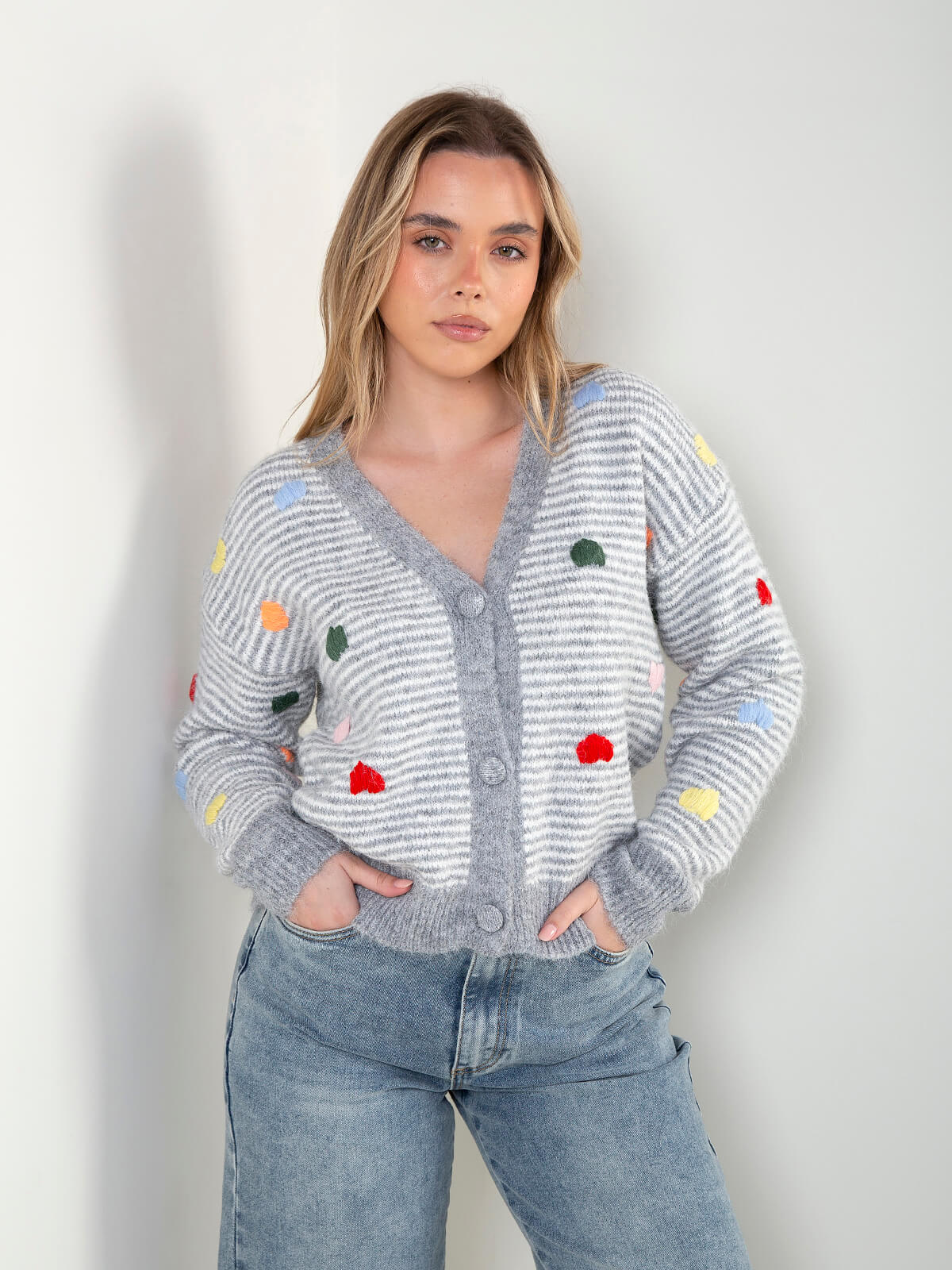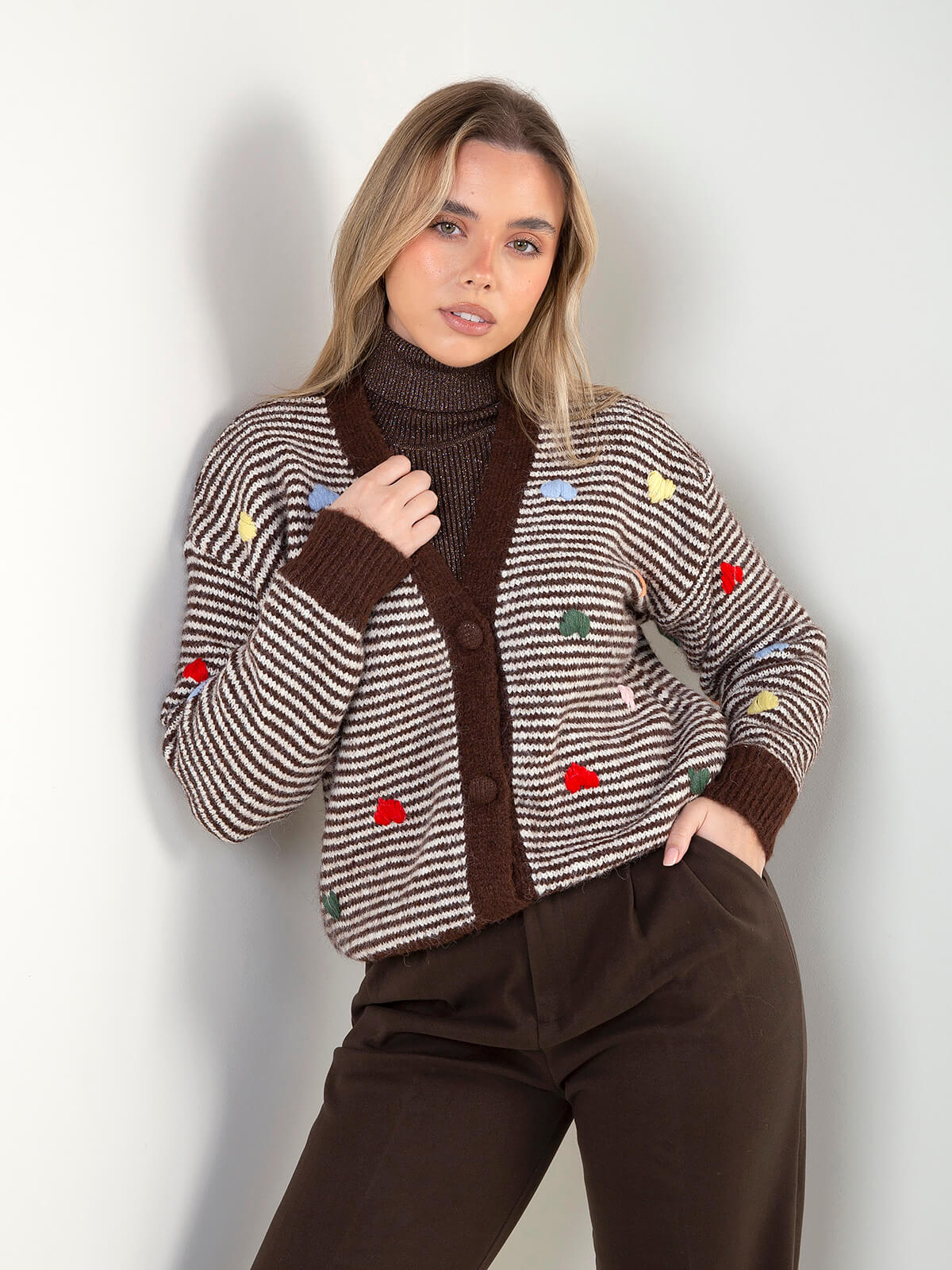 Casaco malha com decote em V, manga comprida e fecho frontal com botões. Destaca-se pelo padrão às riscas e pelas aplicações de cor em formato de coração, que dão um toque divertido e atual à peça.