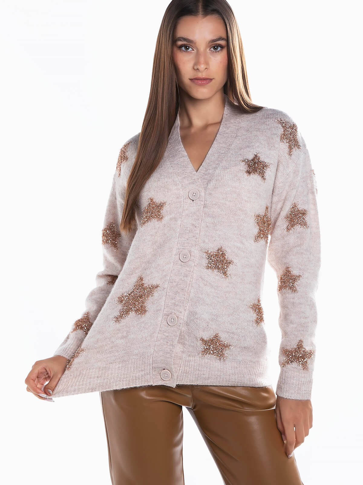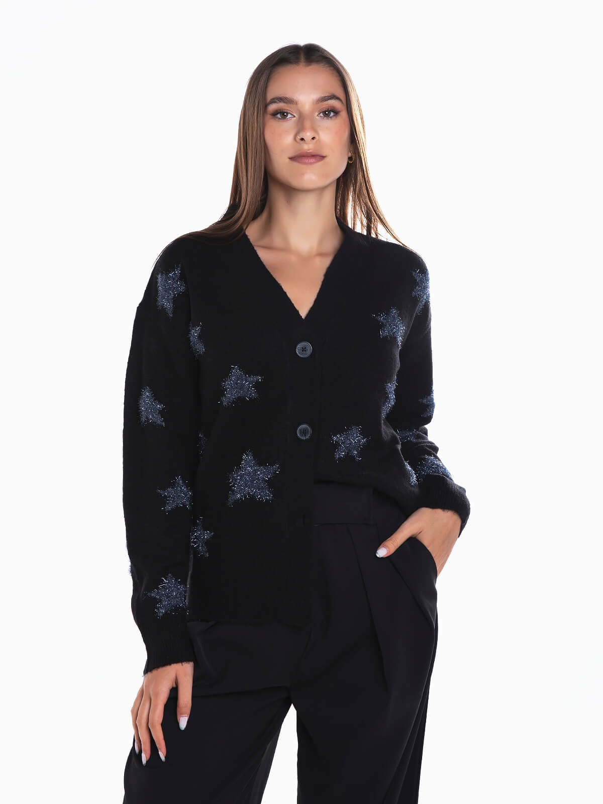 Casaco de malha com estrelas em fibra metálica para efeito brilhante. Cardigan manga comprida com decote em bico.