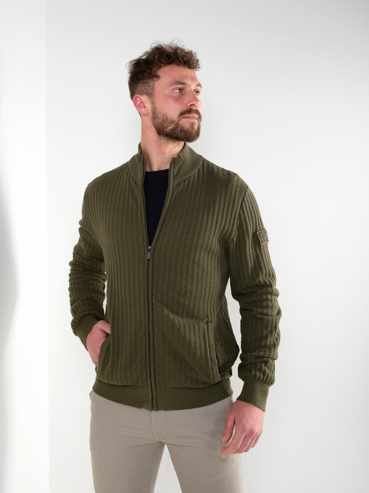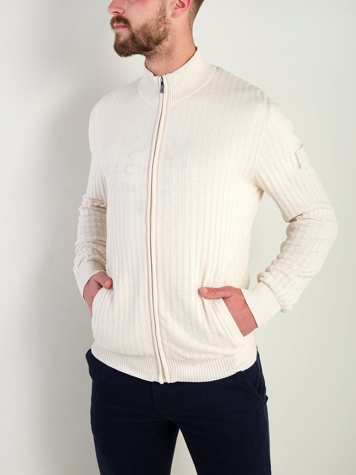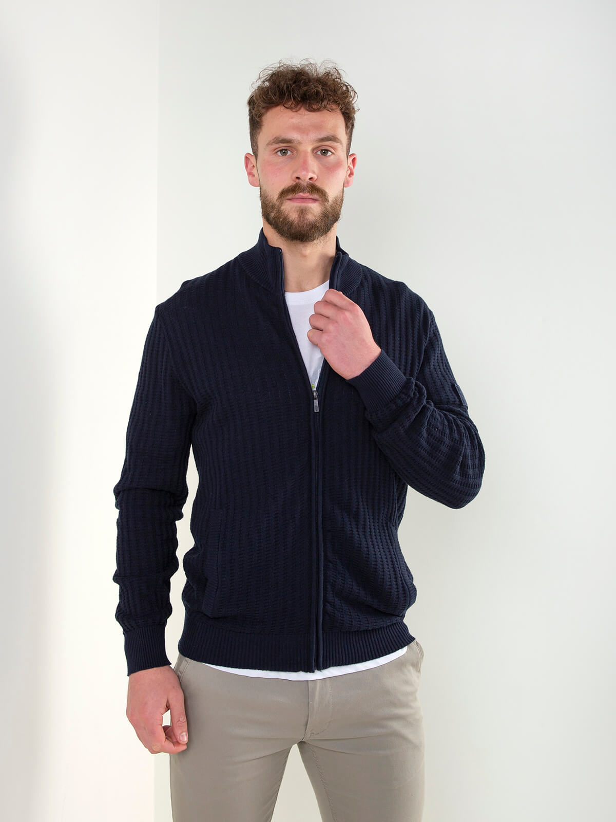 Casaco de malha com textura e fecho frontal, ideal para um look cuidado e versátil. Modelo com gola subida e acabamento canelado nos punhos e na base, que garante um ajuste confortável. Uma peça prática para o dia a dia, fácil de conjugar entre looks casuais e mais formais.