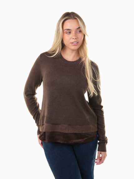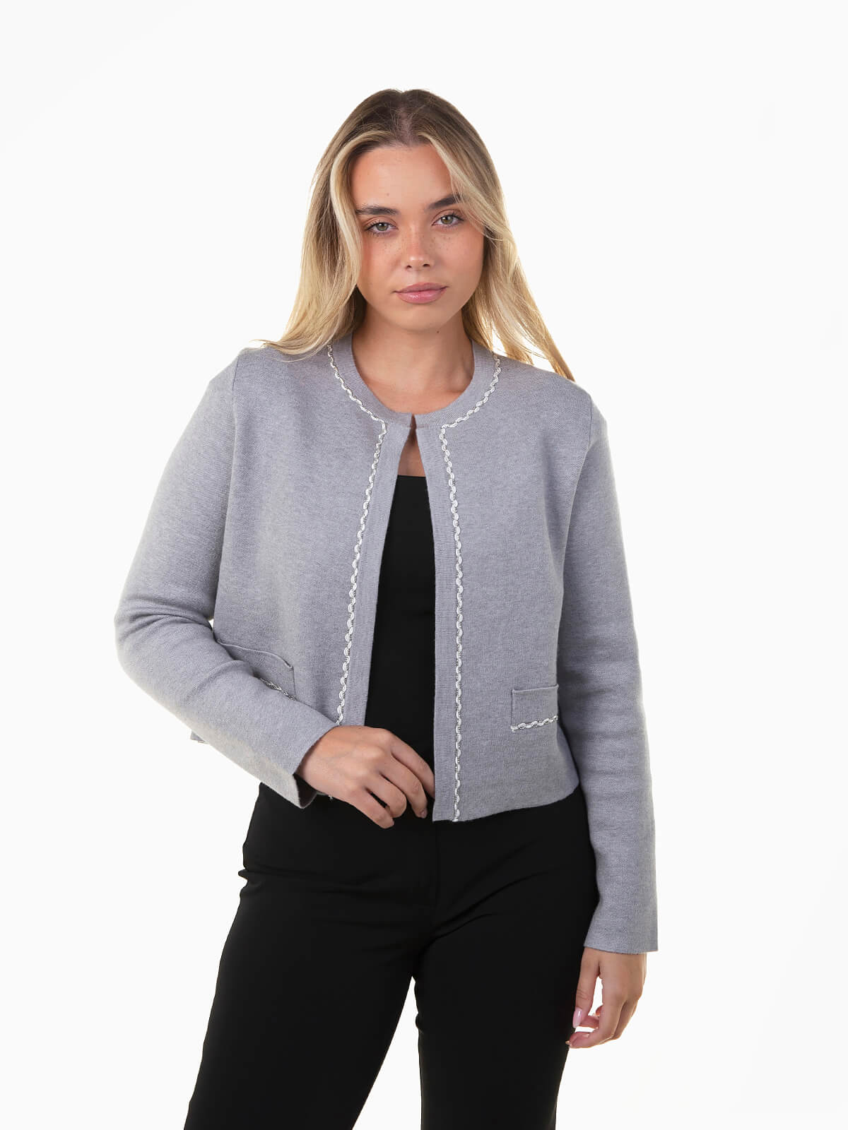Casaco de malha para mulher com lã na composição, oferecendo conforto e calor. O decote redondo com aperto de colchete garante um toque sofisticado, enquanto os rebordos com detalhes elevam o estilo da peça. Versátil e elegante, é ideal para criar looks casuais ou mais sofisticados com facilidade.