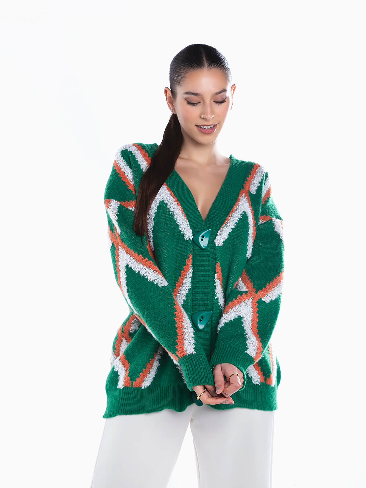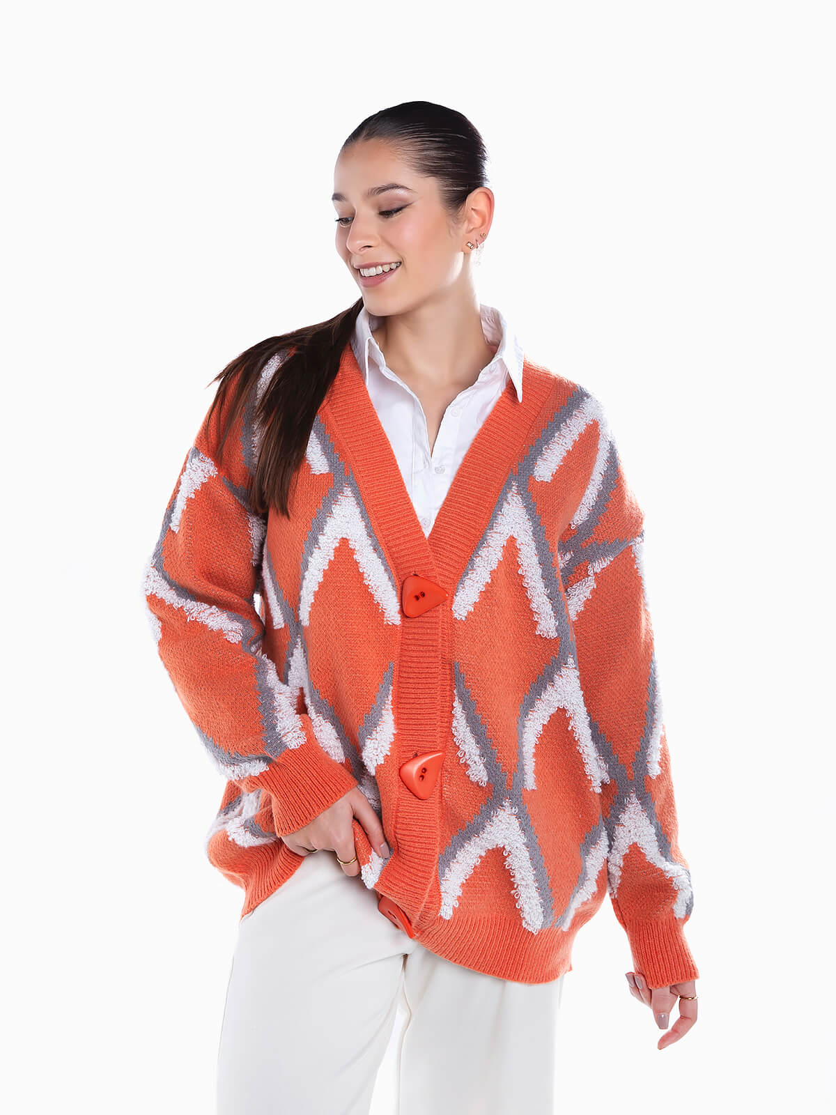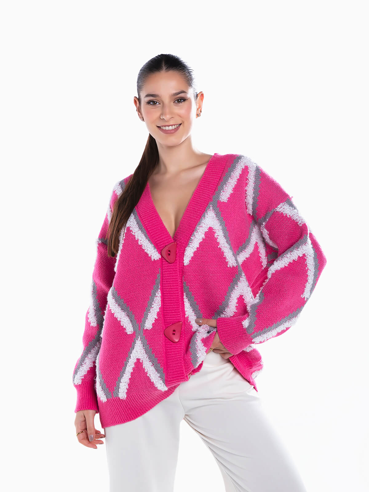 Casaco de malha com losangos em relevo para senhora. Cardigan oversize de manga comprida com decote em bico. Acabamentos canelados. Aperto frontal de botões.