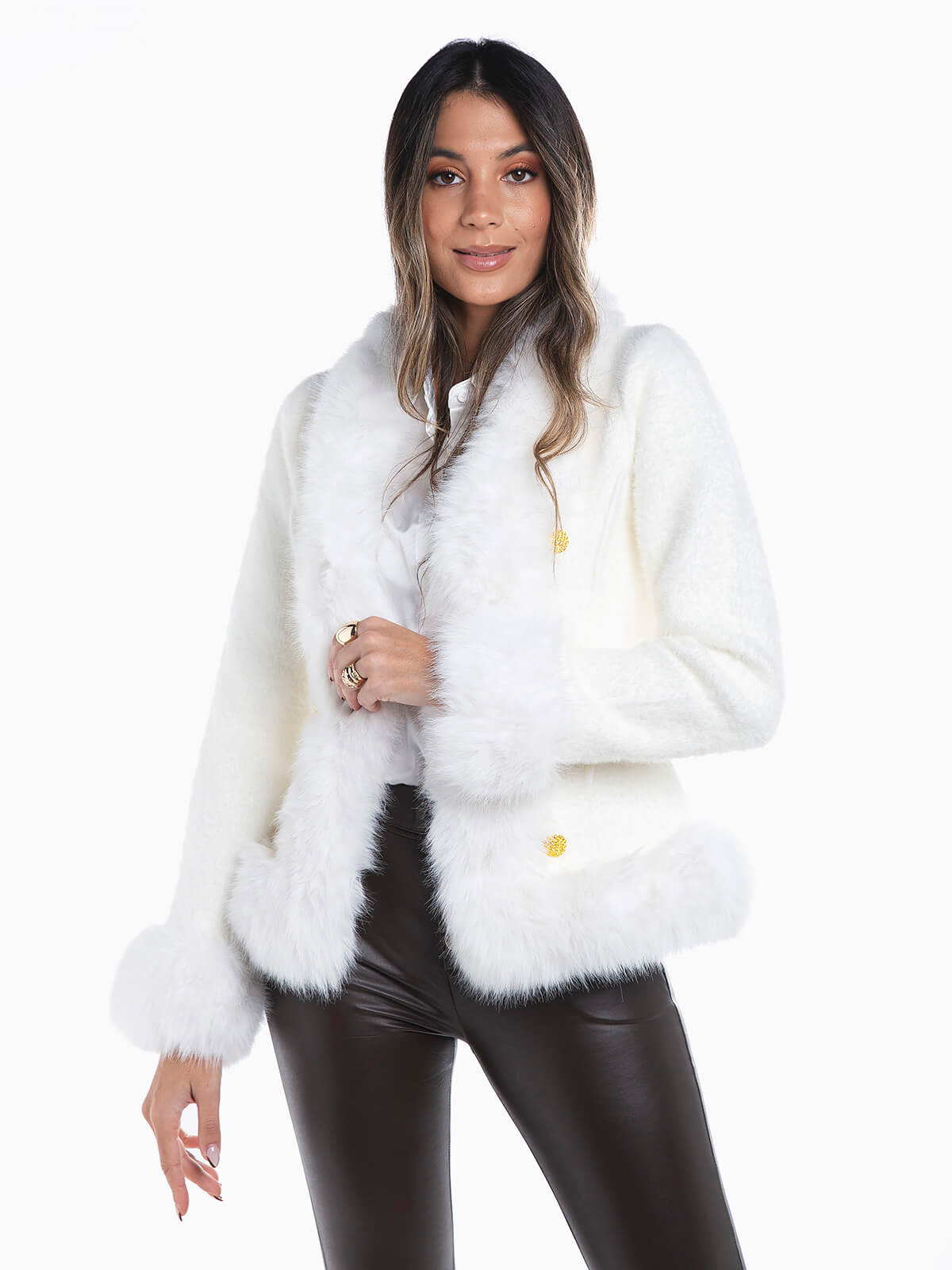 Casaco de malha com encaixe de pelo sintético nas extremidades. Casaco em malha suave e quente manga comprida. Botões dourados aplicados. Aperto frontal de colchete.