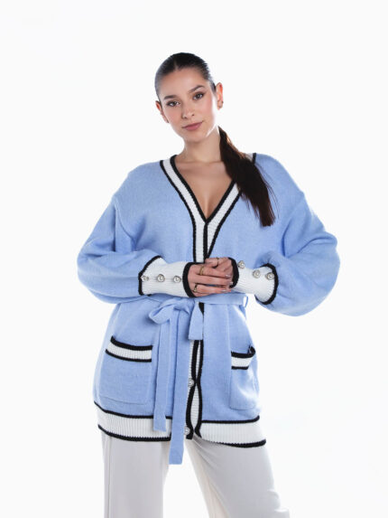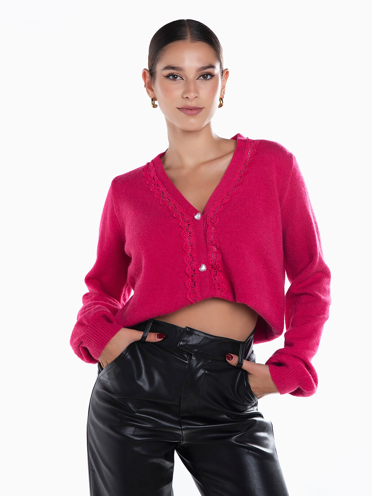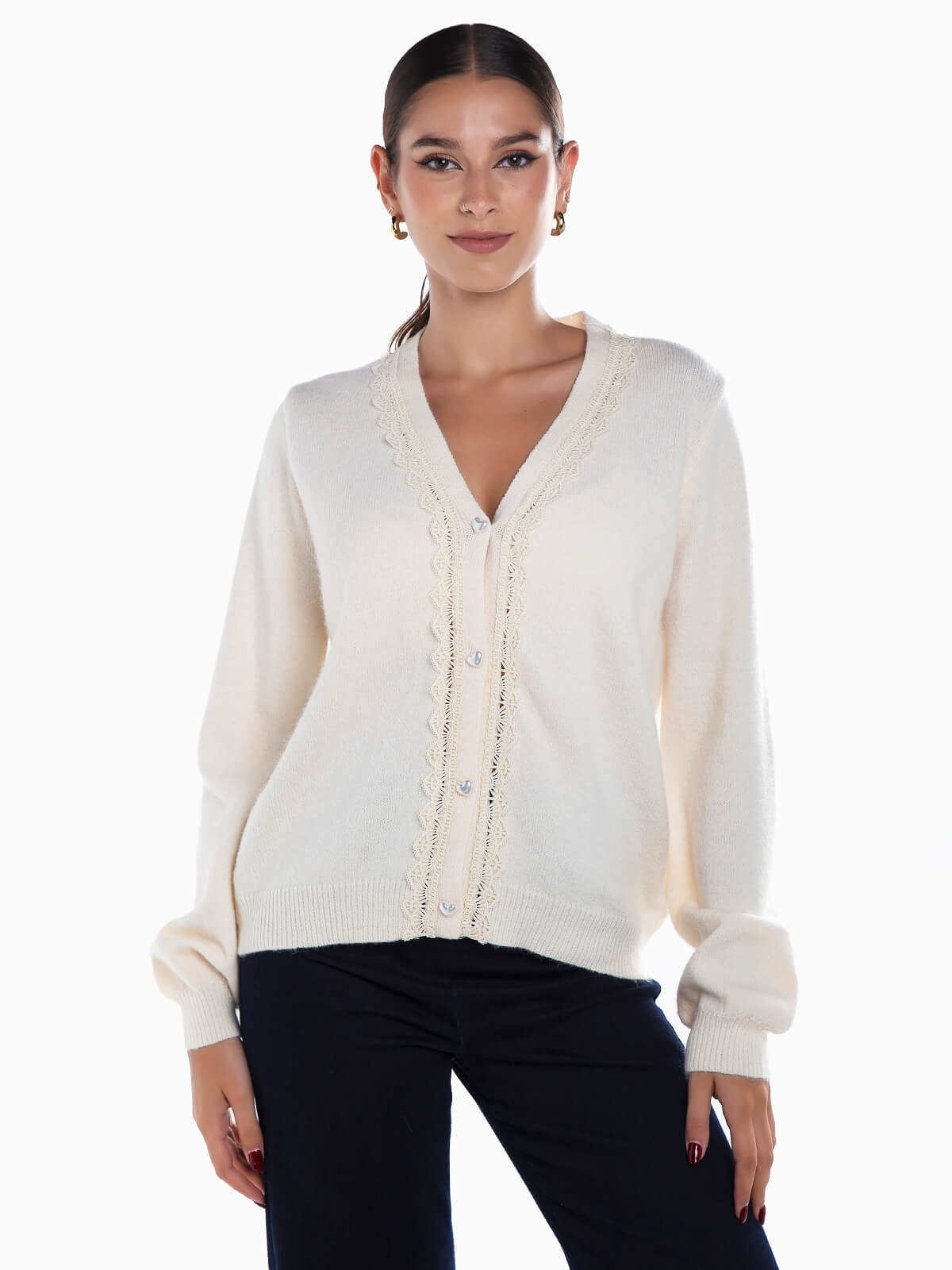 Casaco malha aconchegante com renda aplicada à frente. Cardigan manga comprida com acabamentos canelados e decote em V. Aperto de botões.