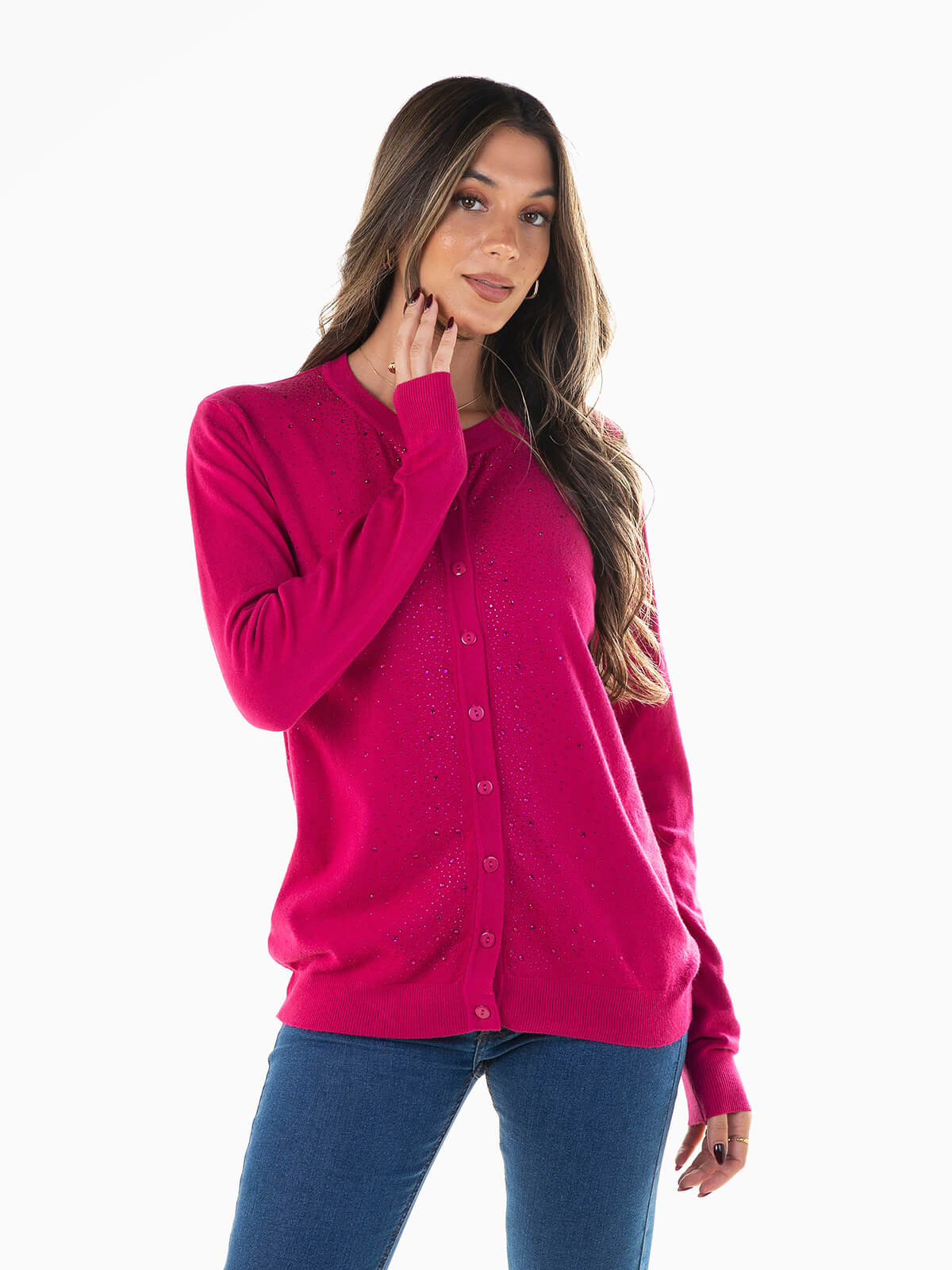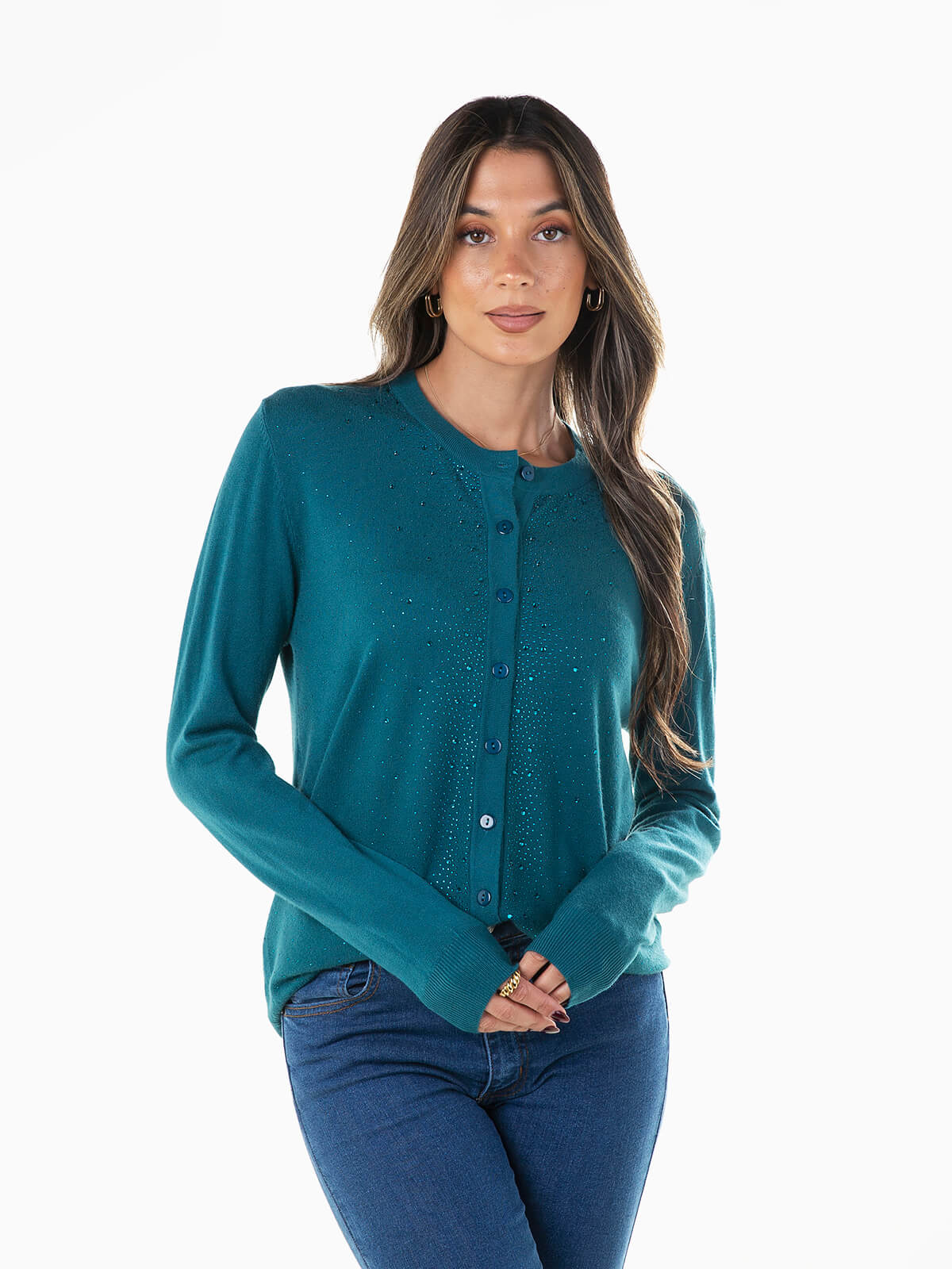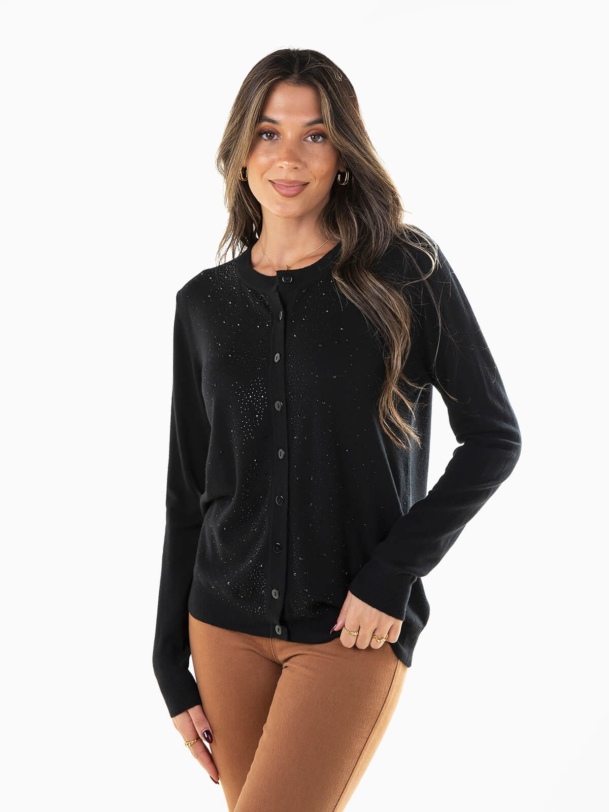 Casaco de malha com strass para efeito brilhante. Cardigan manga comprda com decote redondo e acabamentos canelados. Aperto de botões.