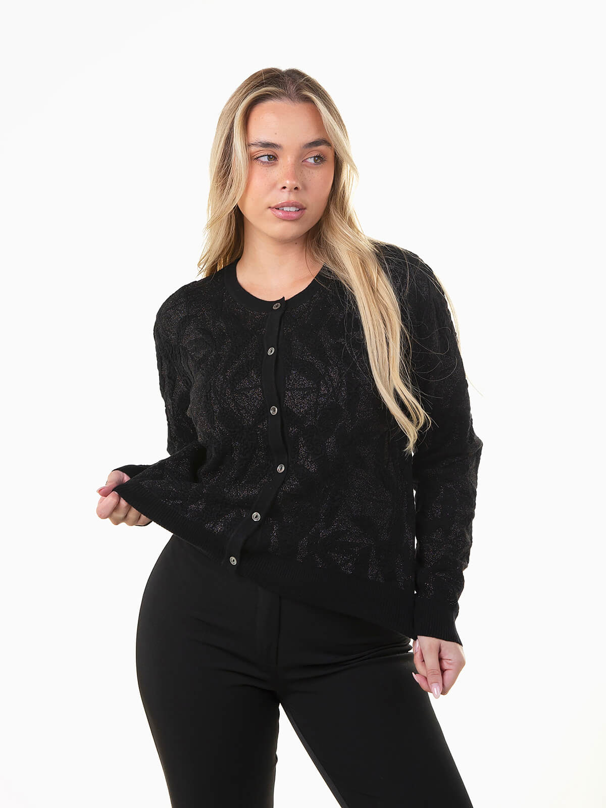 Casaco em malha para mulher com padrão de folhas texturizado e fio lurex, criando um efeito ligeiramente brilhante e sofisticado. Decote redondo e aperto com botões completam esta peça versátil, perfeita para looks elegantes e modernos.
