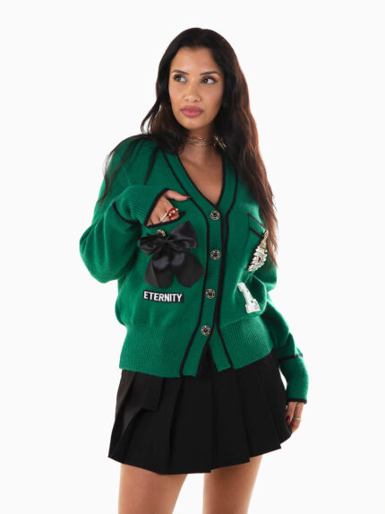 Casaco de malha com encaixe de tule na base e punhos. Cardigan justo em malha canelada com decote em bico. Aperto frontal de botões.