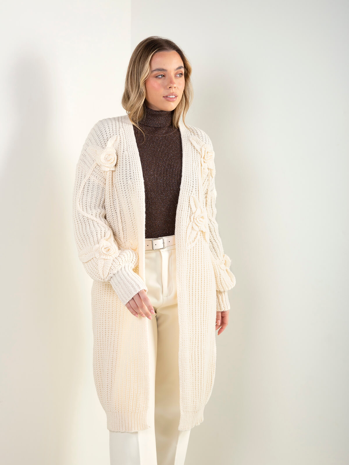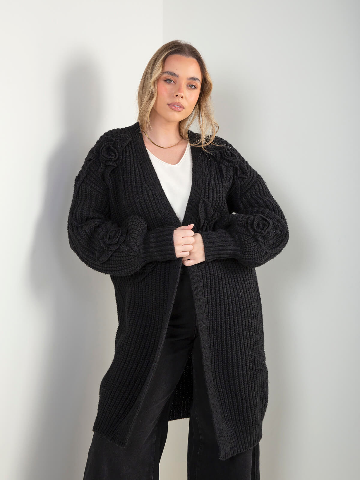 Casaco de malha comprido, modelo aberto, com aplicações de flores em relevo. Uma peça confortável e feminina, ideal para completar looks com um toque delicado e atual.