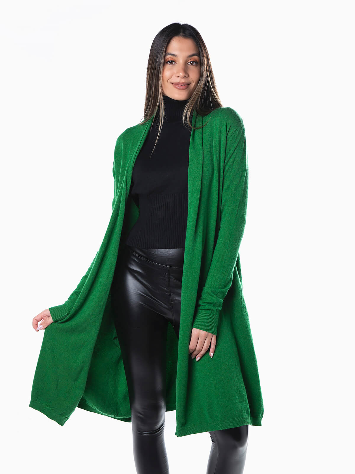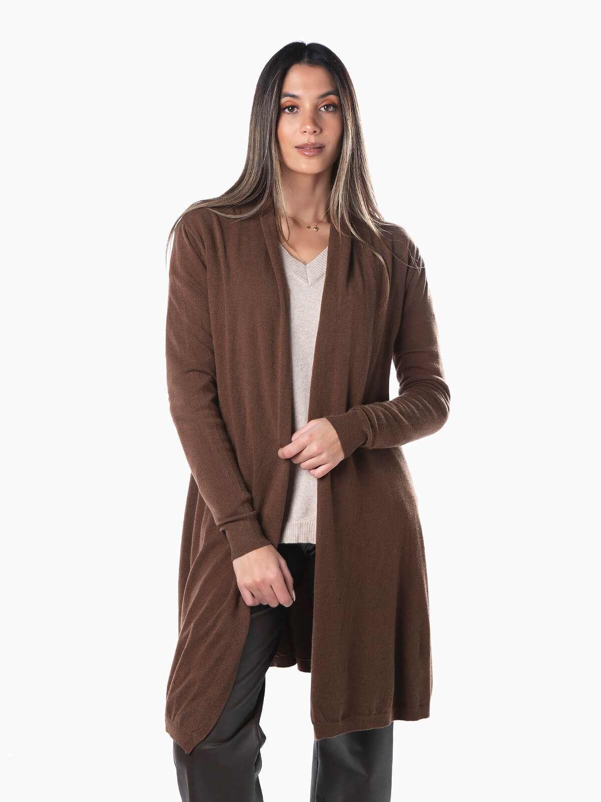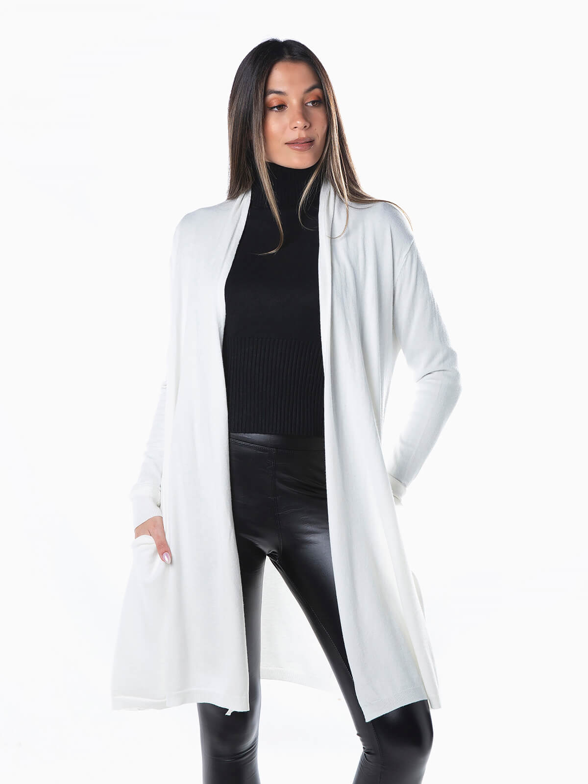 Casaco malha comprido aberto para senhora. Cardigan fluído manga comprida com 2 bolsos.