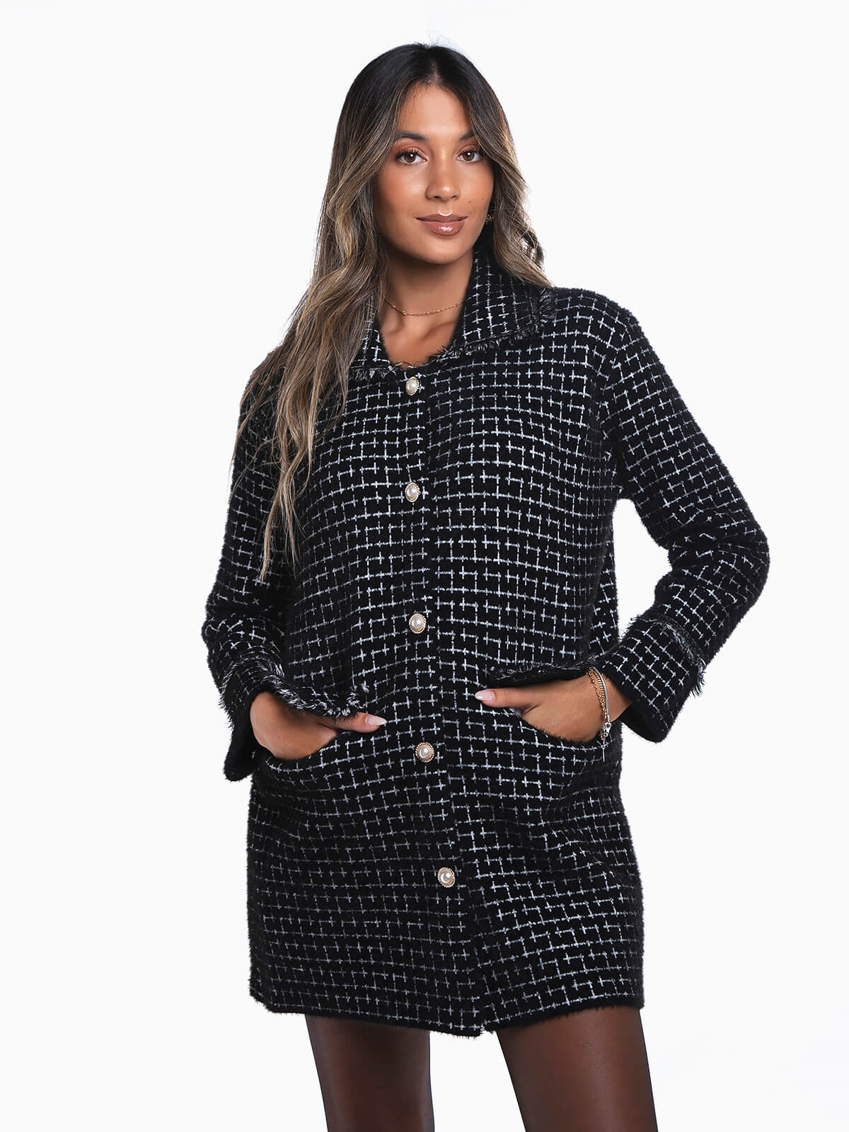 Casaco comprido em malha com pelo de toque suave para senhora. Casaco com colarinho de aba e 2 bolsos. Manga comprida. Aperto frontal de botões de pérolas.