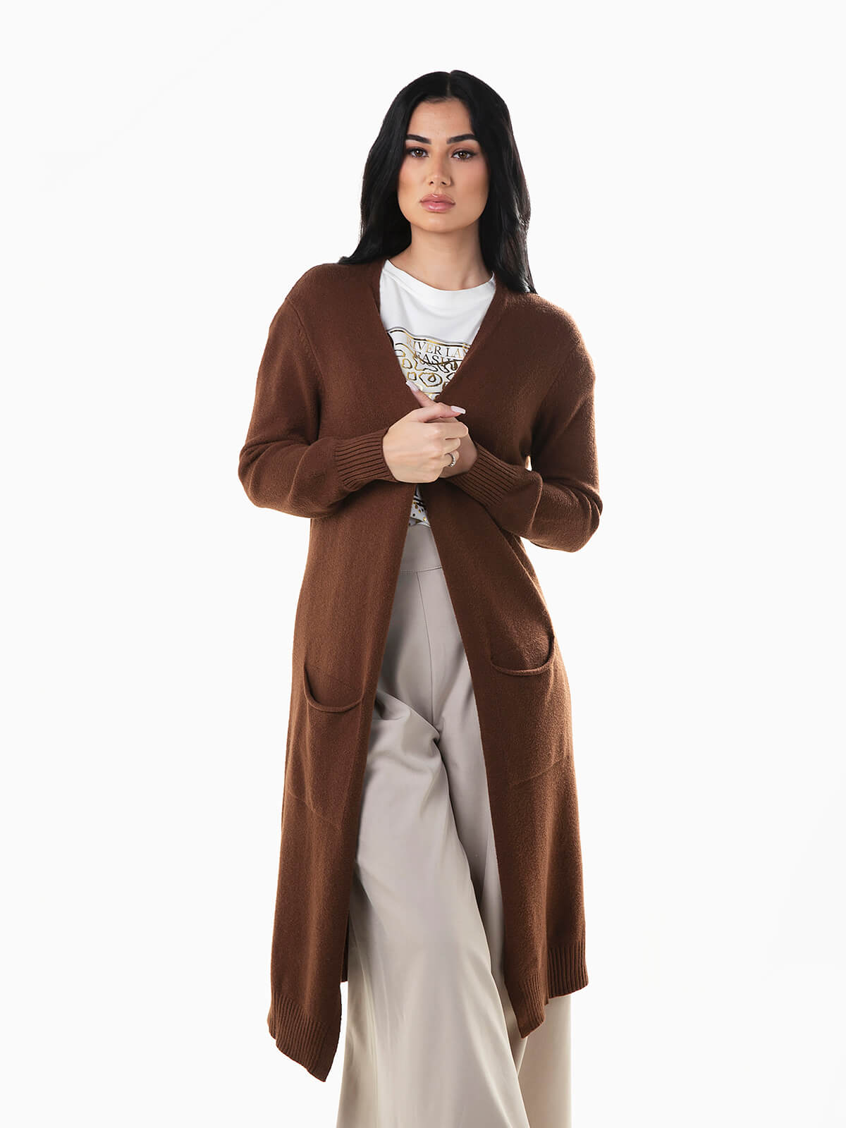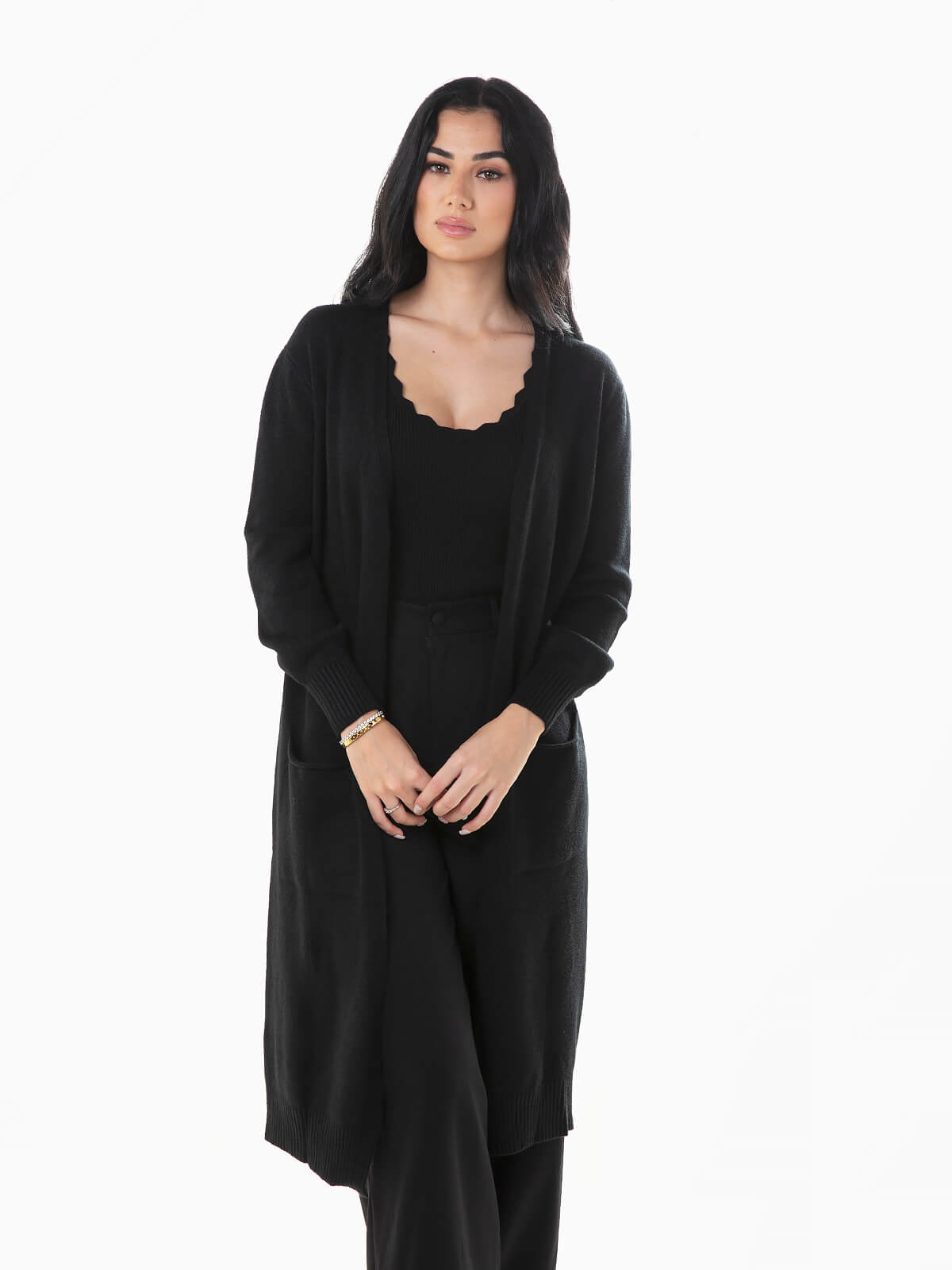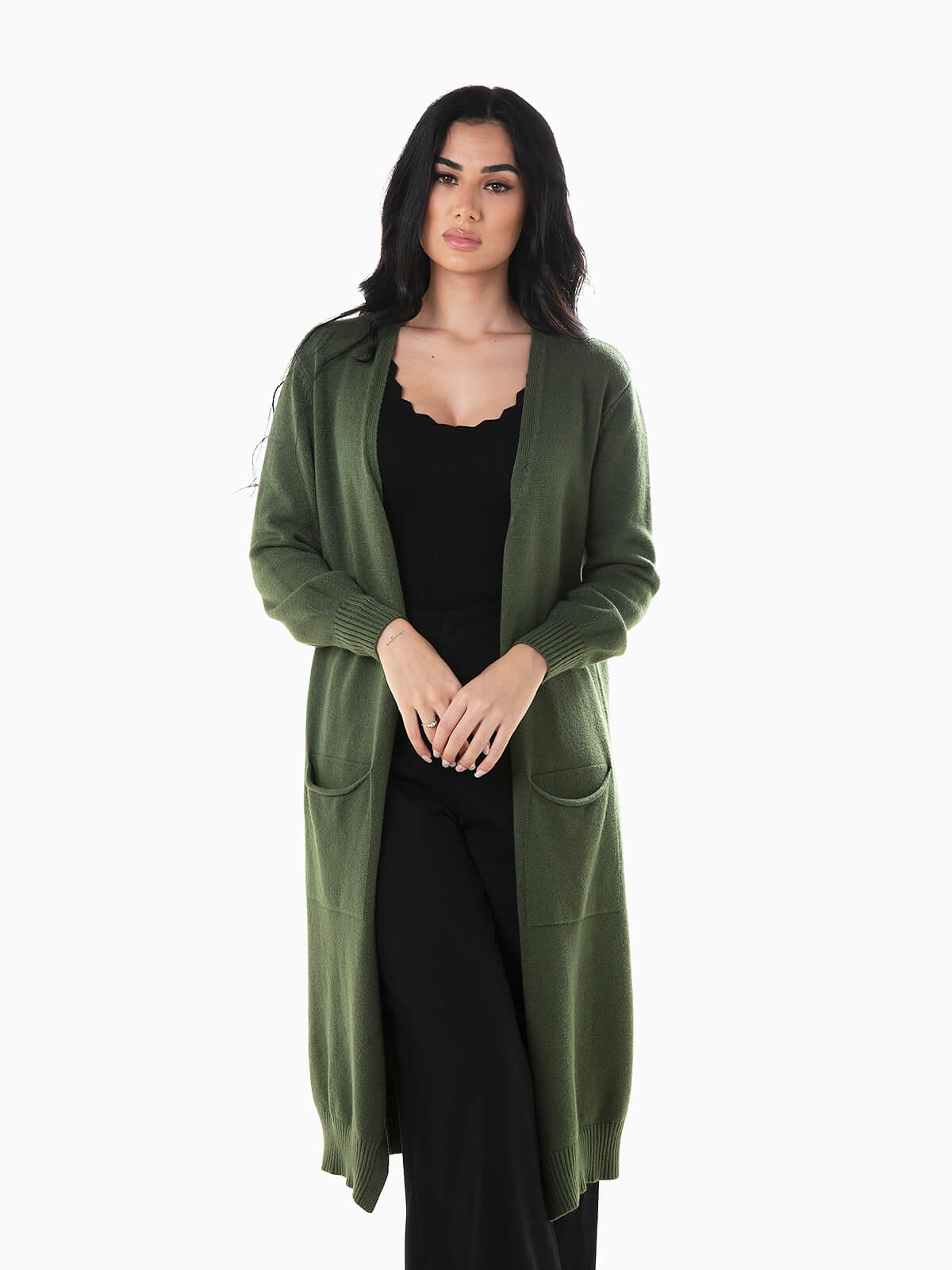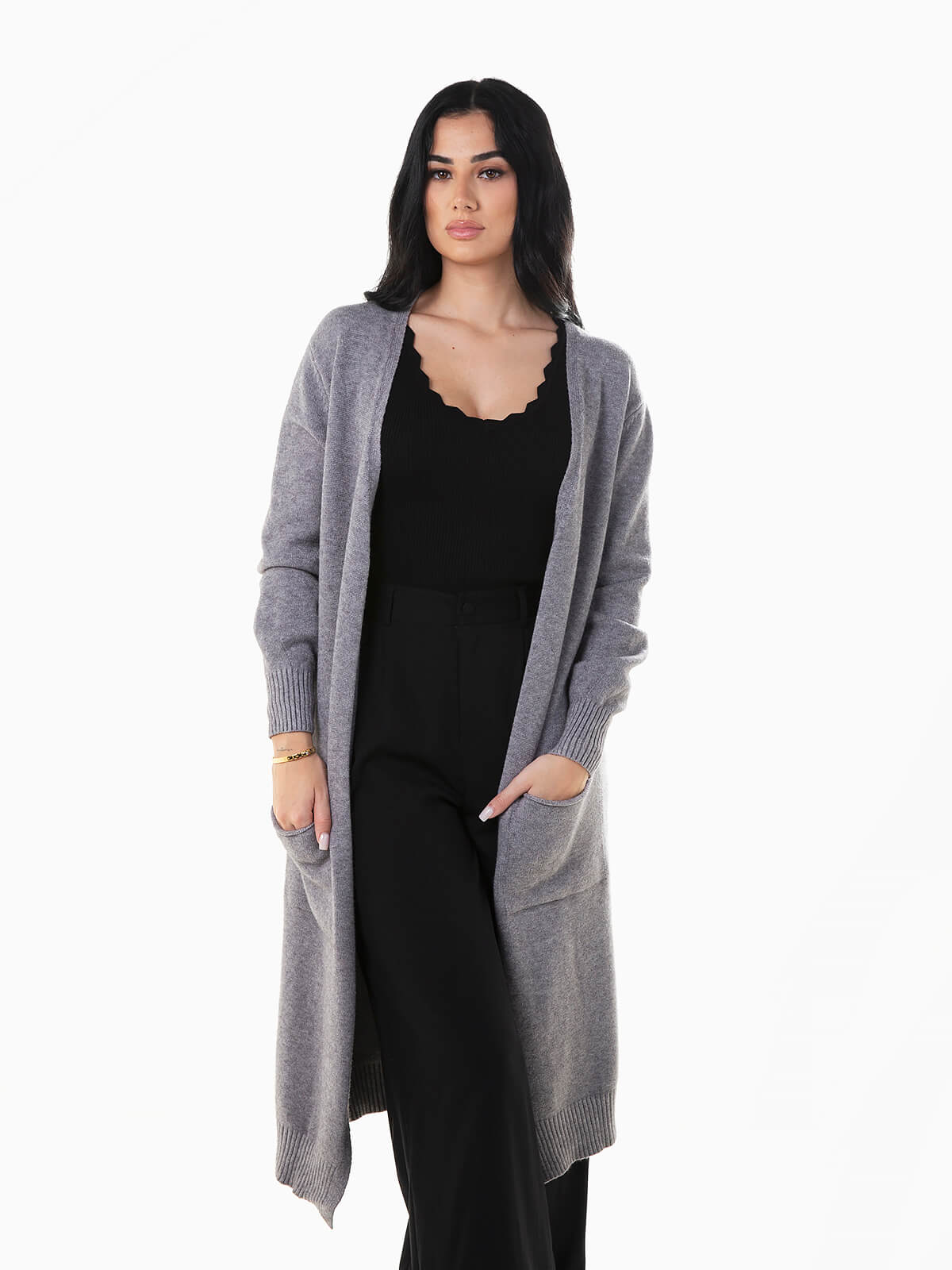 Casaco de malha comprido com dois bolsos quadrados. Cardigan aberto de manga comprida com extremidades caneladas.
