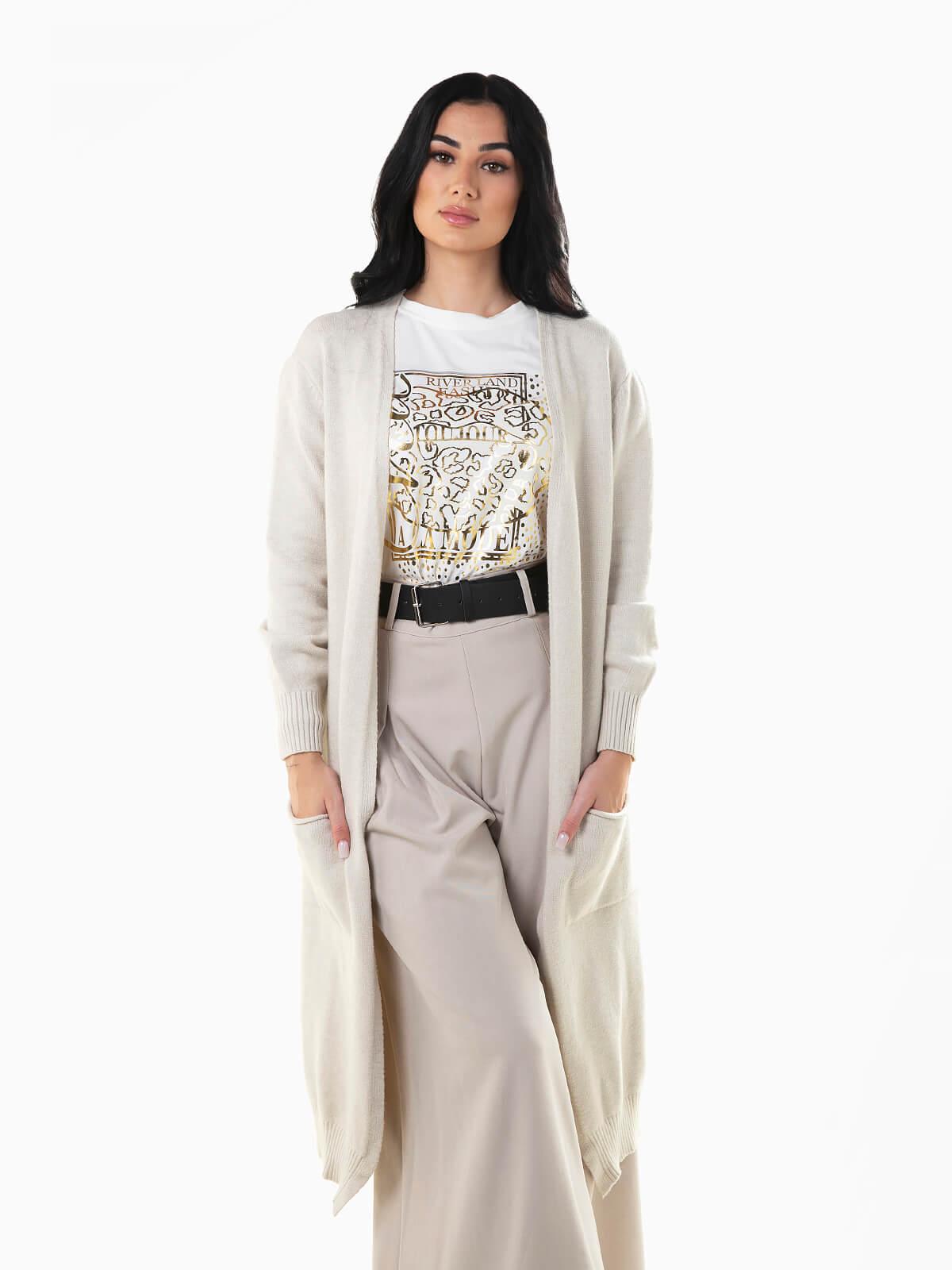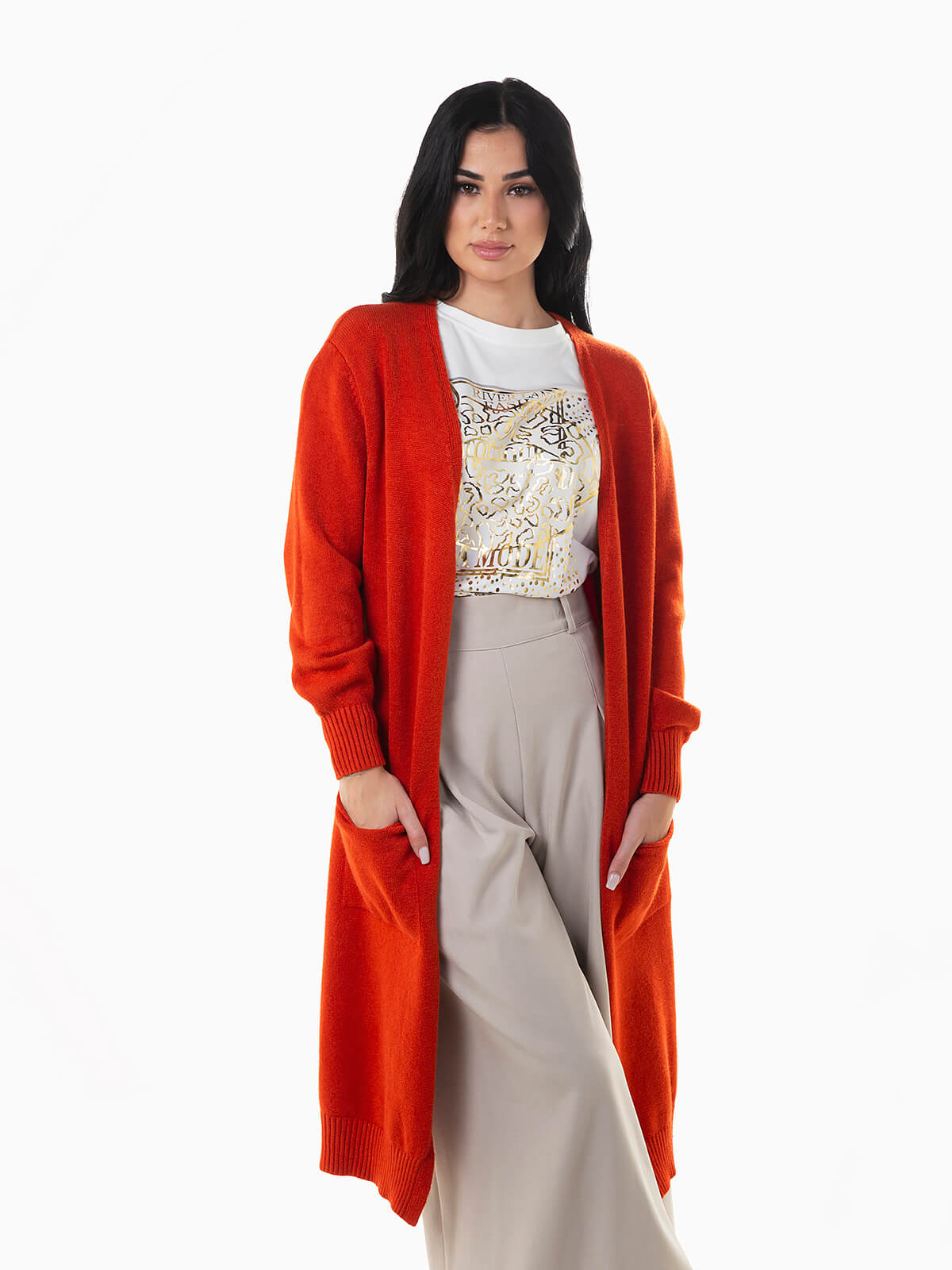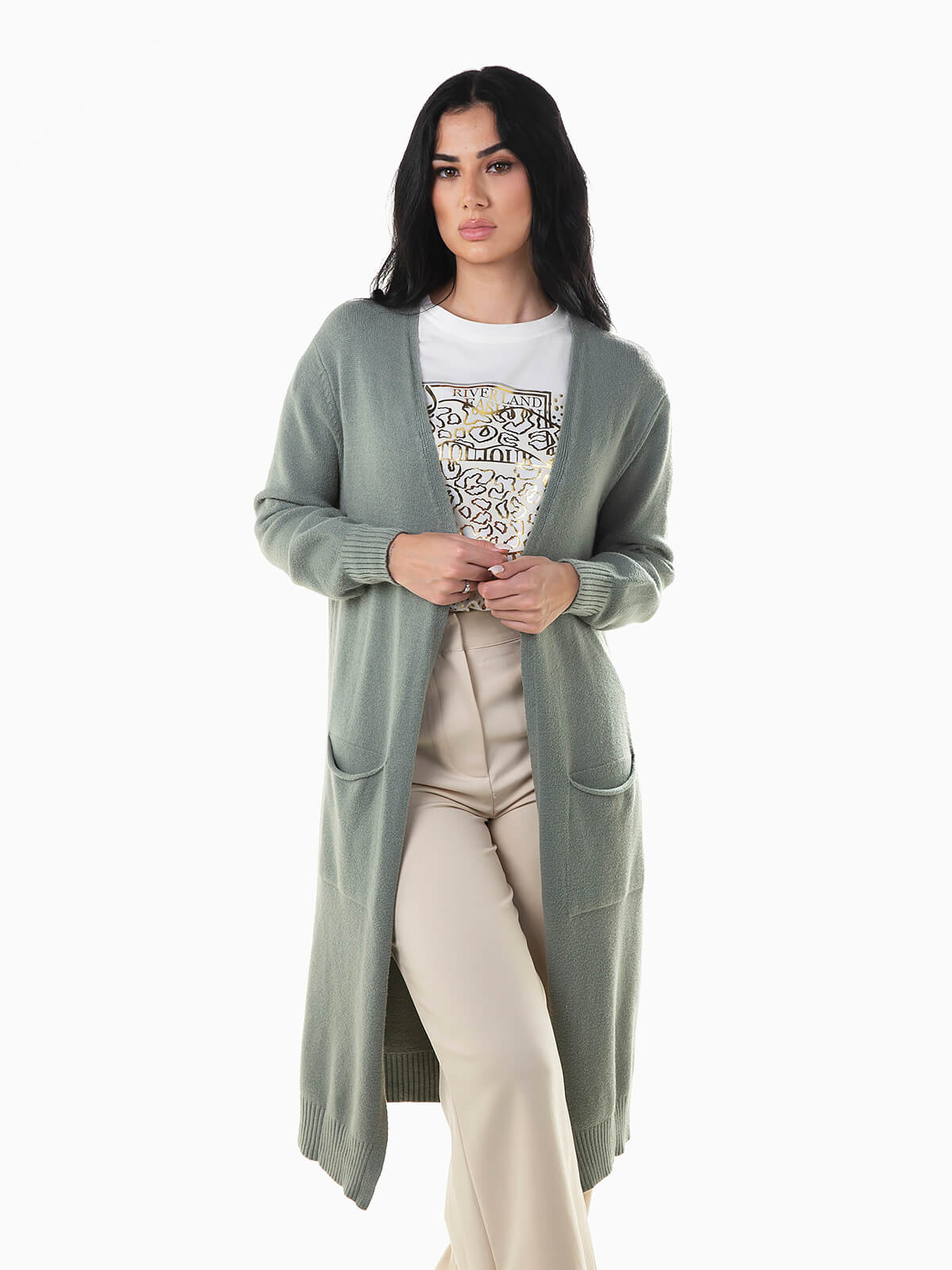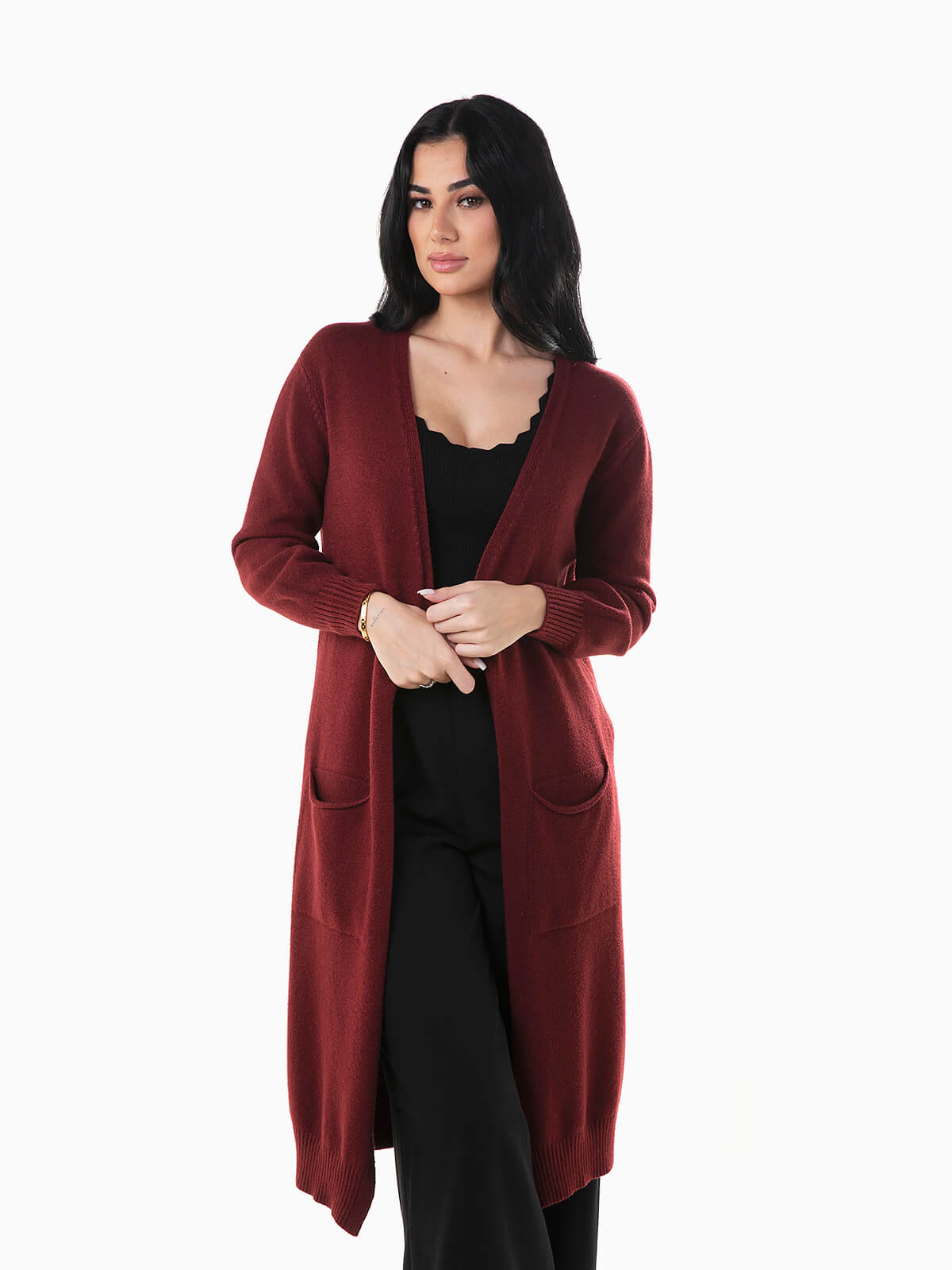 Casaco de malha comprido com dois bolsos quadrados. Cardigan aberto de manga comprida com extremidades caneladas.