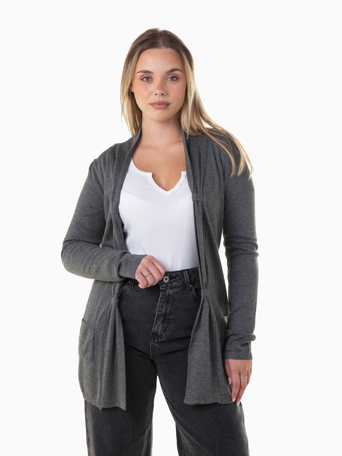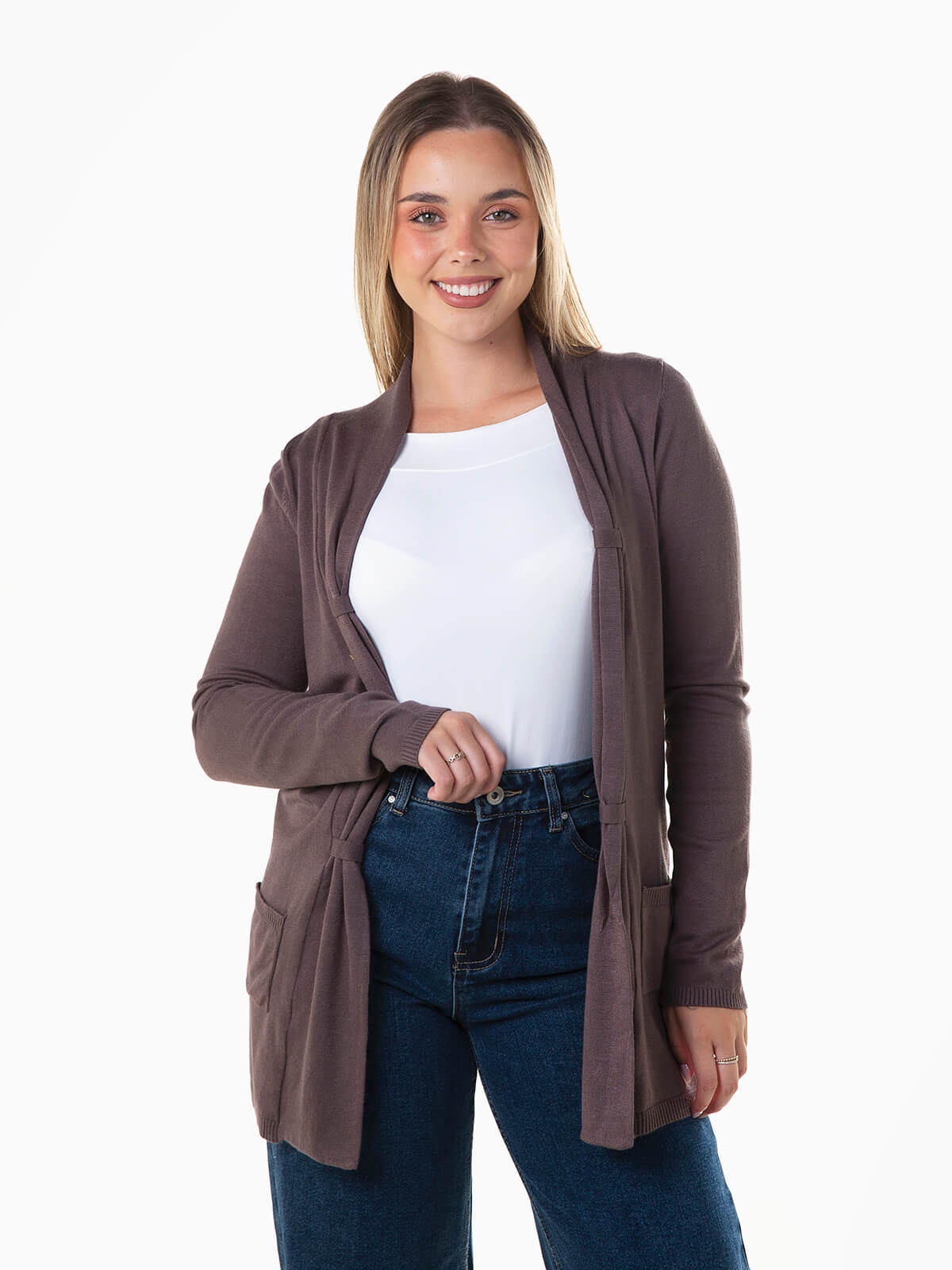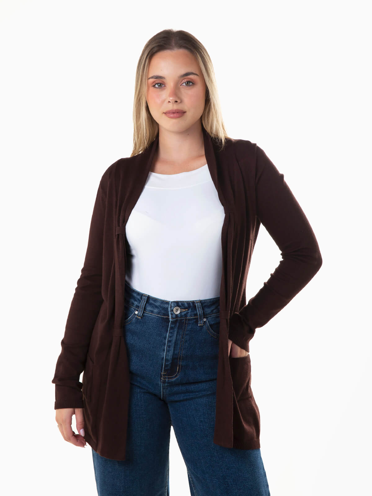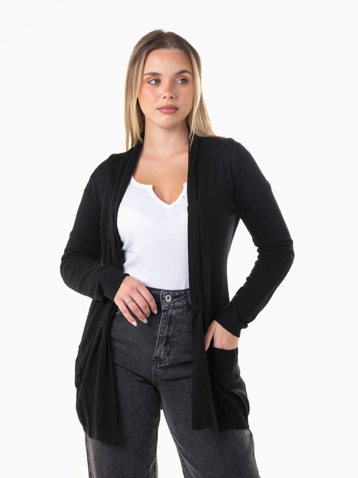 Casaco malha comprido com 2 bolsos quadrados. Cardigan aberto de manga comprida com botões decorativos na parte posterior.
