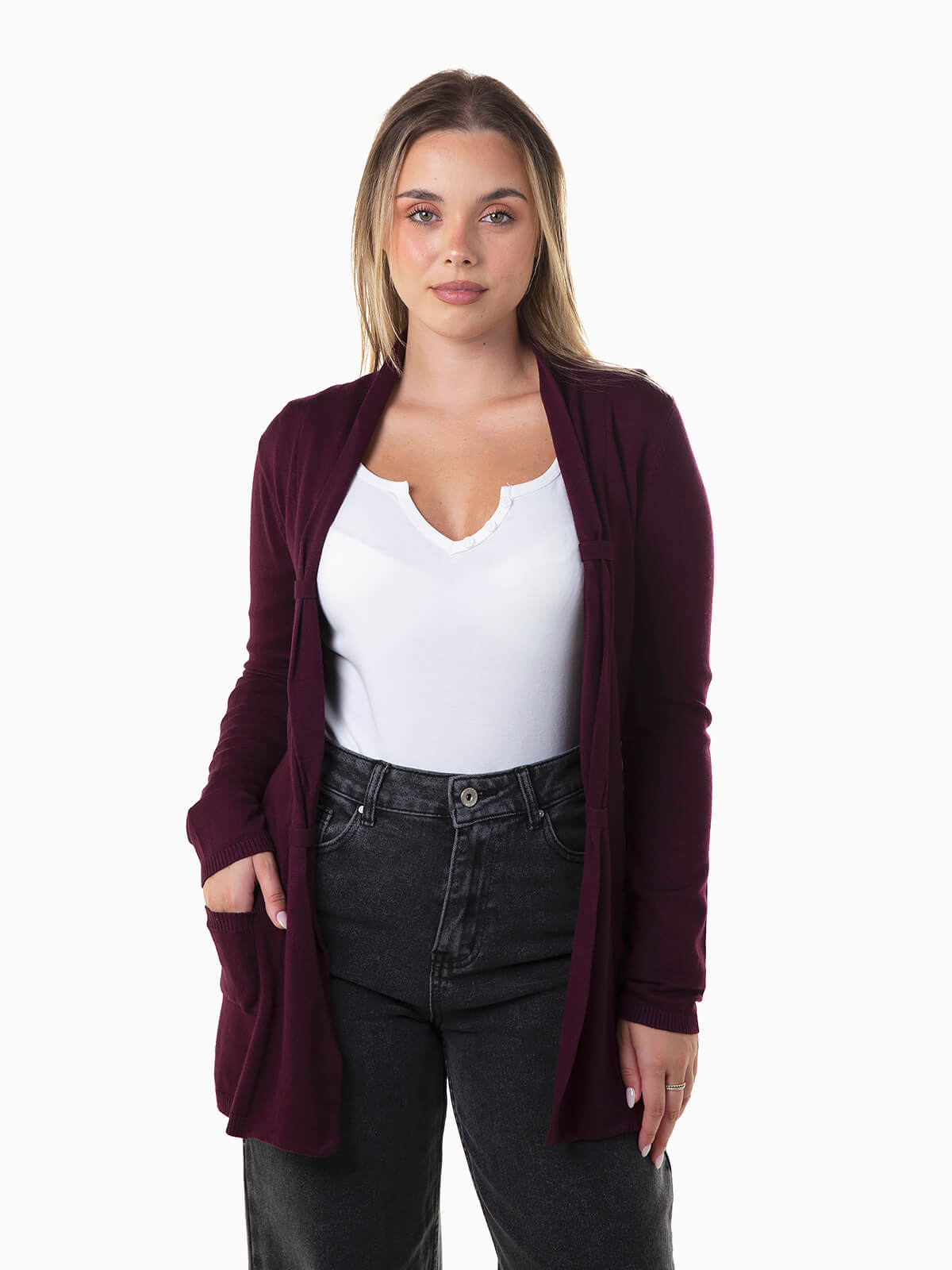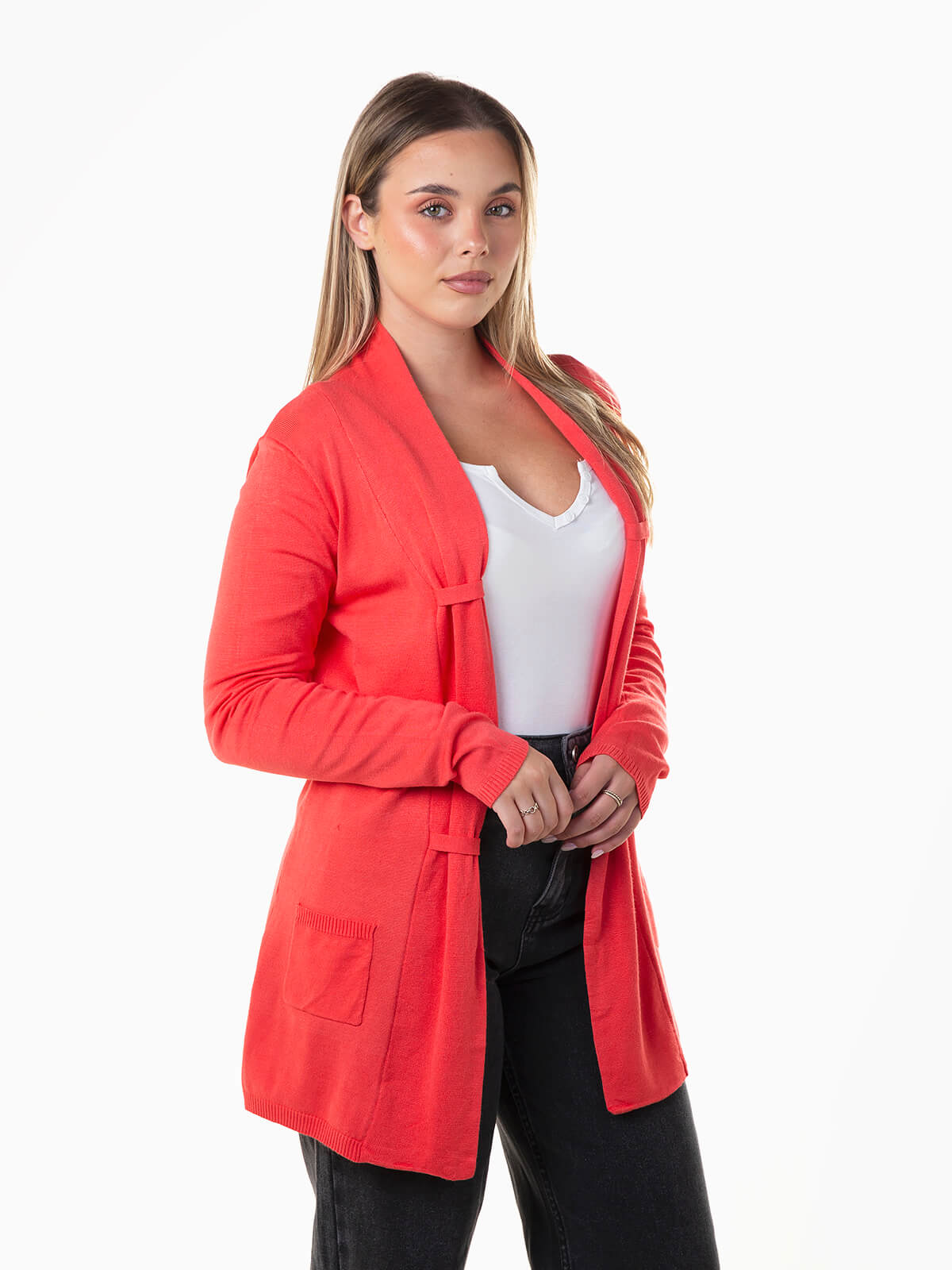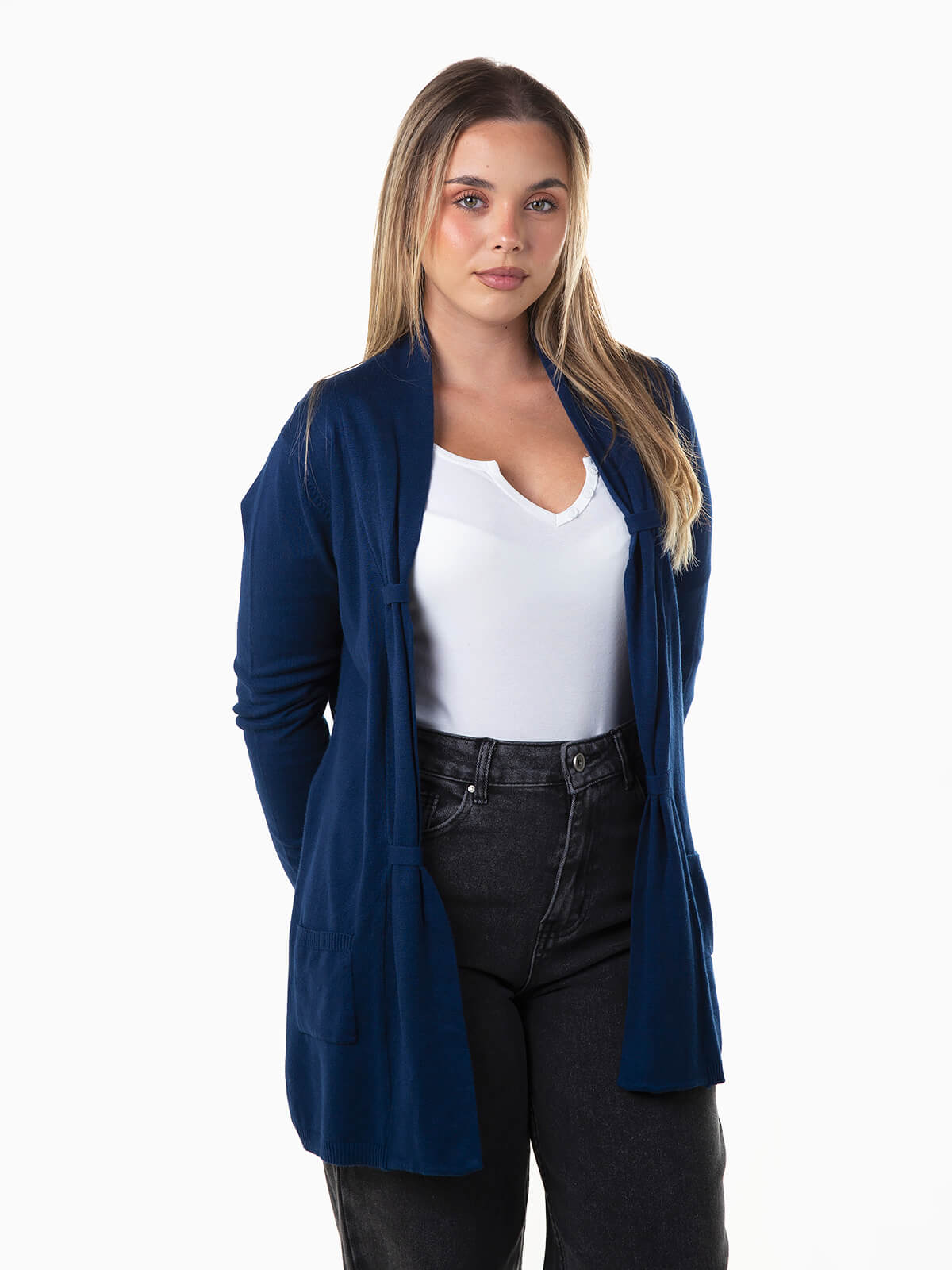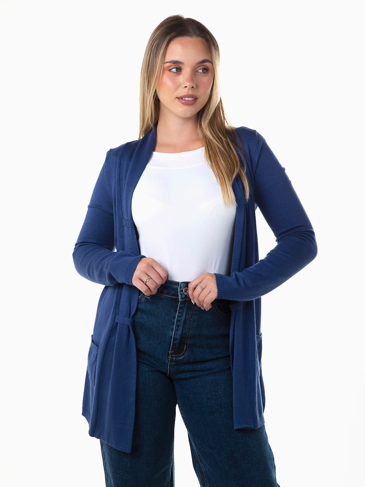 Casaco malha comprido com 2 bolsos quadrados. Cardigan aberto de manga comprida com botões decorativos na parte posterior.