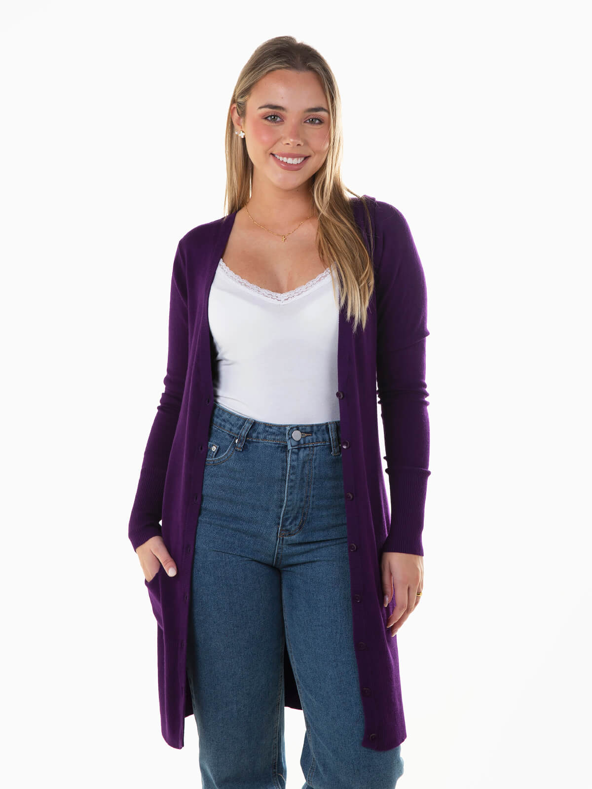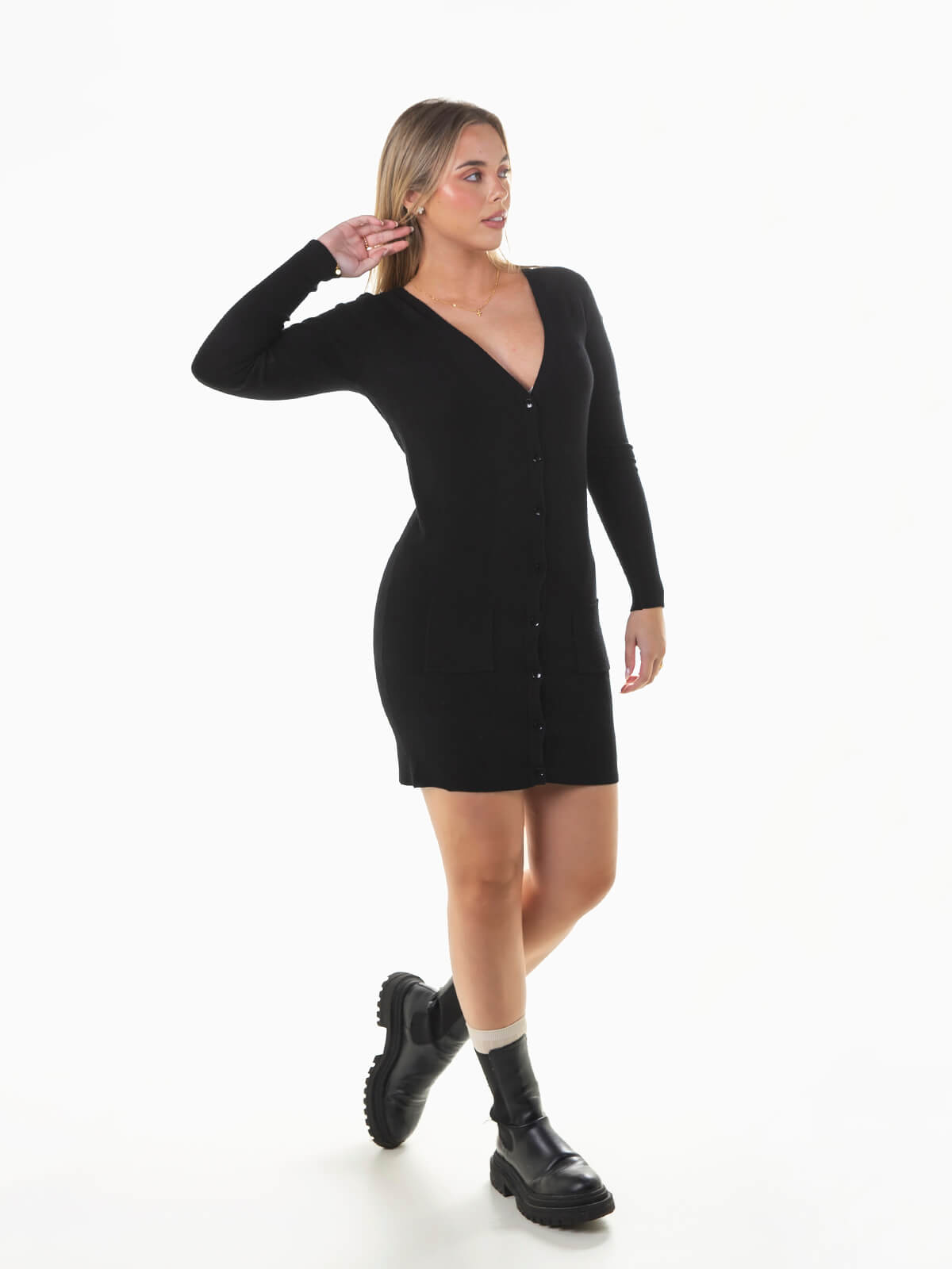 Casaco de malha comprido com aperto de botões e decote em V. Cárdigan justo manga comprida com 2 bolsos e acabamentos canelados.