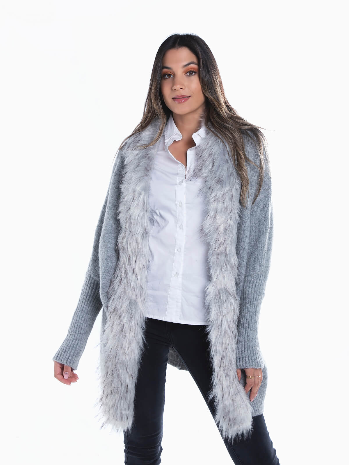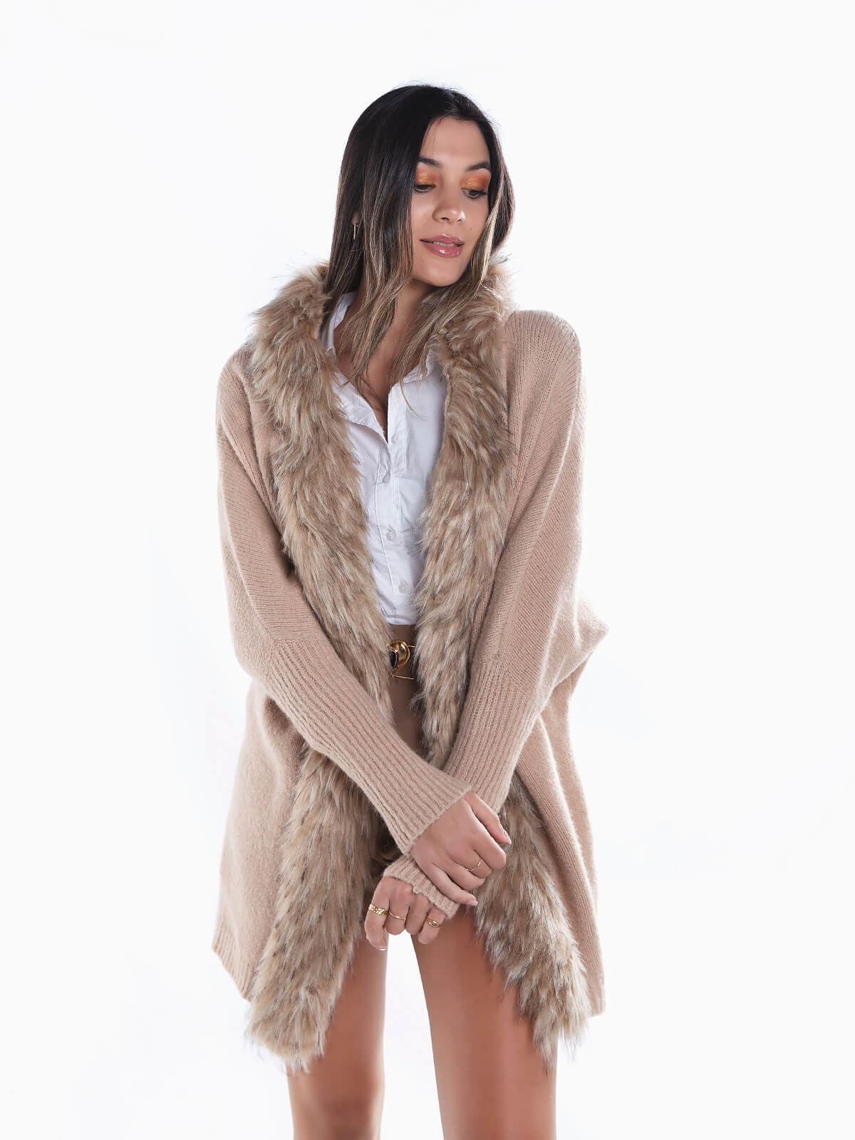 Casaco malha comprido com capuz para senhora. Cardigan aberto de manga comprida com pelo aplicado nas extremidades. Acabamentos canelados.