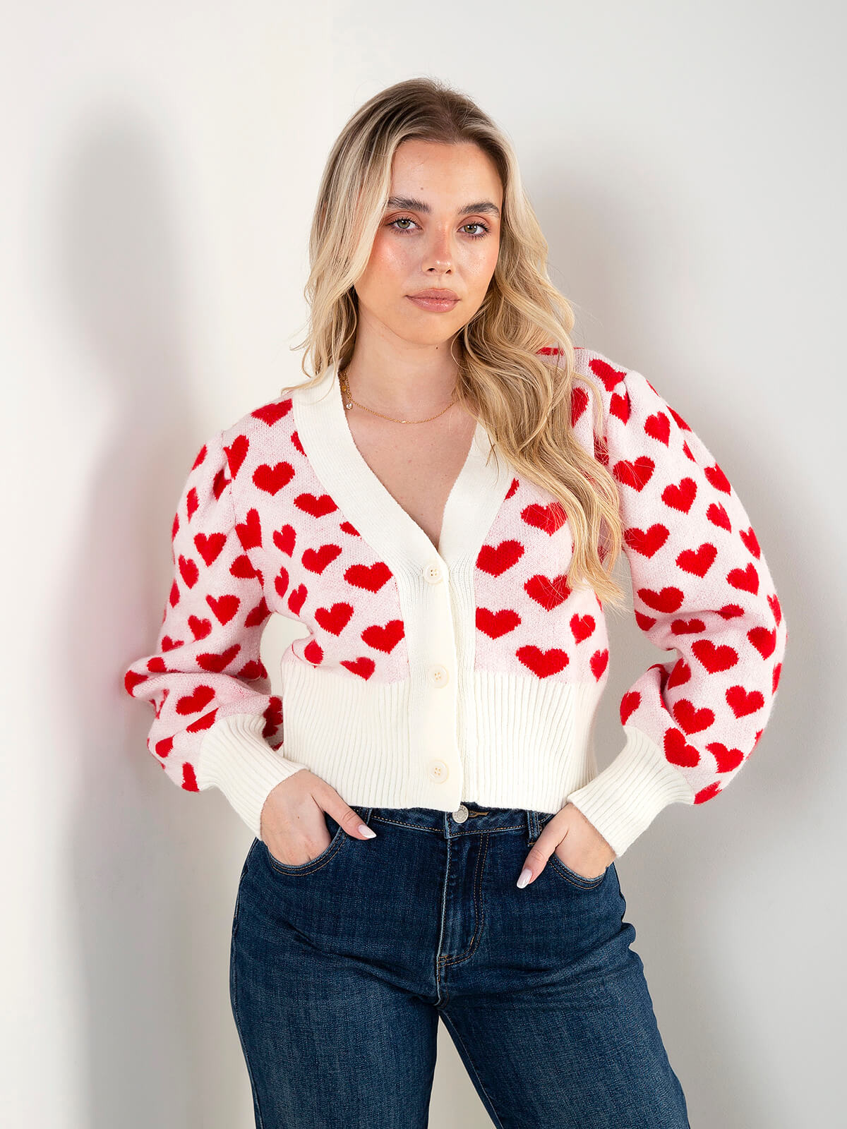 Casaco curto de malha com corações em contraste. Cardigan manga comprida com pormenor de pregas nos ombros. Decote em V e extremidades caneladas. Aperto frontal de botões.