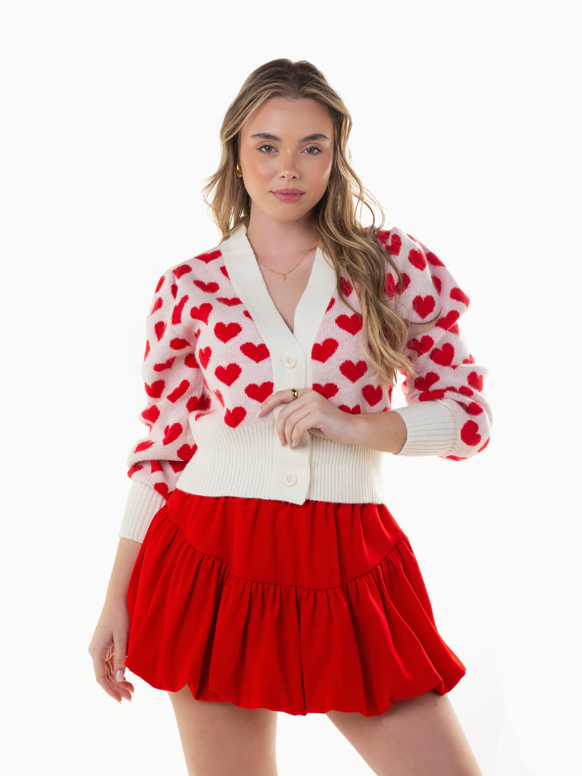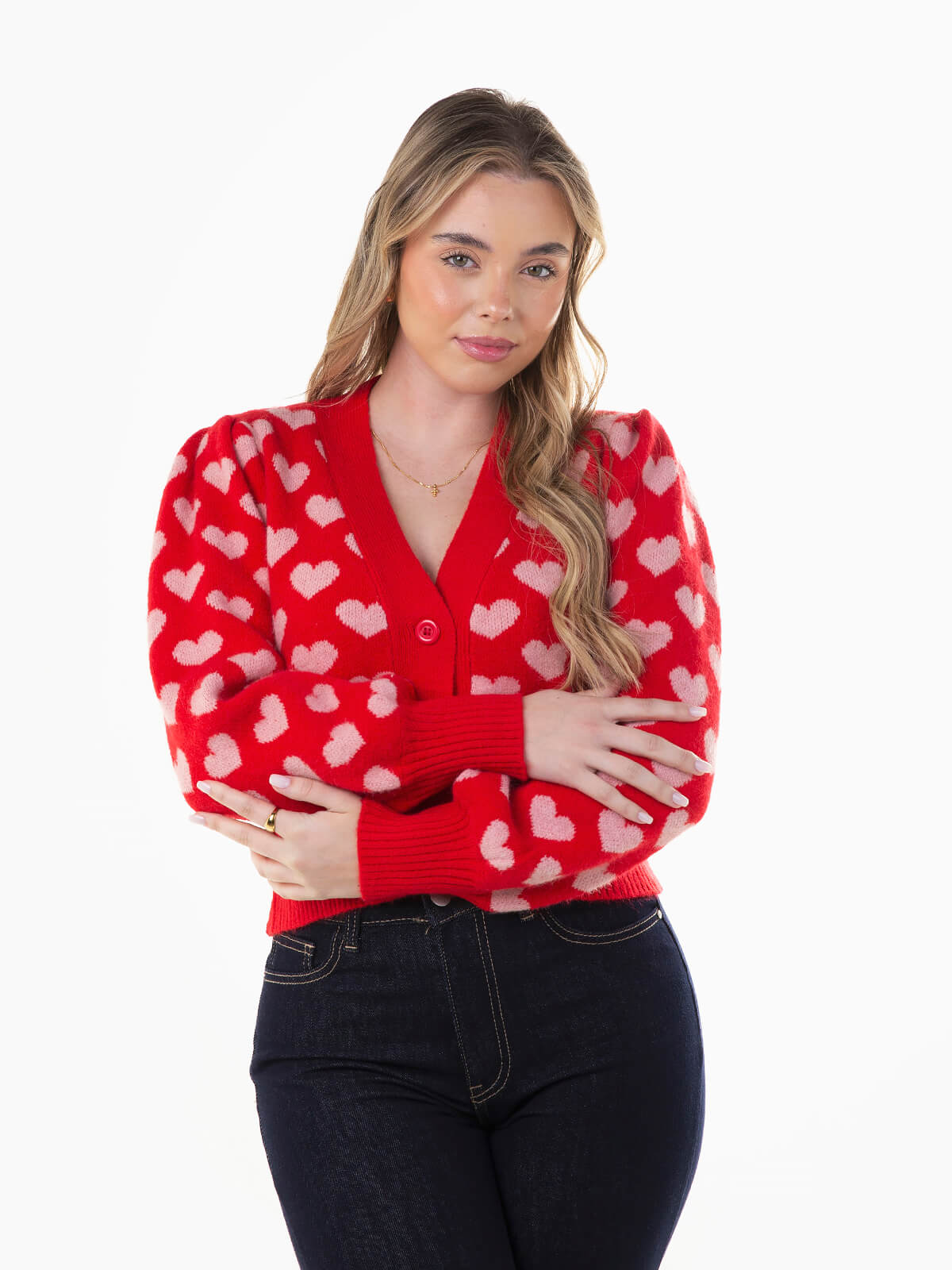 Casaco curto de malha com corações em contraste. Cardigan manga comprida com pormenor de pregas nos ombros. Decote em V e extremidades caneladas. Aperto frontal de botões.