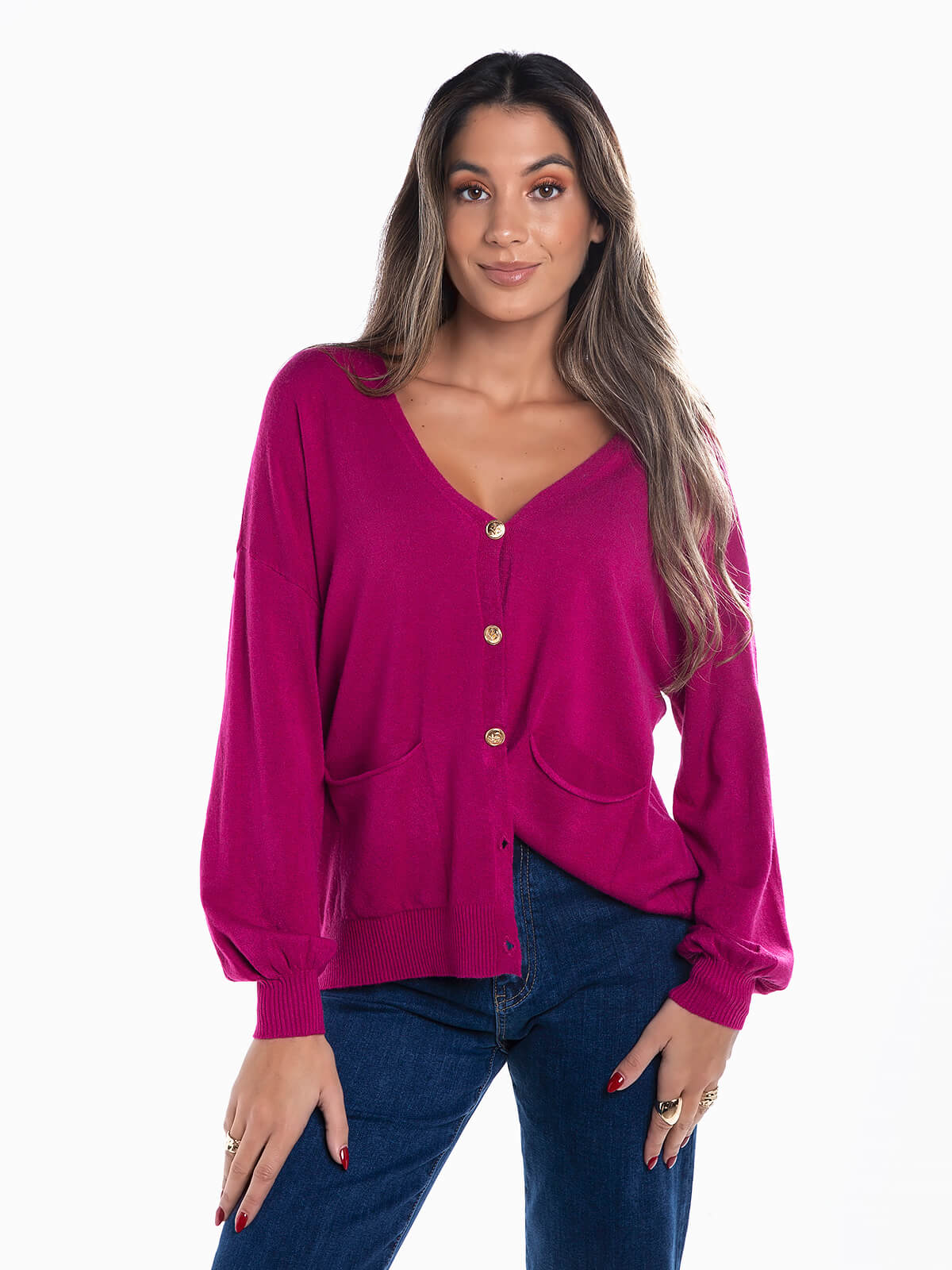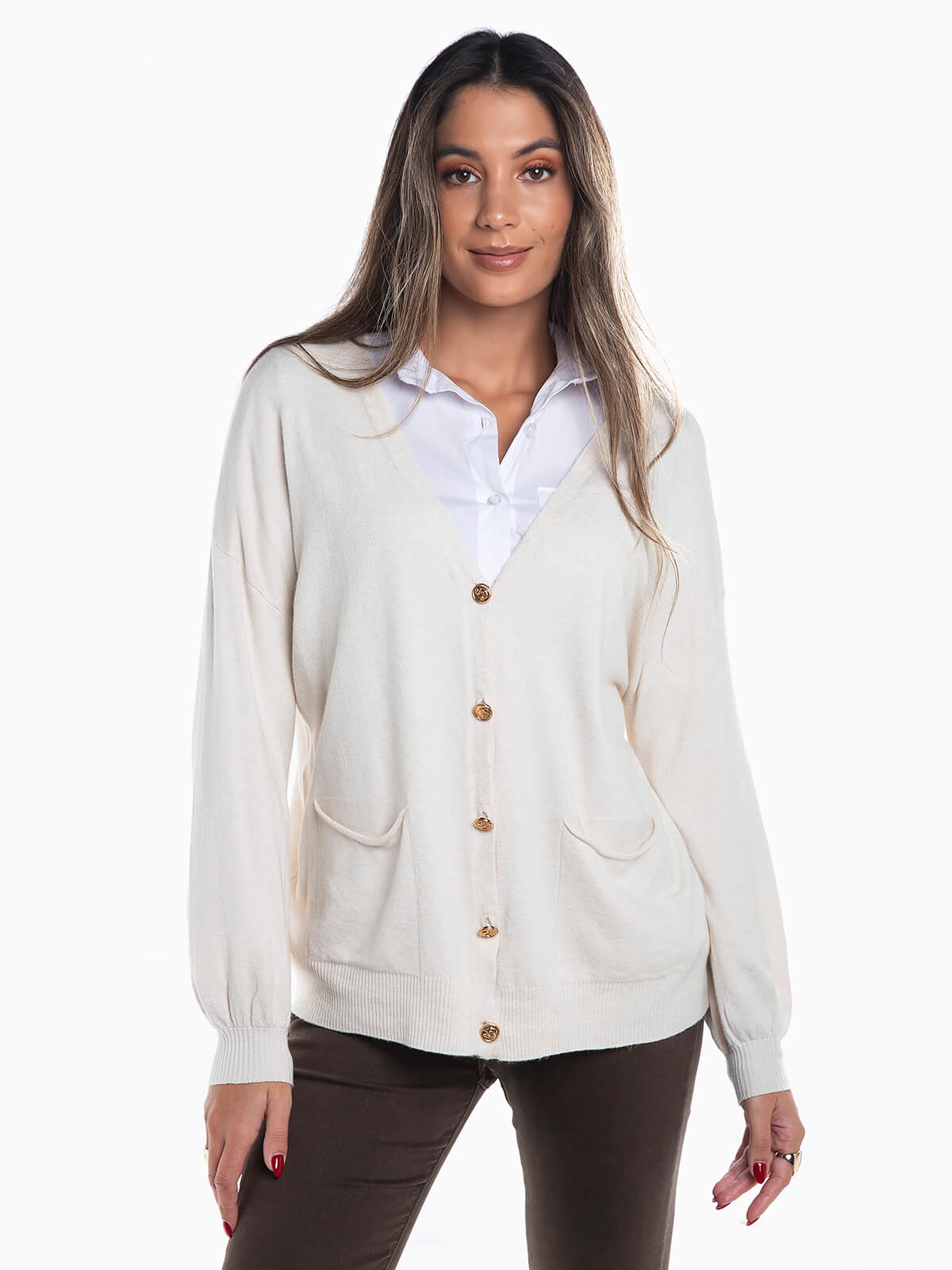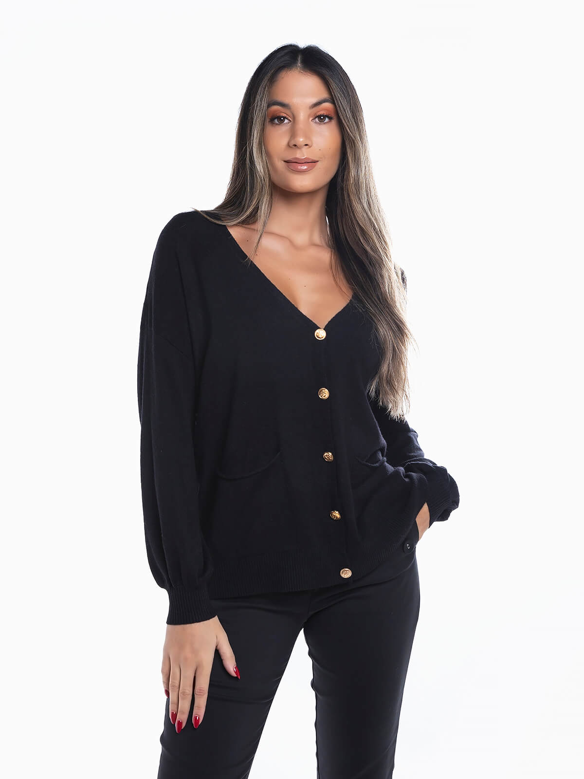 Casaco malha com decote em V e aperto de botões dourados. Casaco manga comprida com 2 bolsos à frente.