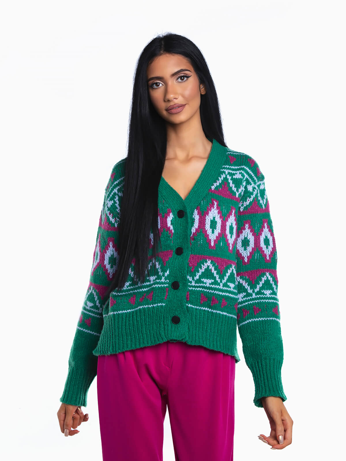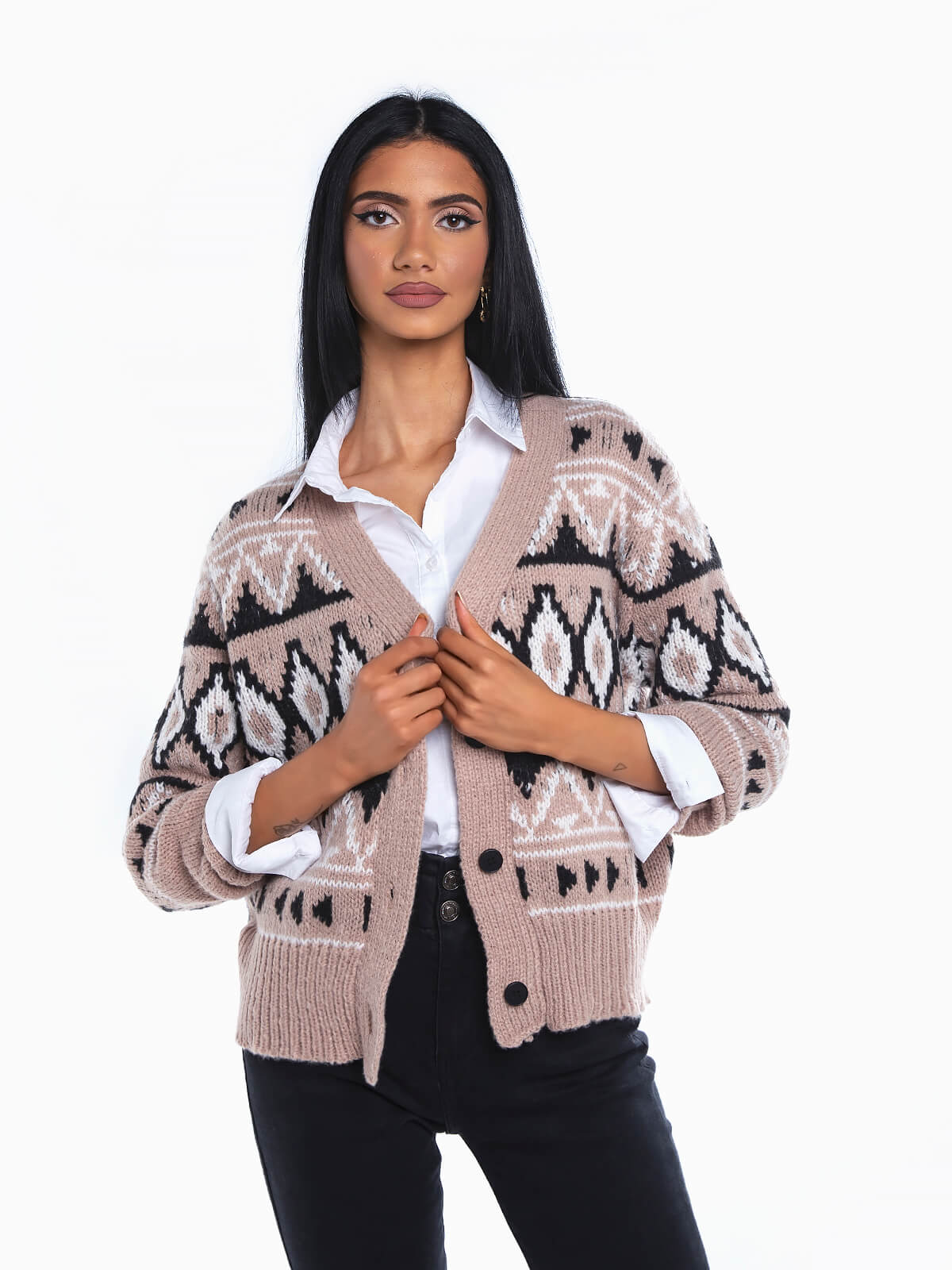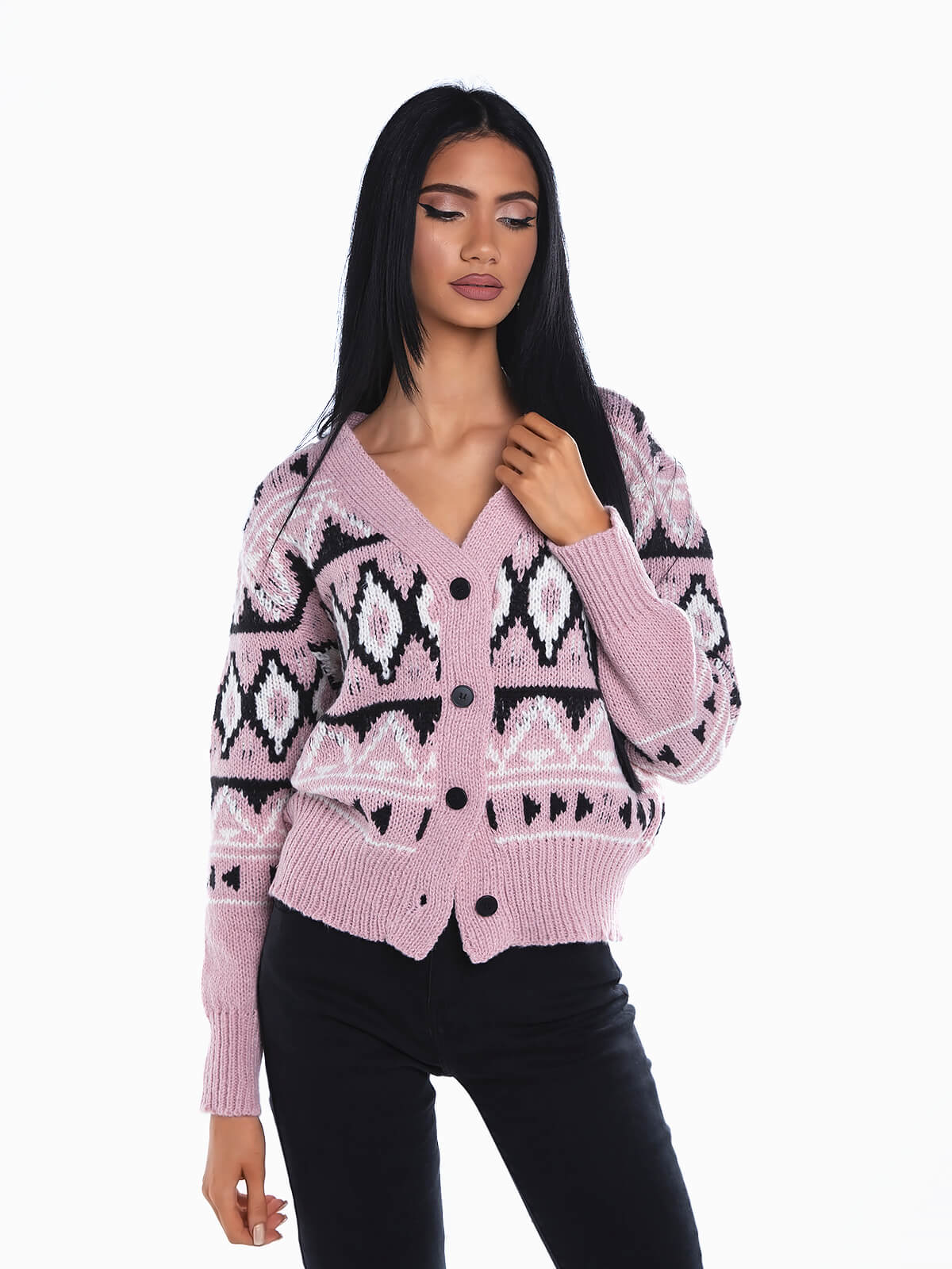 Casaco de malha com estampado étnico. Cardigan manga comprida com ombros descaídos. Decote em V. Acabamentos canelados. Aperto de botões.