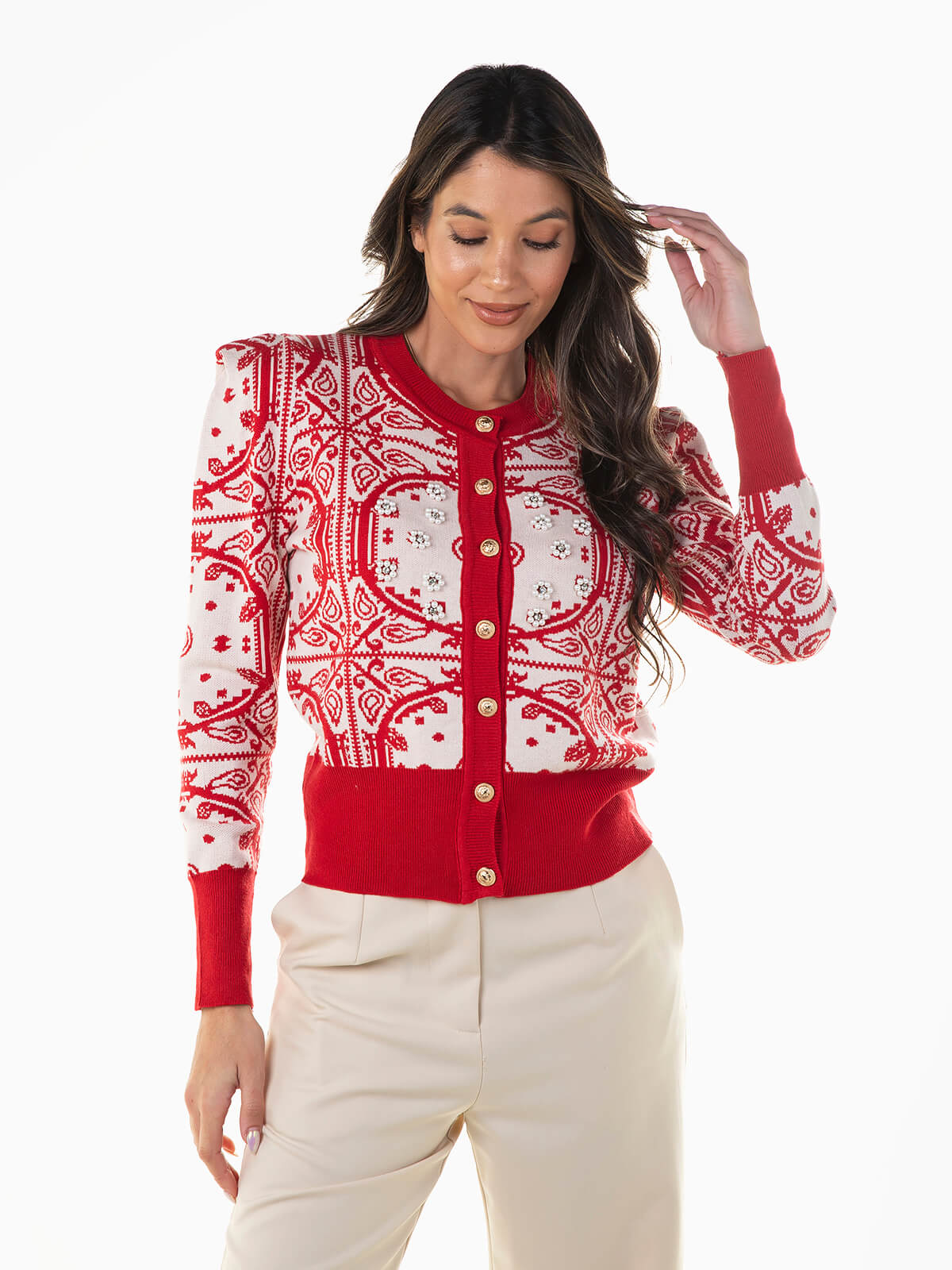 Casaco de malha jacquard com aplicações de pérolas e brilhantes. Camisola de manga comprida com acabamentos canelados. Decote redondo.