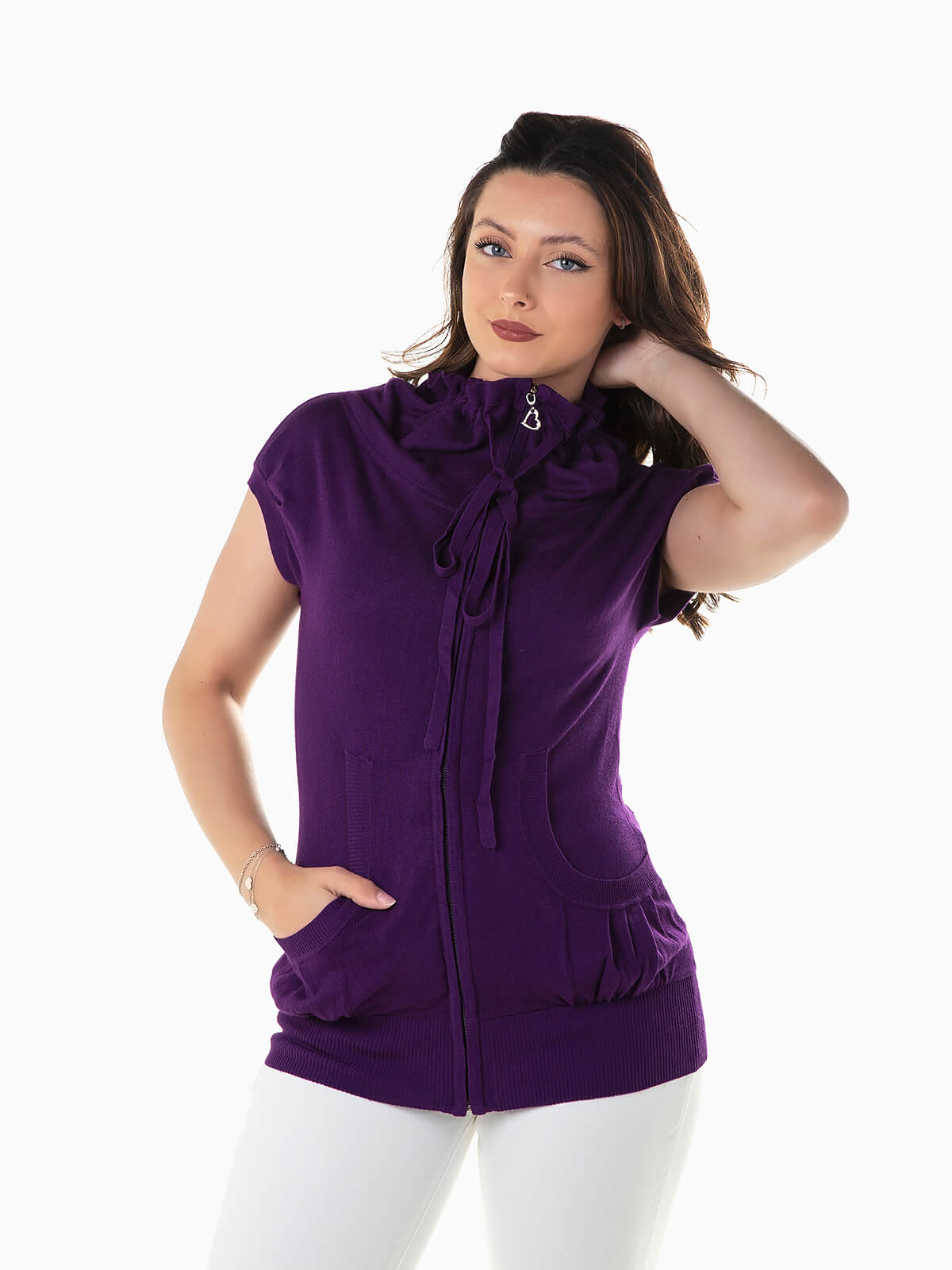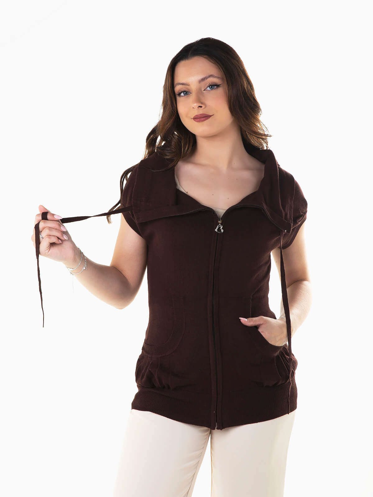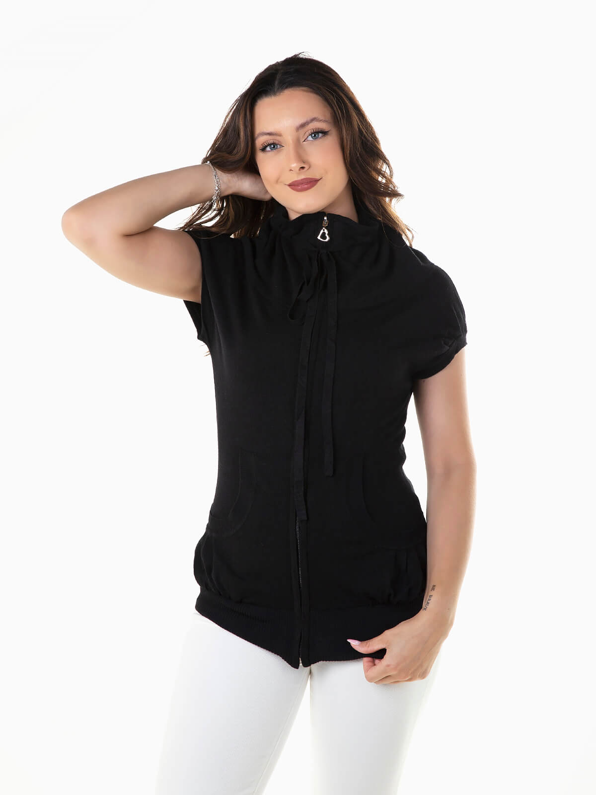 Casaco de malha com manga curta e dois bolsos. Casaco confortável com extremidades caneladas. Gola alta versátil com cordão para ajustar e possibilidade de dobra. Aperto fecho zíper.
