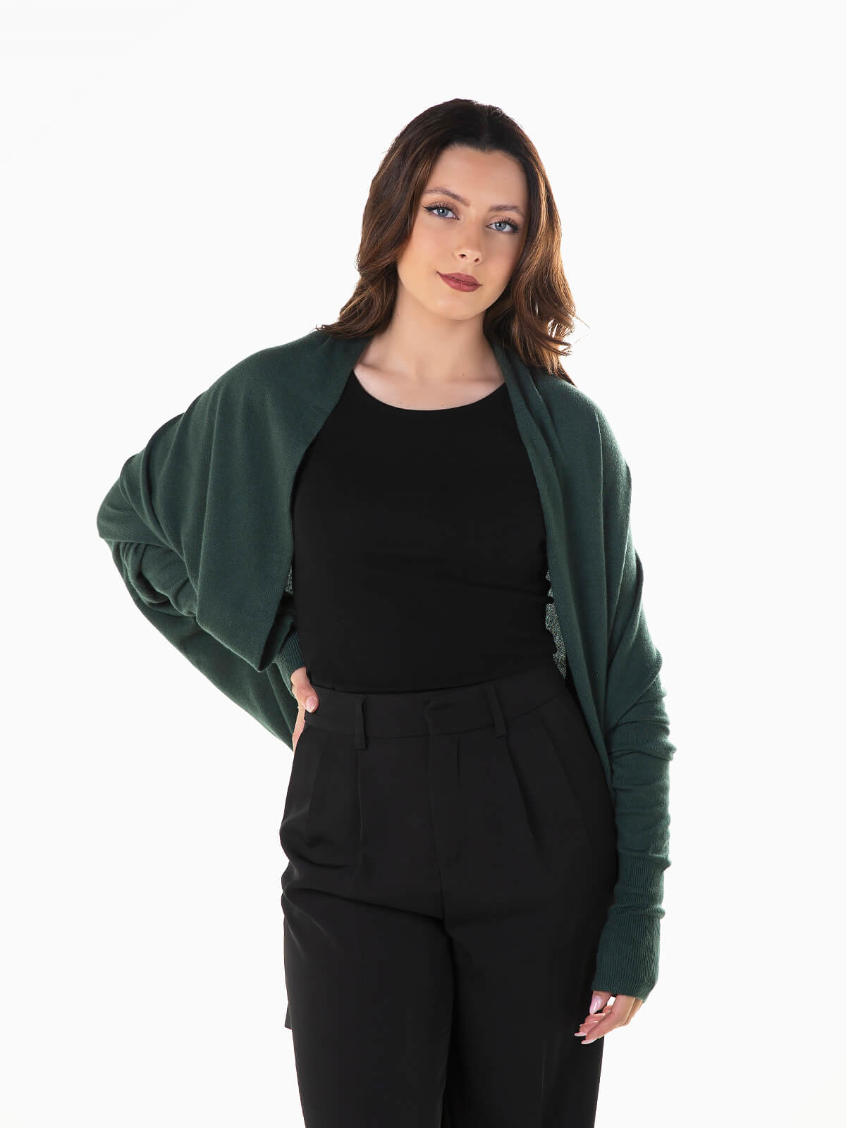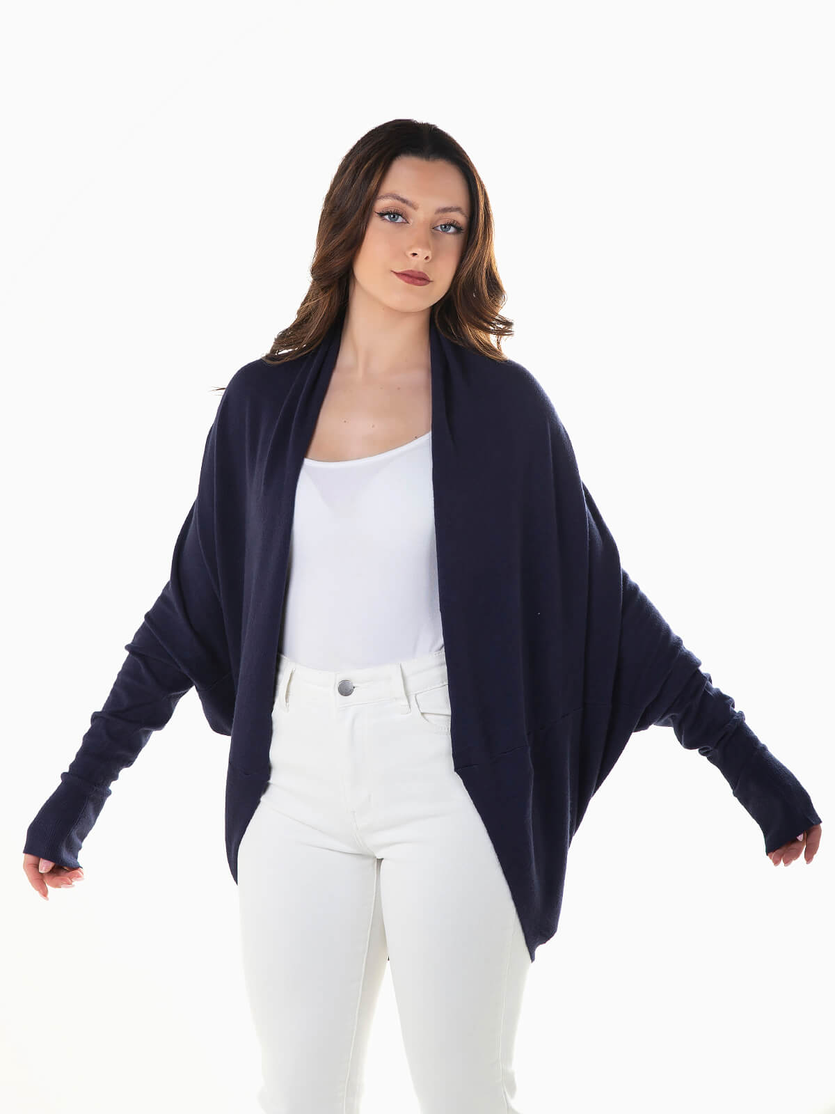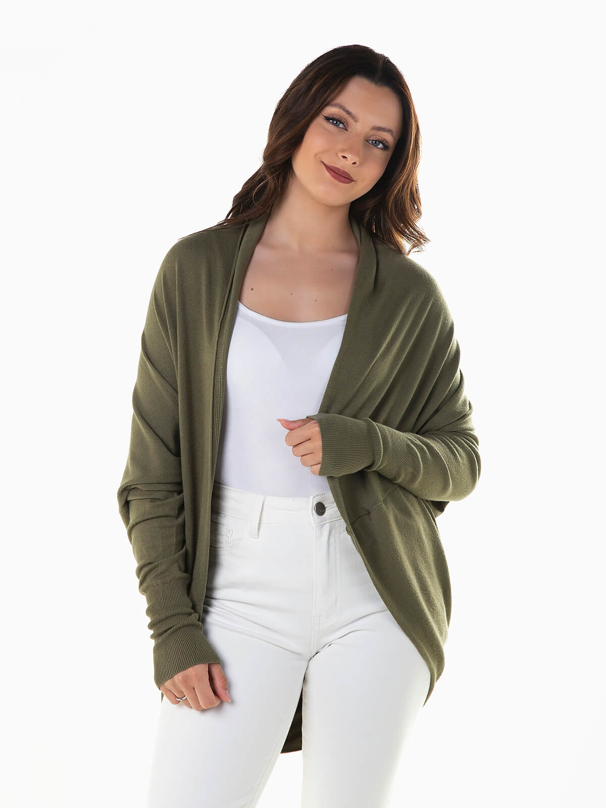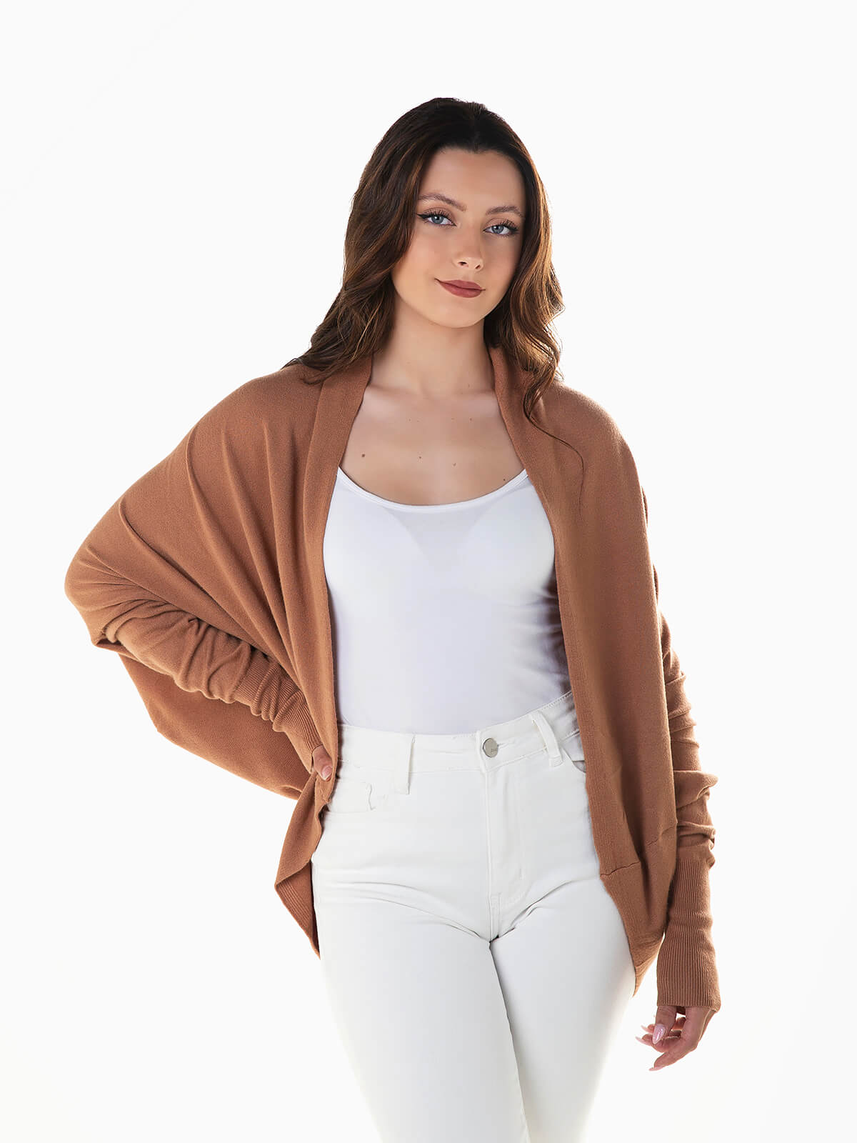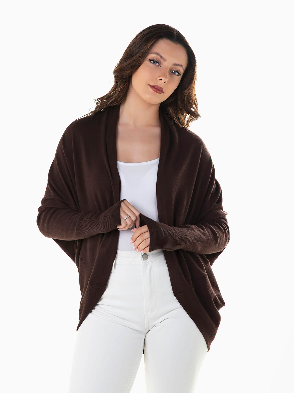 Casaco de malha aberto com manga morcego para senhora. Cardigan largo confeccionado em tecido mistura viscose para maior conforto. Punhos canelados.