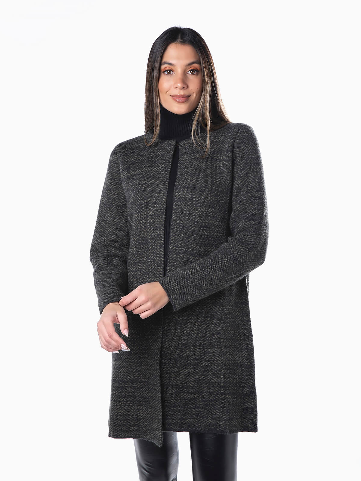 Casaco malha mesclada com mistura de lã para maior conforto térmico. Casaco comprido manga comprida com decote redondo e aperto de colchete.