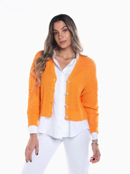 Casaco de malha mesclada com decote em V para senhora. Cardigan com ombros descaídos. Manga comprida. Extremidades caneladas. Aperto de botões.