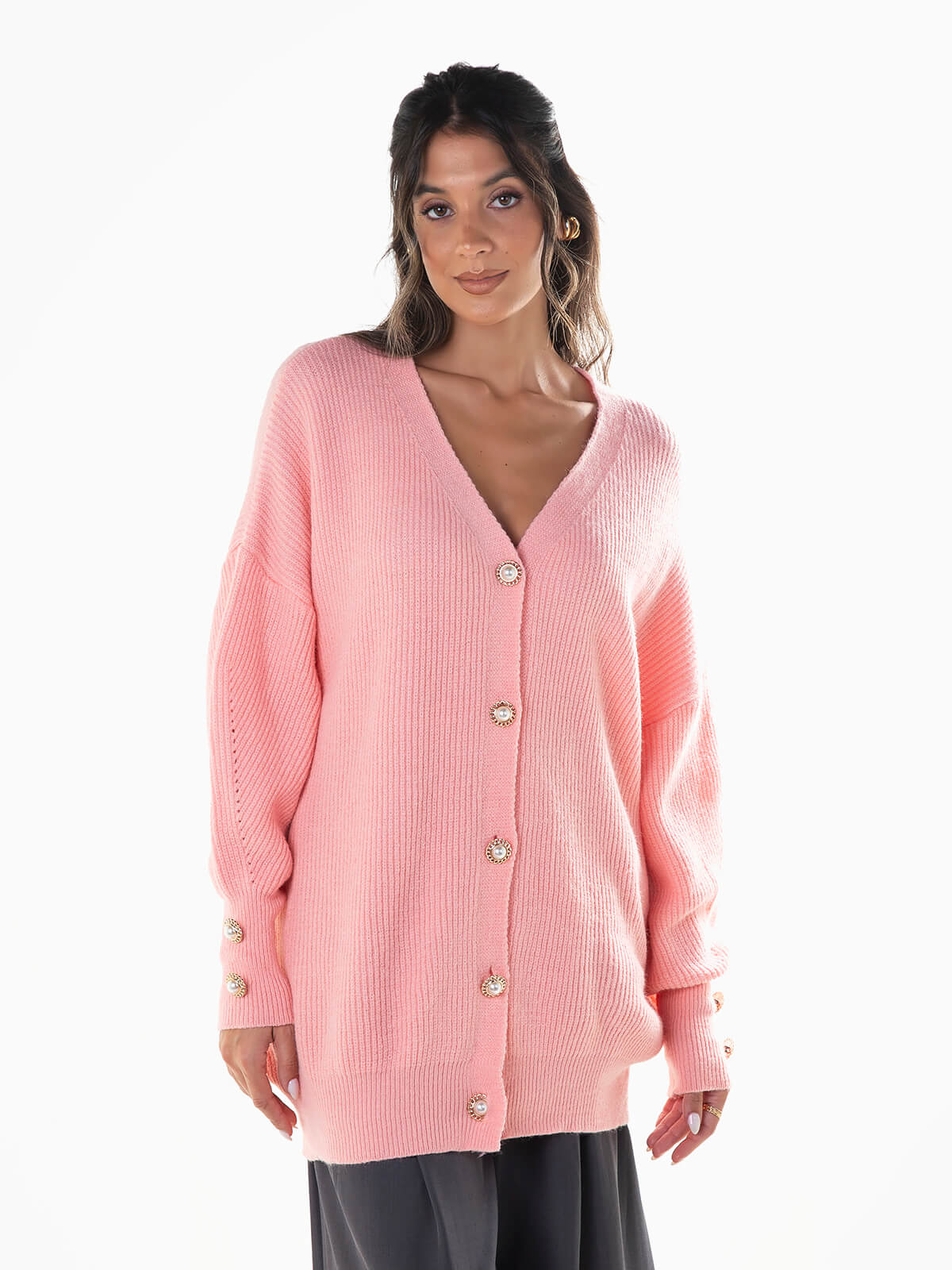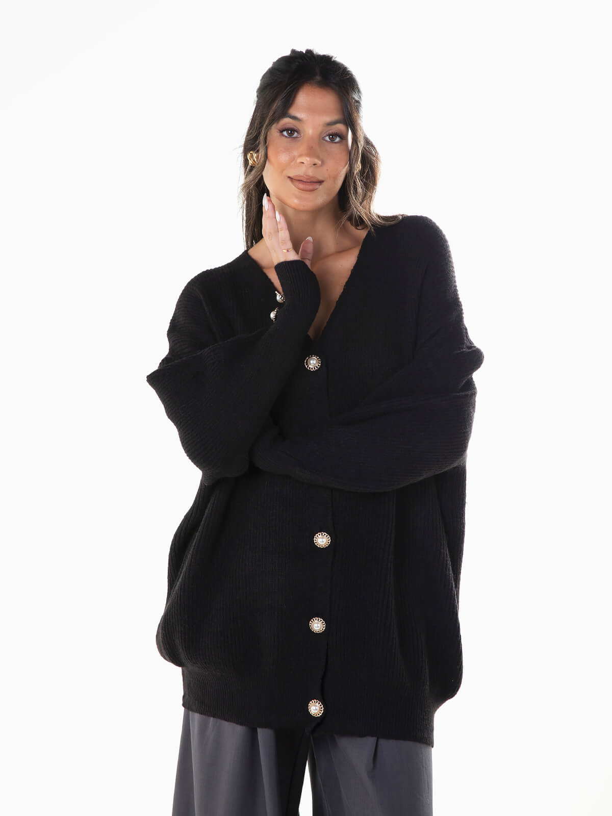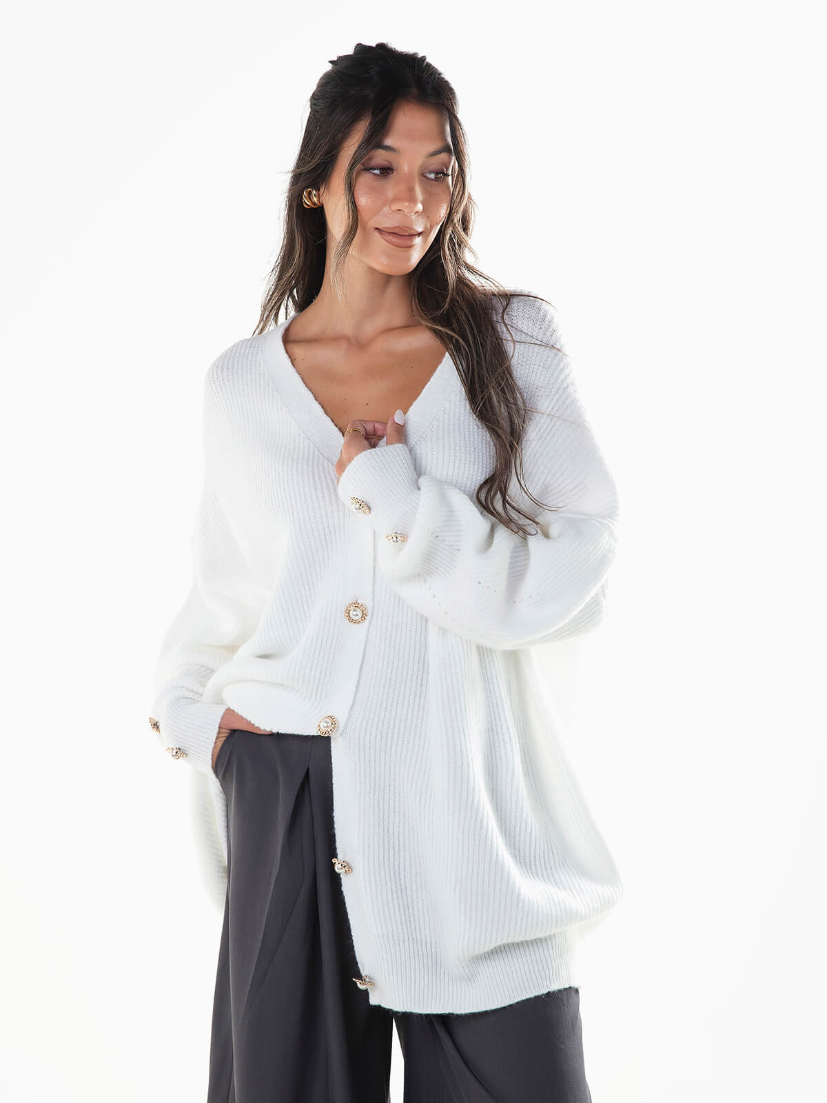 Casaco oversize em malha de toque suave para senhora. Cardigan manga comprida com punhos abotoados e decote em V. Aperto de botões de pérolas.